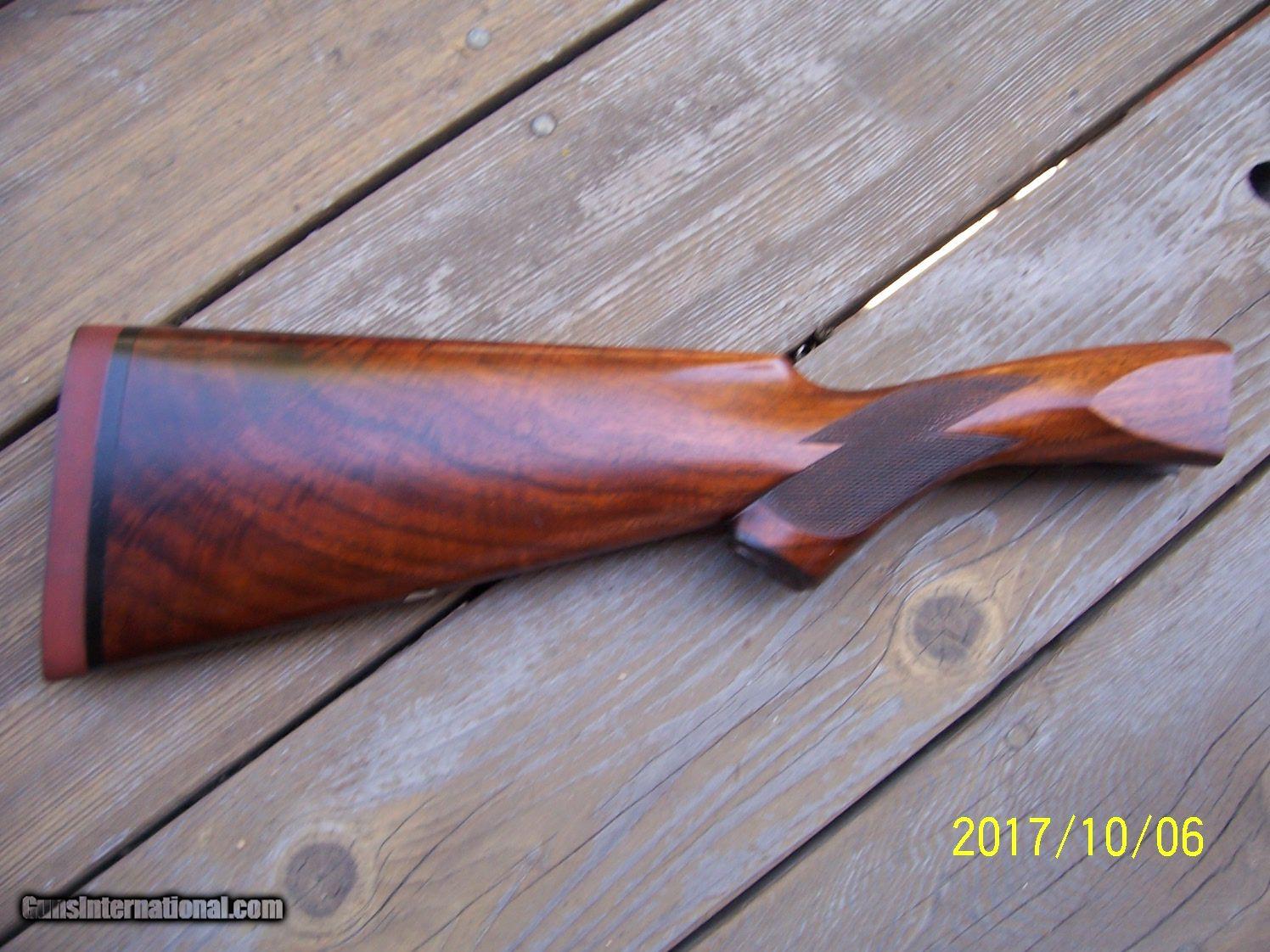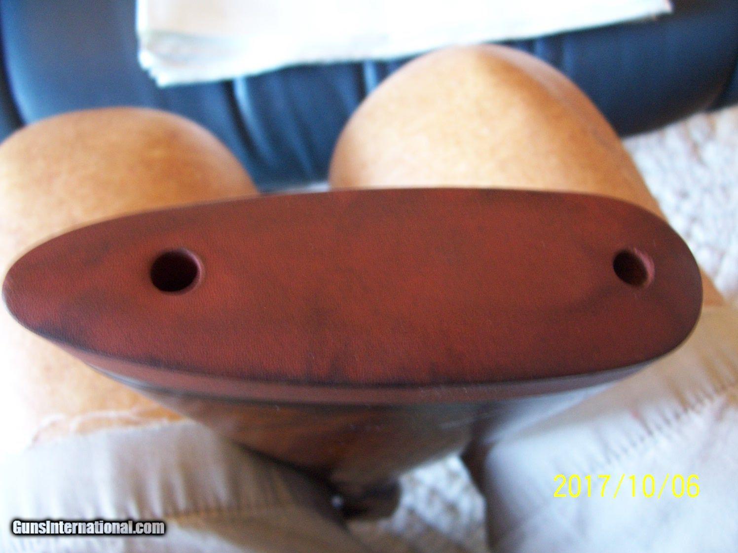 Description: Parker 20ga (0 frame) V grade stock cut for single trigger. It is a beautiful stock of deep red color with dark streaks and fiddleback figure. The serial number cannot be read but it appears to be from teens or 20s. It has the cut for the plunger type top lever coil spring introduced in 1906. Overall length of the wood in 14 ¾” + a ¾” silver pad for LOP = 14 ½”. The checkering and finish are almost flawless. The grip cap is perfect with deep blue screw. SOLD |