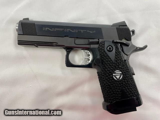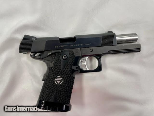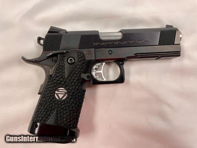 Description: Guns Listing ID: 823994 Why wait for a year for a custom SVI Infinity when you can get this one! Comes with 5 mags and mag pouch. SVI, where true custom is born! Caliber: 40 S&W Gun Type: Commander 4.3\" barrel Barrel Style: Non-bushing style Frame Style: Competition Frame Material: Blued Steel Dust Cover: Infinity Extended Dust Cover Slide Material: Blued Steel ITI Rail Cut: Rail Cut Slide Profile: Round Top Front Site: Green Tritius dot, .110 wide Rear Site: Heinie SlantPro Guide Rod: Stainless Steel Slide Lock Pin: Steel 4140 Thumb safety: Carbon Steel Grip Safety: Steel Grip: Compact, Right Handed Mag Well: Blued Steel Grip Surface/Finish: Alfaro Stipple (competition) Magazine Catch: Steel, 6-32 tap Mainspring Housing: Polymer, Flat Hammer: Round, S7 Tool Steel Thumb Safety Style: Ambidexterous Tactical Strut: Titanium Triglide System: Yes Trigger Bow: Titanium Insert Color: Silver Base Color: Silver Insert style: Curved Long SOLD Manufacturer: STRAYER-VOIGT, INC. Model: Infinity Caliber Info: 40 SW Condition: Used - Non-Certified Barrels: 4.3 BARREL Finish: BLACK |