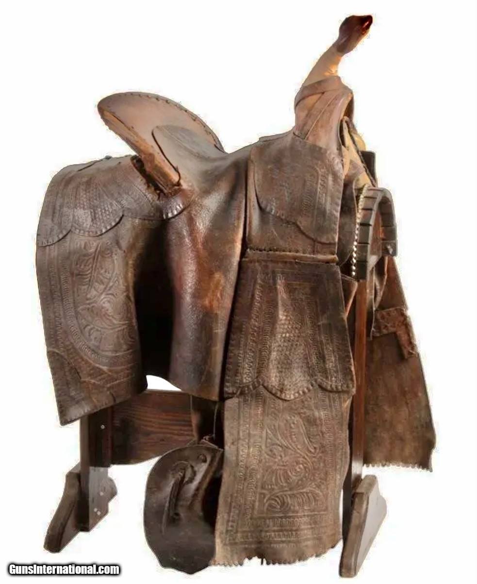 Description: This is the kind of saddle used during the battle at the ALAMO. Rawhide covered wooden tree with 16.75" seat and 17.75" wide cantle. Long 9.5" leather-wrapped horn with 4.5" head inset with white metal Mexican eagle with "REPUBLICA MEXICANA EJERCITO NATIONALE". Wooden stirrups with tooled tapaderos adorned with leacher conchos. Integral pad with hair batting. Fitted with elaborately tooled leather mohilla. **Very good condition overall Historic saddle. SOLD Antique: Yes |