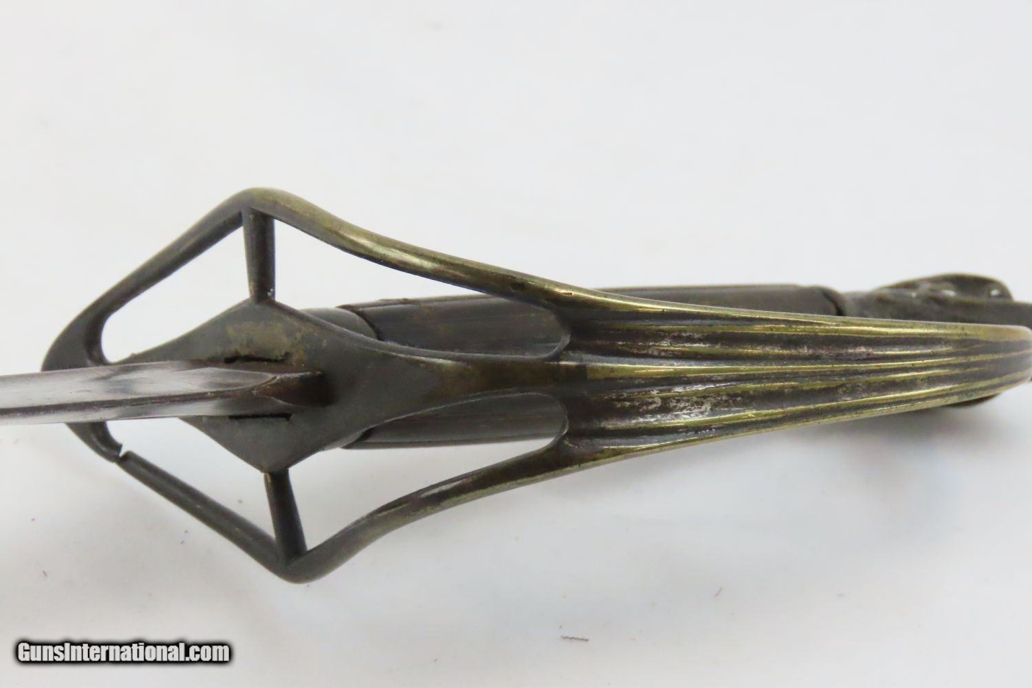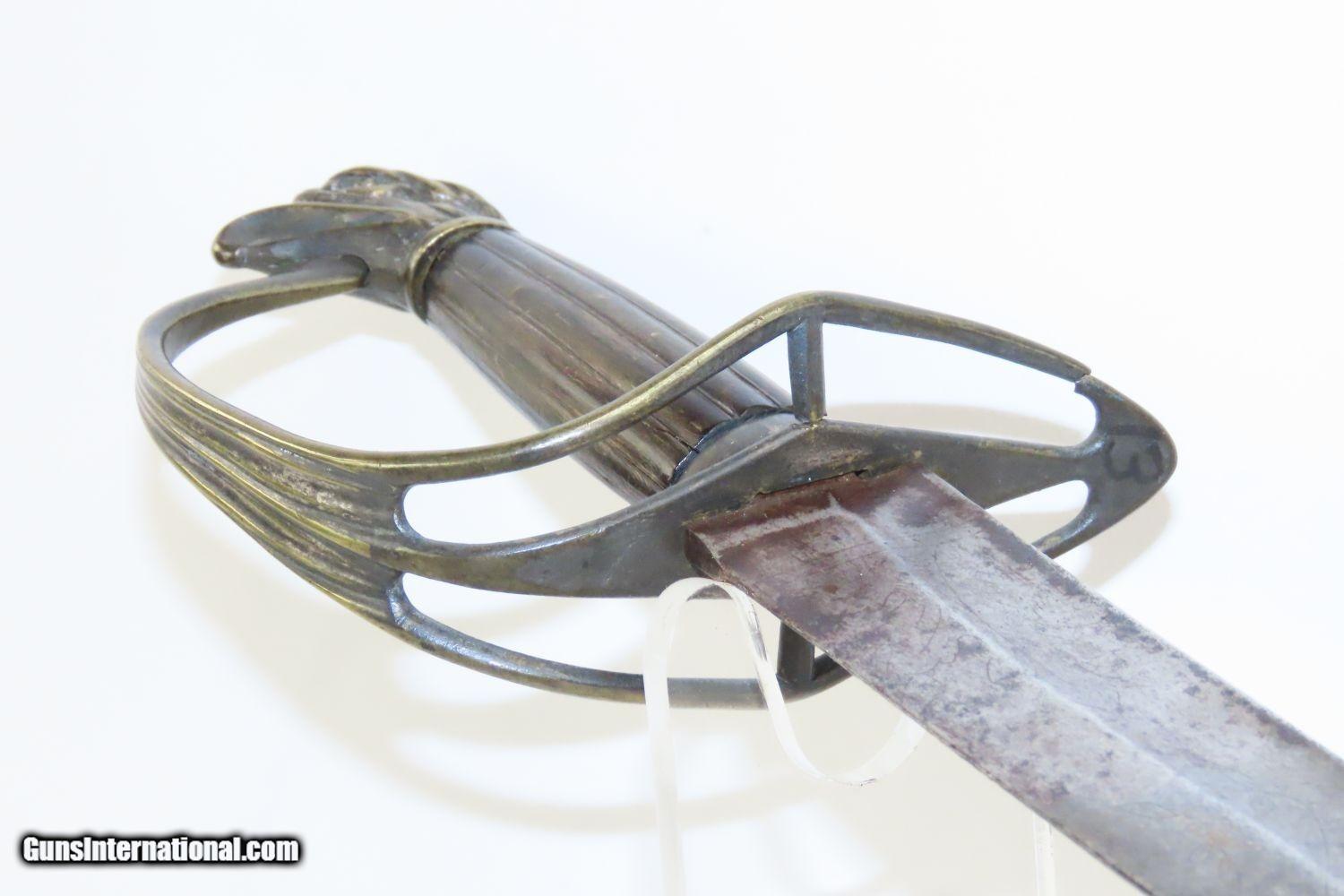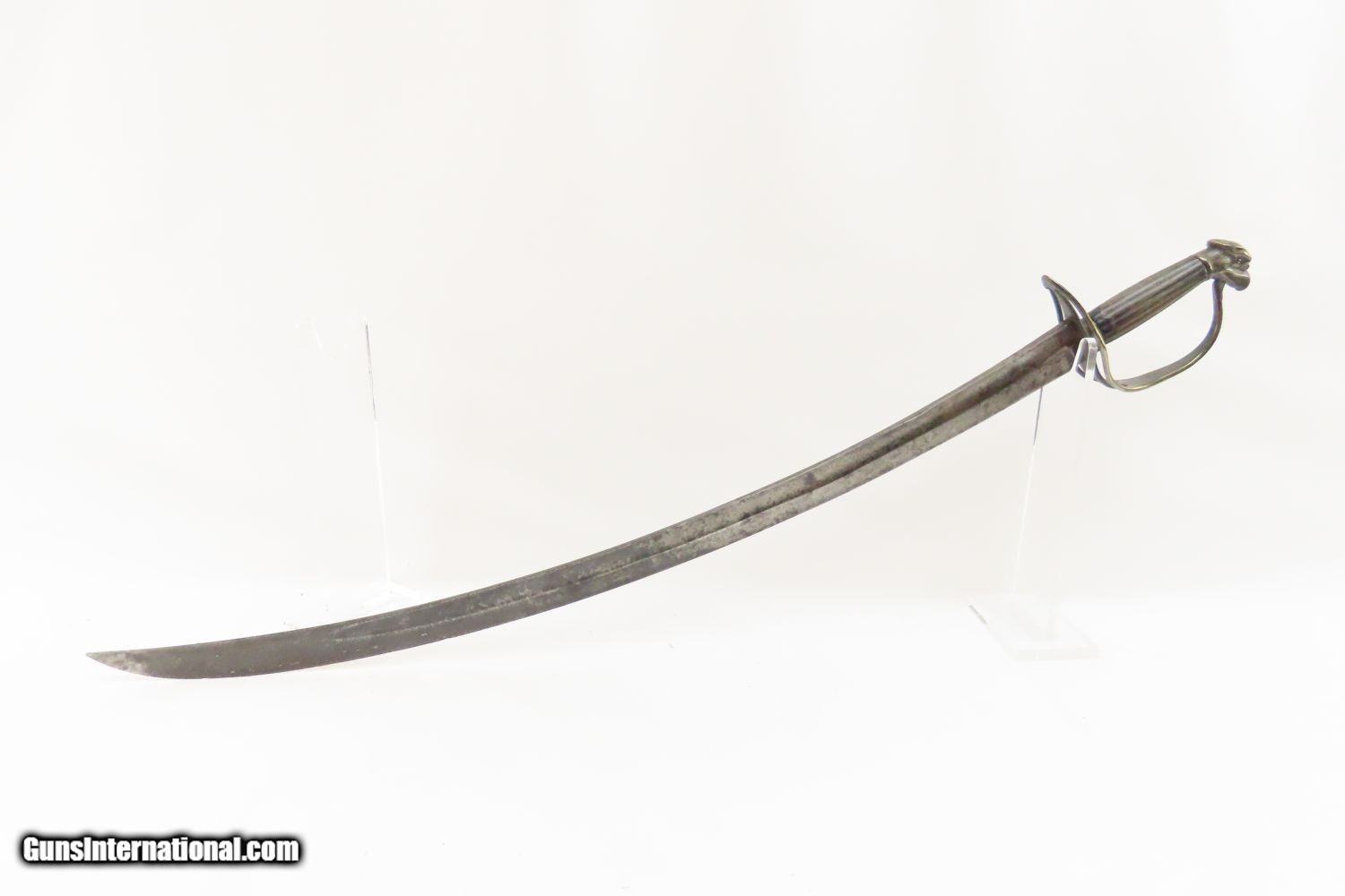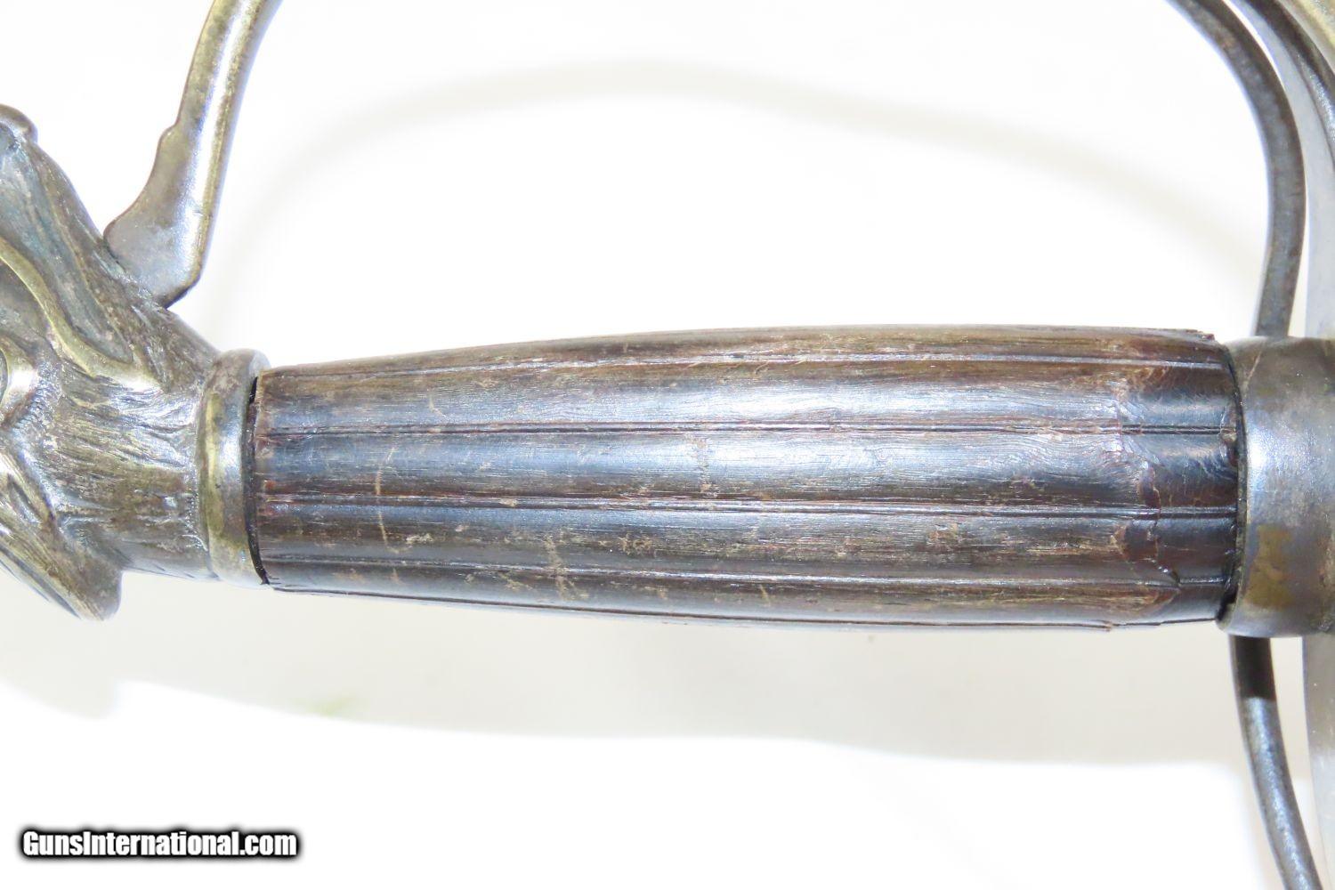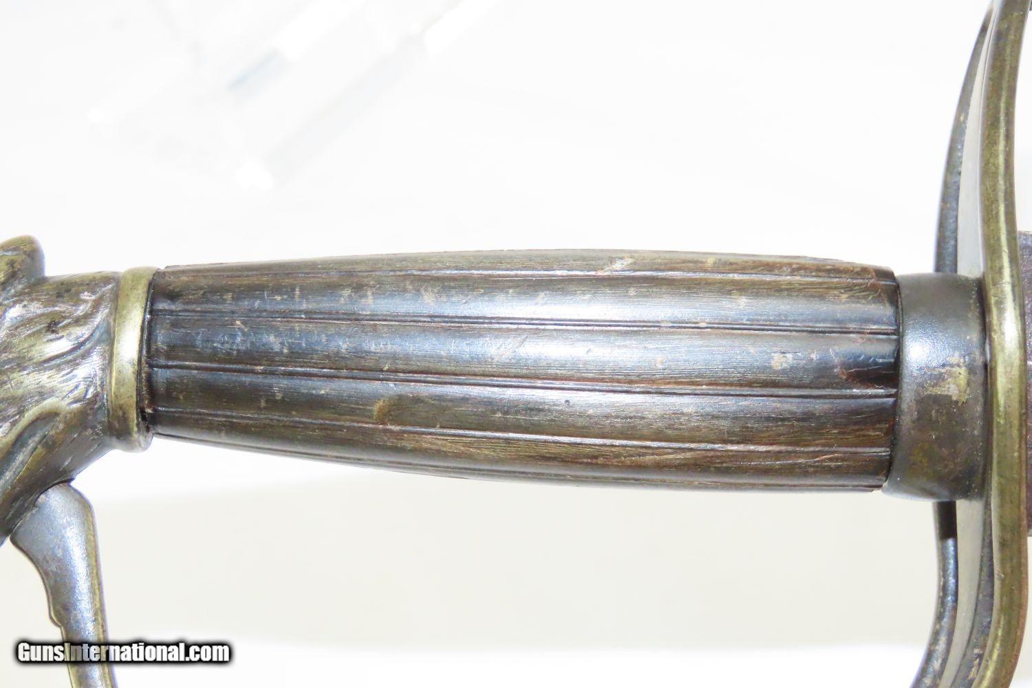 Description: AMERICAN EAGLE SWORD 1820s Antique Patriotic Infantry Officer’s Sidearm Antebellum Indian Wars Period Here we present an antique American Eagle Infantry Officer’s Sword, manufactured circa the 1820s. The ‘Eagle Head” sword was popularized during the American Revolutionary War and was one of the signature weapons of the young United States through the War of 1812 and into the 1830s. This sword features a 28” curved blade and an overall length of 34 inches. It features gold accented etching, silver plated hilt, ribbed horn grip, and “13” in marker on the suspension band of the sheath. There is a mix of dark brown/gray patina, pitting, and lighter gray patina on the blade along with some edge wear, dark aged patina and traces of silver on the hilt, and mild wear on the grip. The overall condition is good. There is a break in the connection of the handguard. The blade is in good shape. The leather scabbard is sound. The throat of the scabbard is absent. Own the original! This is a legitimate antique and not a reproduction. Overall condition as seen in photos. Very Fast. Very Safe. FREE SHIPPING WORLDWIDE. Delivered directly to your door by express mail! Guaranteed AUTHENTIC & Includes CERTIFICATE OF AUTHENTICITY. ancestryguns $1195 #200836 SOLD Antique: Yes |