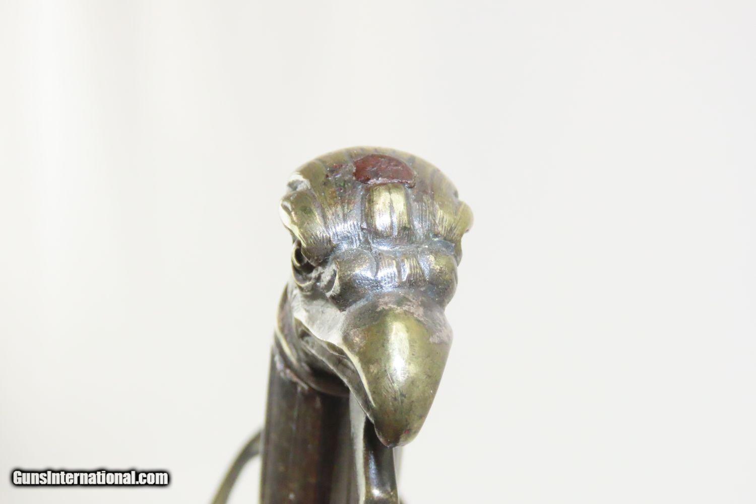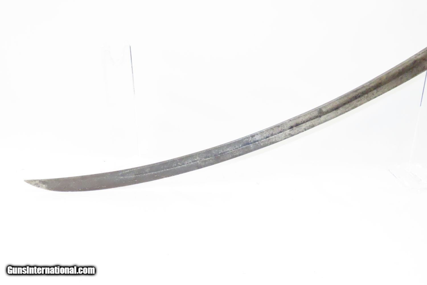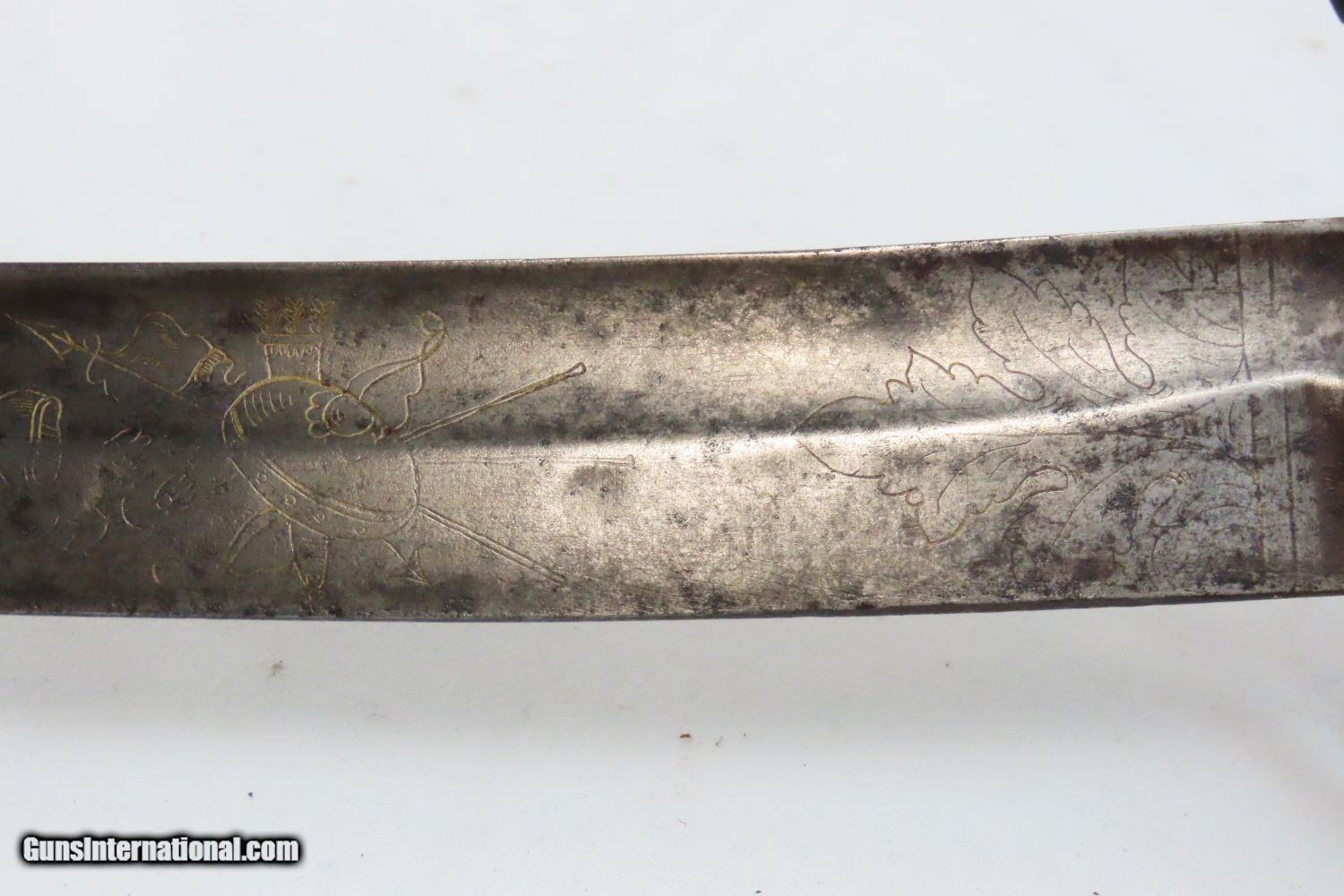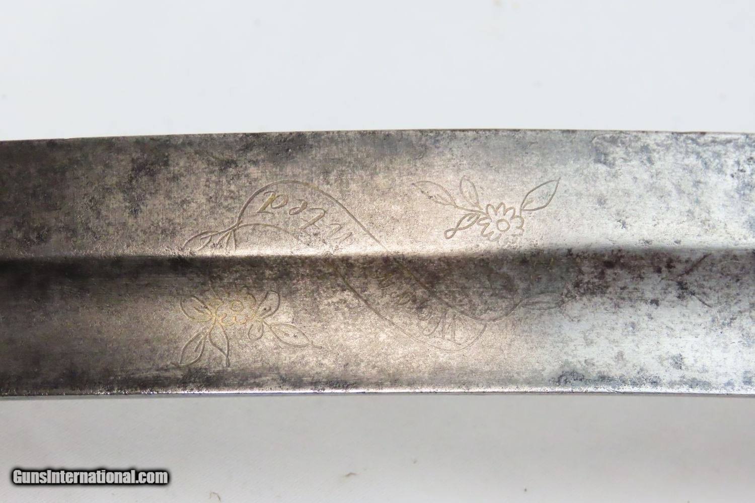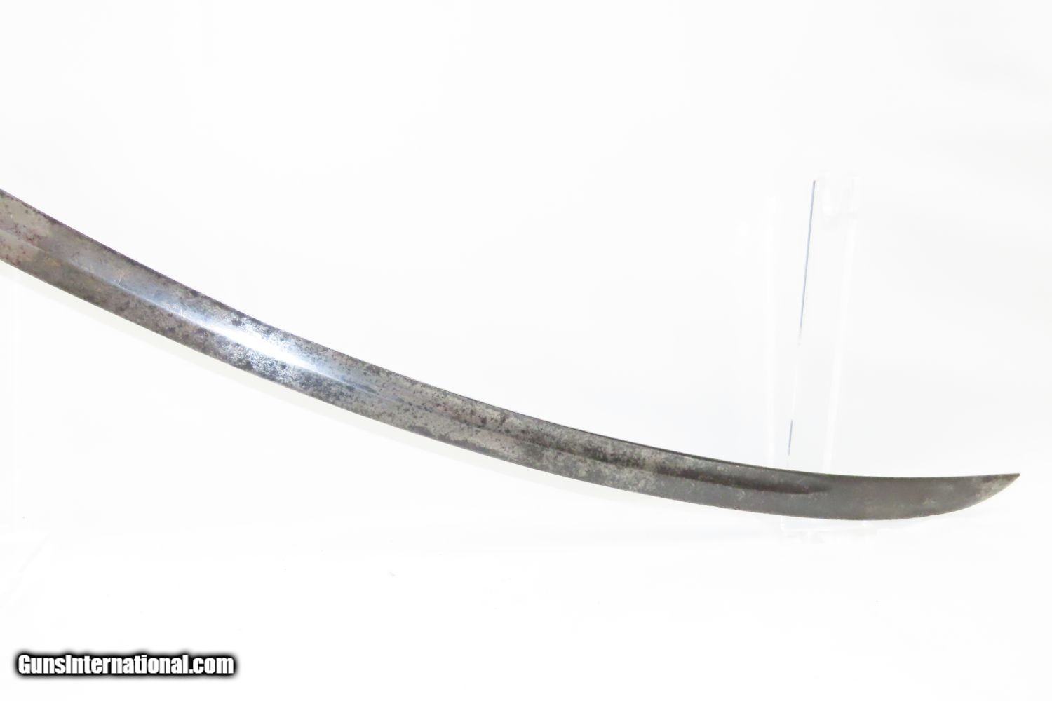 Description: AMERICAN EAGLE SWORD 1820s Antique Patriotic Infantry Officer’s Sidearm Antebellum Indian Wars Period Here we present an antique American Eagle Infantry Officer’s Sword, manufactured circa the 1820s. The ‘Eagle Head” sword was popularized during the American Revolutionary War and was one of the signature weapons of the young United States through the War of 1812 and into the 1830s. This sword features a 28” curved blade and an overall length of 34 inches. It features gold accented etching, silver plated hilt, ribbed horn grip, and “13” in marker on the suspension band of the sheath. There is a mix of dark brown/gray patina, pitting, and lighter gray patina on the blade along with some edge wear, dark aged patina and traces of silver on the hilt, and mild wear on the grip. The overall condition is good. There is a break in the connection of the handguard. The blade is in good shape. The leather scabbard is sound. The throat of the scabbard is absent. Own the original! This is a legitimate antique and not a reproduction. Overall condition as seen in photos. Very Fast. Very Safe. FREE SHIPPING WORLDWIDE. Delivered directly to your door by express mail! Guaranteed AUTHENTIC & Includes CERTIFICATE OF AUTHENTICITY. ancestryguns $1195 #200836 SOLD Antique: Yes |