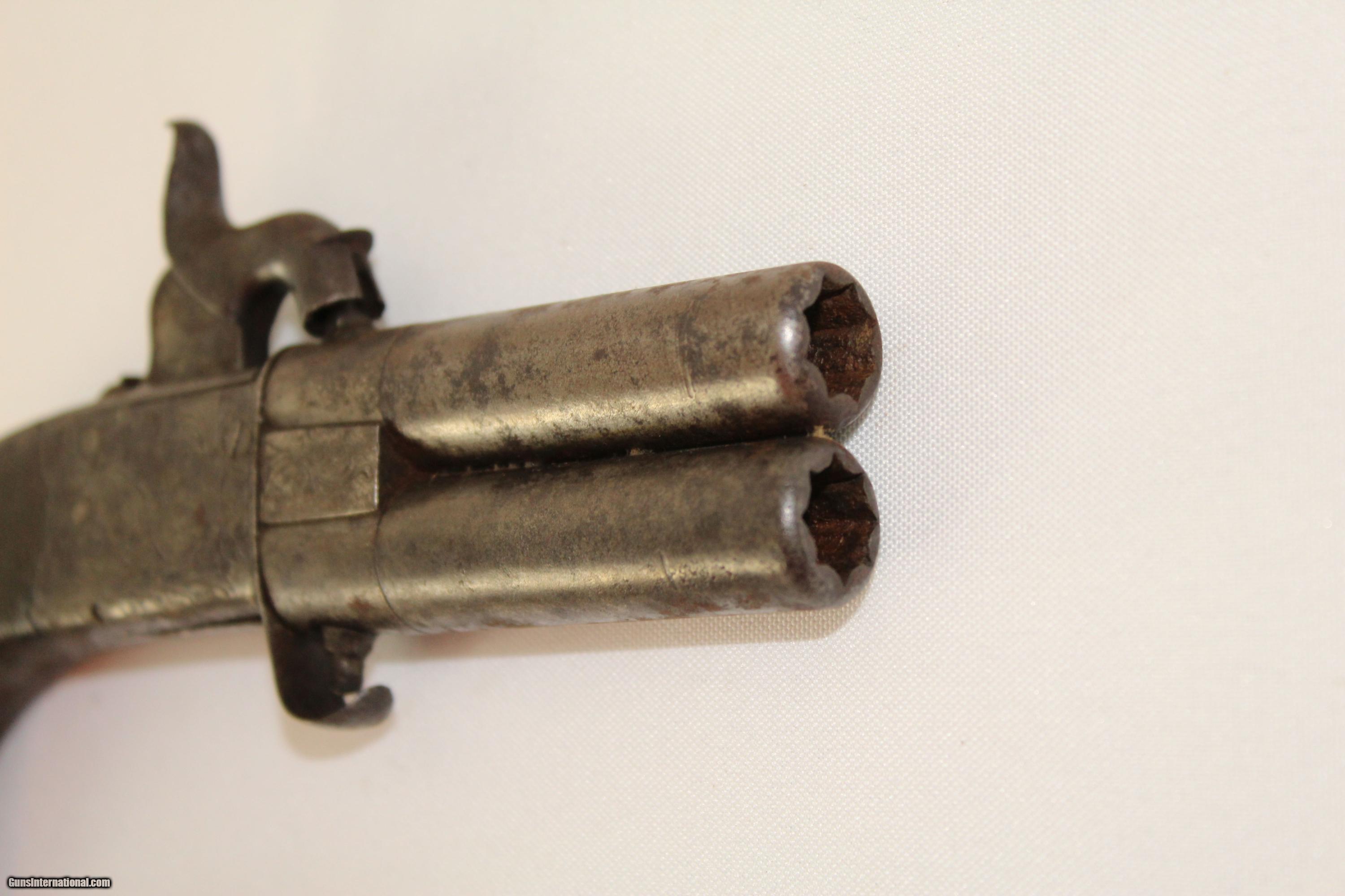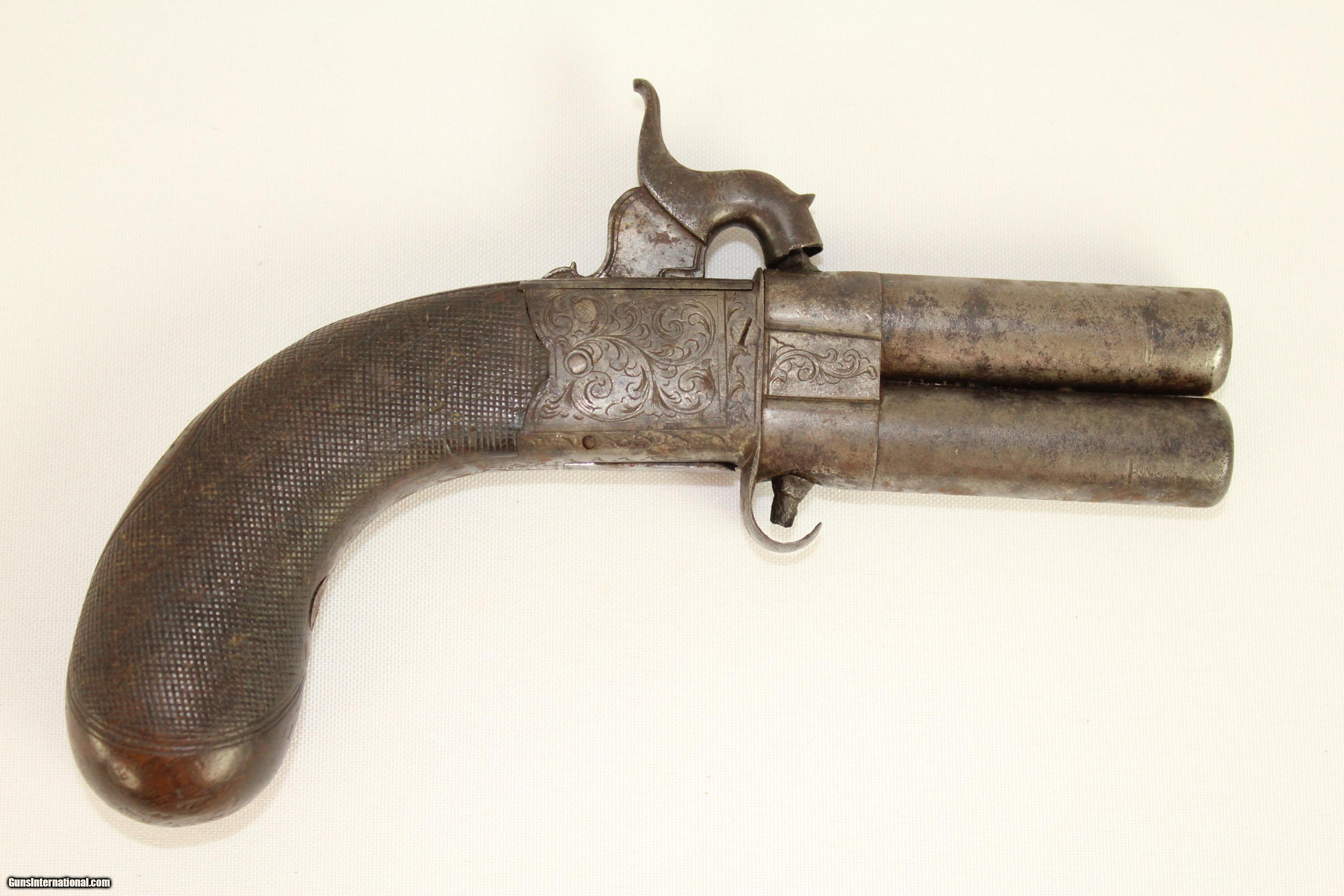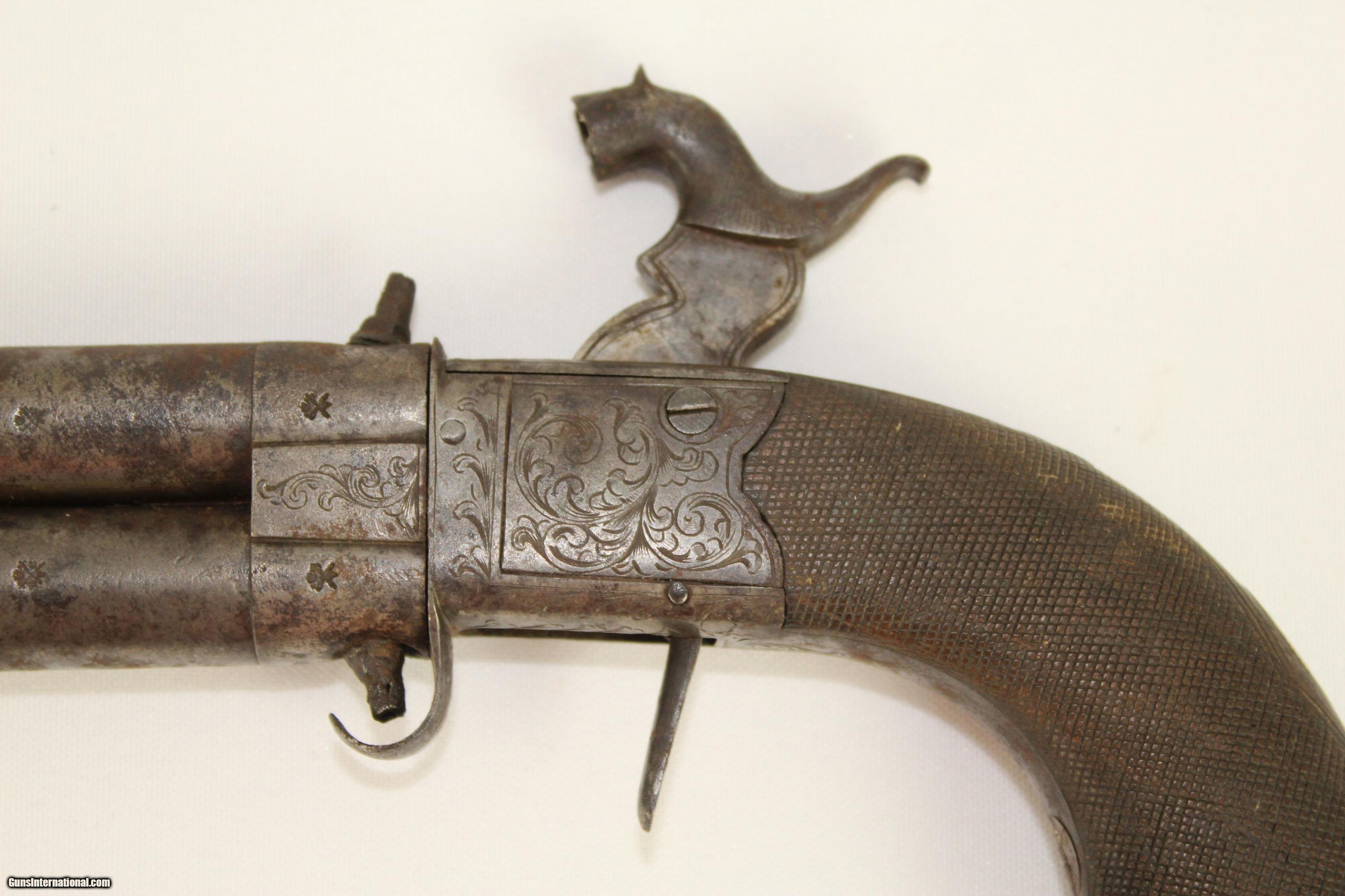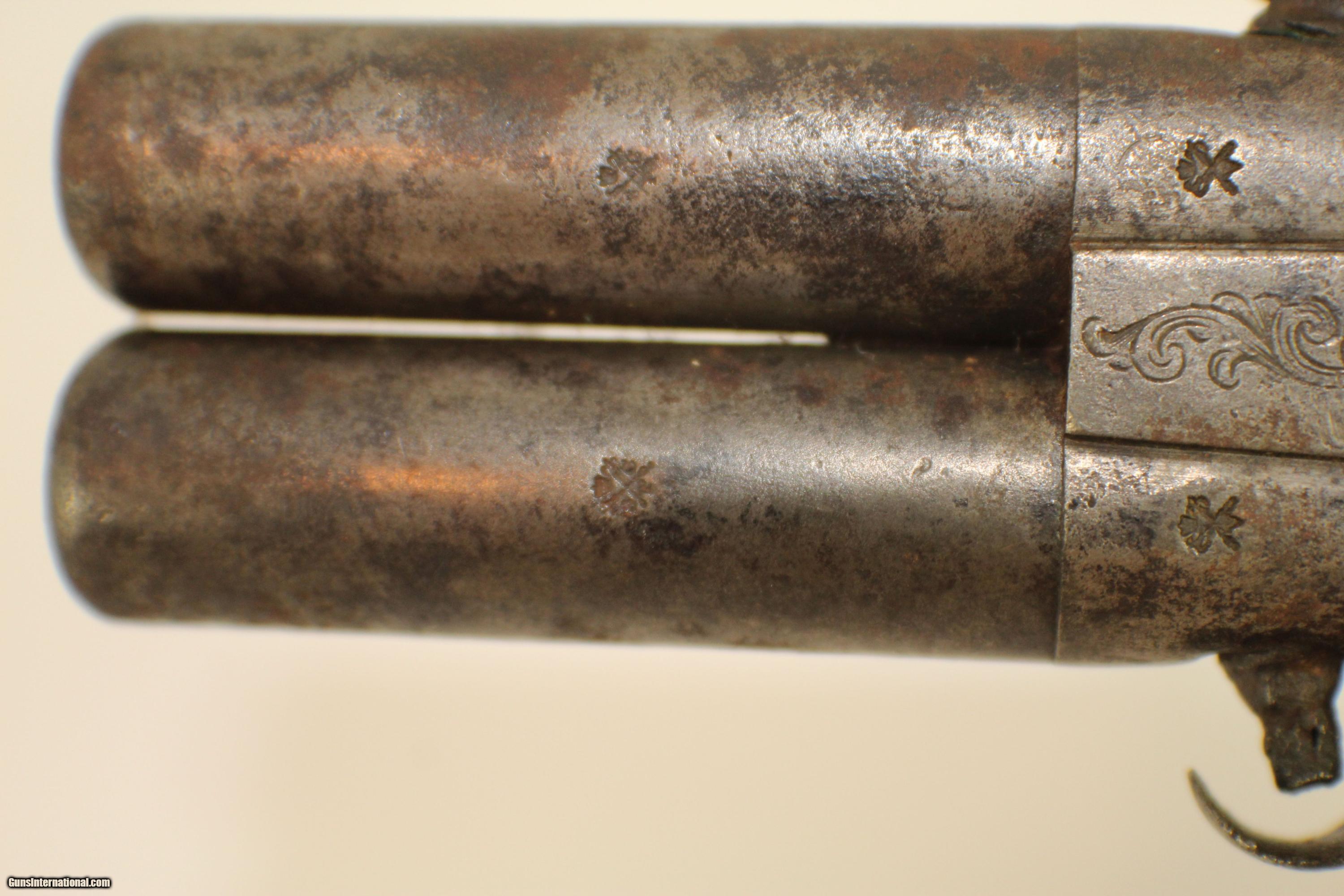 Description: Antique Engraved English Boxlock Swivel Barrel Percussion Pistol Engraved British Self-Defense Pistol Here we present an antique Engraved English Boxlock Swivel Barrel Percussion Pistol, made circa 1850 in England. This is an interesting design for a percussion pistol as it has a double barrel, each with its own nipple, but only one hammer. The barrels swivel for the next shot. The barrels are also of a turn-off variety which was common during this time period. This feature enabled the user to use a larger projectile, which provided a better gas seal than a muzzle loading alternative. The trigger is also of a folding variety, which drops when the hammer is cocked. Overall, this pistol was packed with great carry features for its time, and perhaps surpassed other designs just by virtue of its having two barrels instead of the more common single. Own the original! This is a legitimate antique and not a reproduction. Barrel length is 2 inches. Caliber: .38 percussion Bore is smooth, but has grooves to aid in the turn off of the barrels. All parts are mechanically functional. Overall condition as seen in photos. Put this English self-defense pistol in your diverse collection. Very Fast. Very Safe. FREE SHIPPING WORLDWIDE. Delivered directly to your door by express mail! Guaranteed AUTHENTIC & Includes CERTIFICATE OF AUTHENTICITY. ancestryguns #21343 SOLD Antique: Yes |