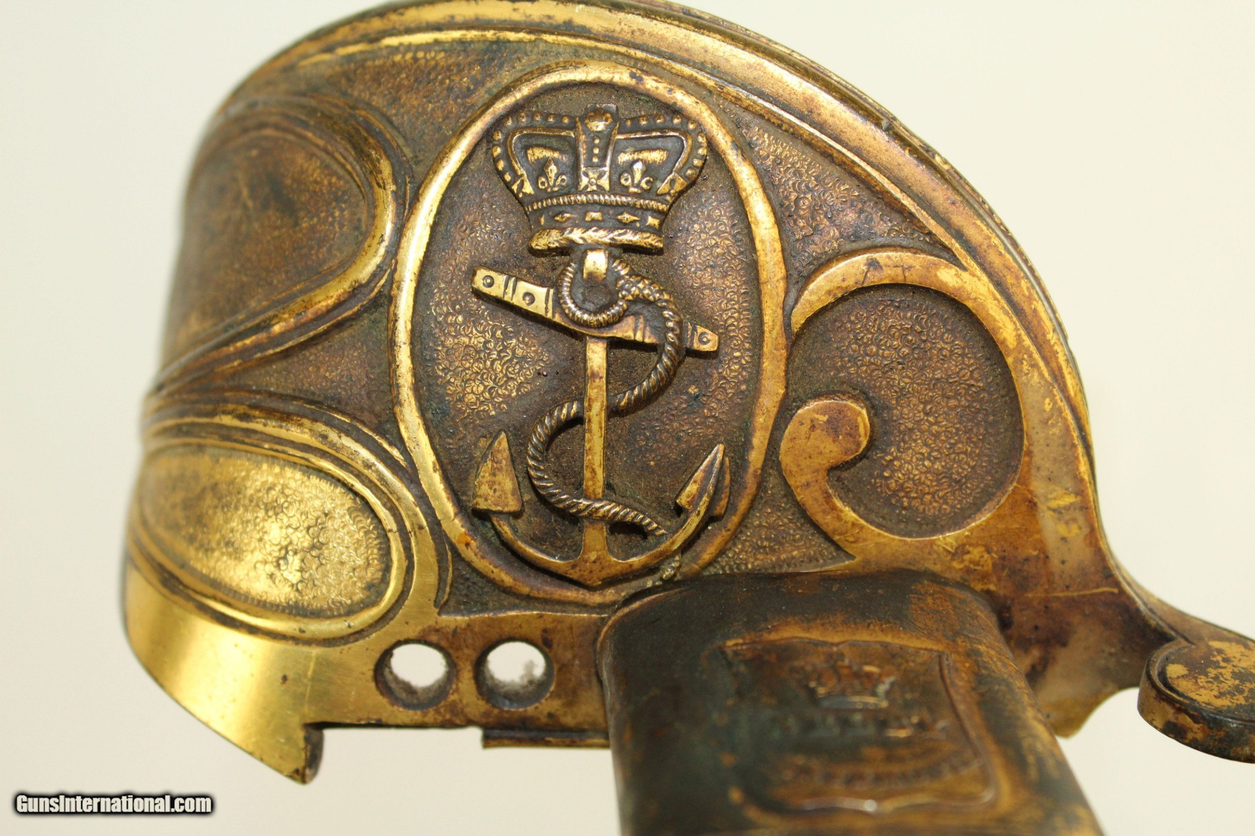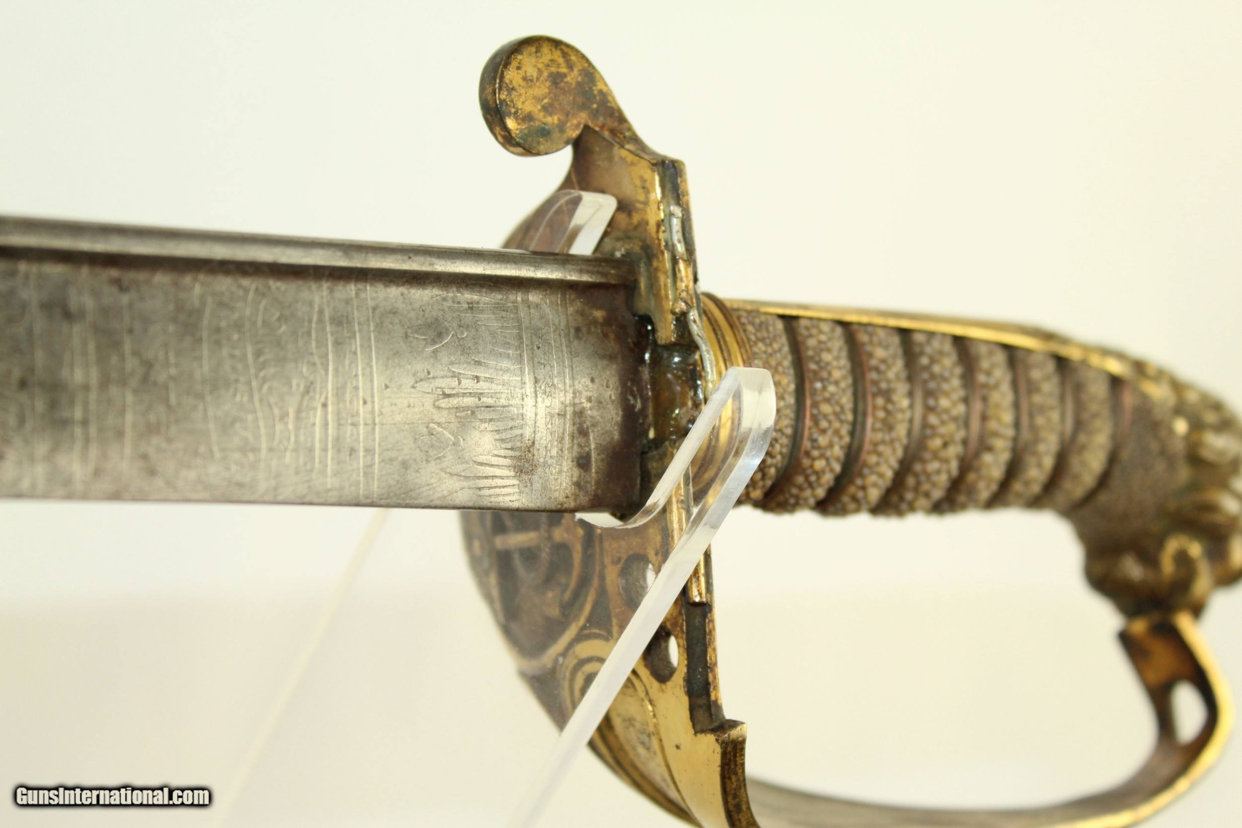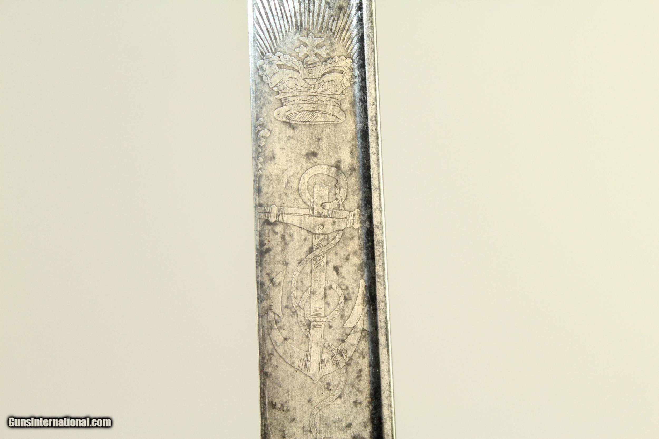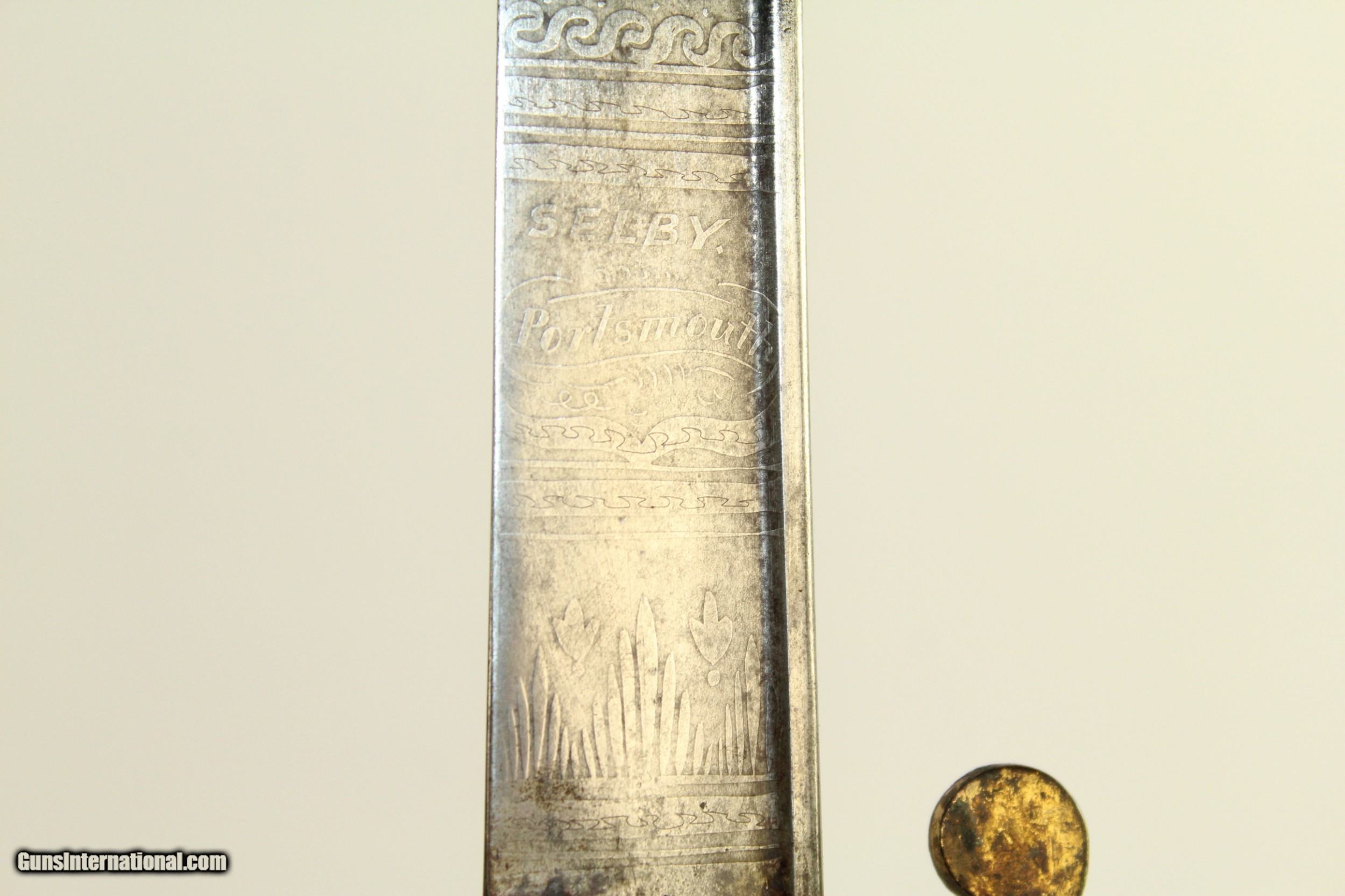 Description: BRITISH Antique SELBY PORTSMOUTH Officer’s Sword Circa 1830 Lion’s Head Pipeback Naval Sword Here we present an antique British Naval Officer’s Sword, made circa 1830 by Selby of Portsmouth. This stately piece has a distinctive rounded “pipe” running the entire length of the spine, lending strength. The tip has a long segment on the back side that would have been sharp like the cutting edge. The blade is beautifully acid etched on either side with about 50% coverage. The left side bears the name “SELBY/Portsmouth”, as well as a British crown over a tangled anchor. The right side bears a lion and unicorn holding up a coat of arms. The pommel is in the shape of a lion’s head. The guard also bears a crown over a naval anchor. Grip is white rayskin, wrapped with wire. The leather scabbard is original, with heavy brass fittings. The throat of the scabbard is marked “Crown/SELBY/PORTSMOUTH”. Overall condition is very good. The blade looks as though this sword was used in a fight or two, with a few dings. The etching is clear and legible. The grip is complete. There was once a hinged piece to the guard that is no longer present. The leather on the scabbard is original and in near fine condition. Here is a fantastic sword with lots of history. Imagine the places this sword has been! Own the original! This is a legitimate antique and not a reproduction. Blade is 29 inches in length. Overall condition as seen in photos. Very Fast. Very Safe. FREE SHIPPING WORLDWIDE. Delivered directly to your door by express mail! Guaranteed AUTHENTIC & Includes CERTIFICATE OF AUTHENTICITY. ancestryguns $1500 #30101 SOLD |
