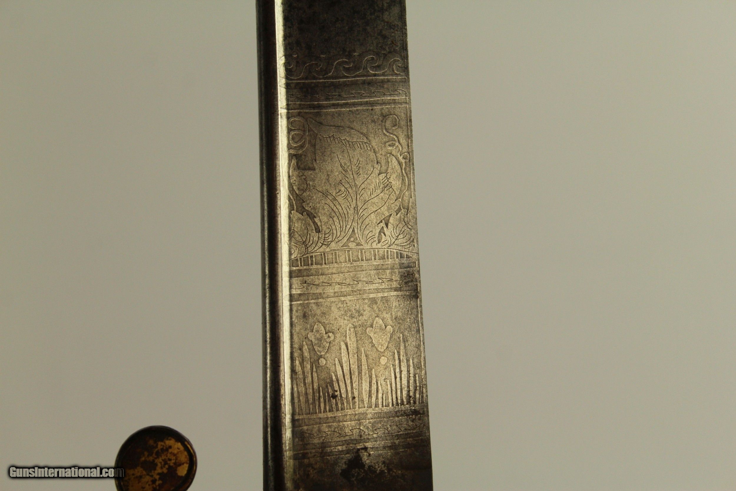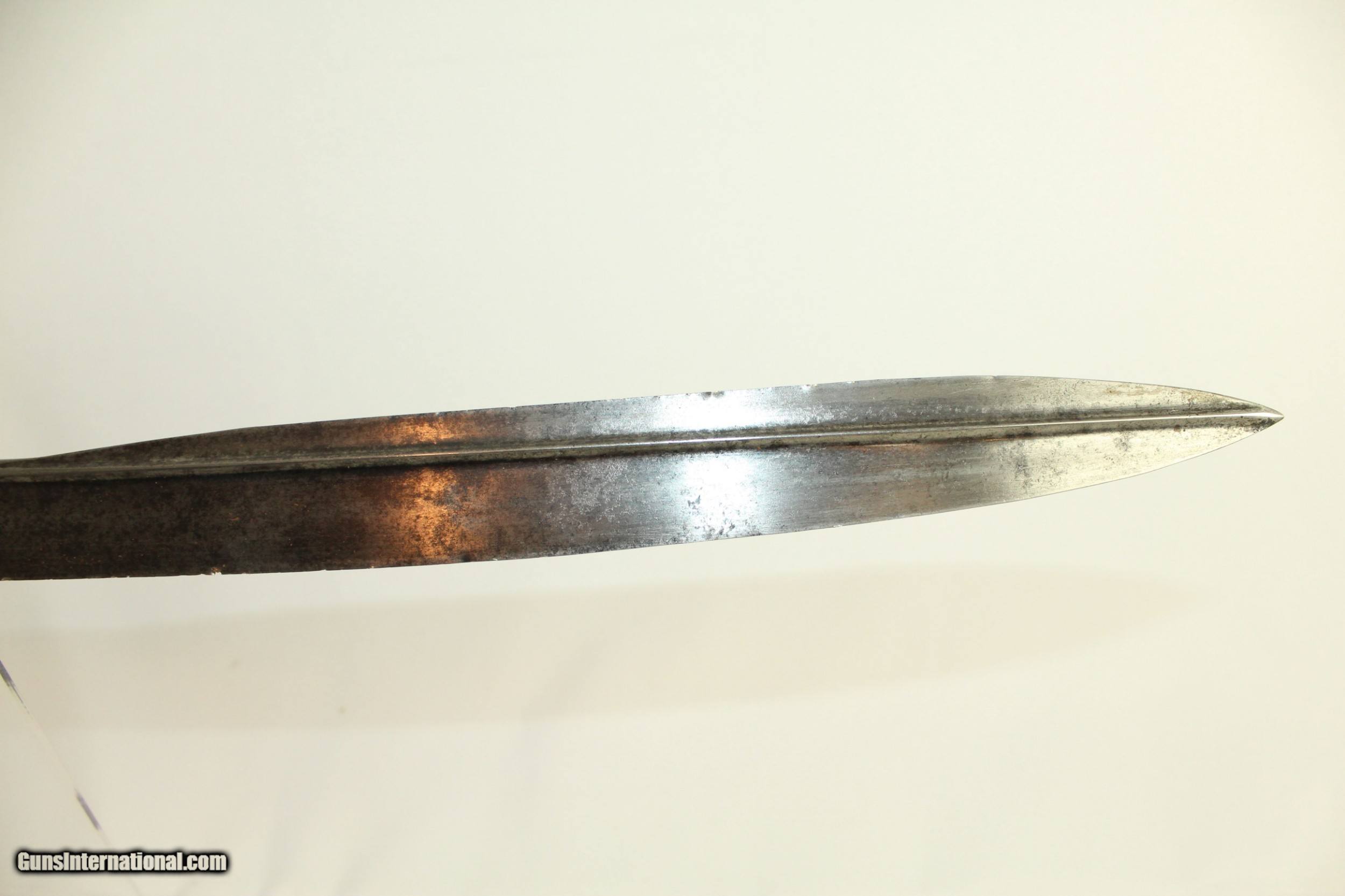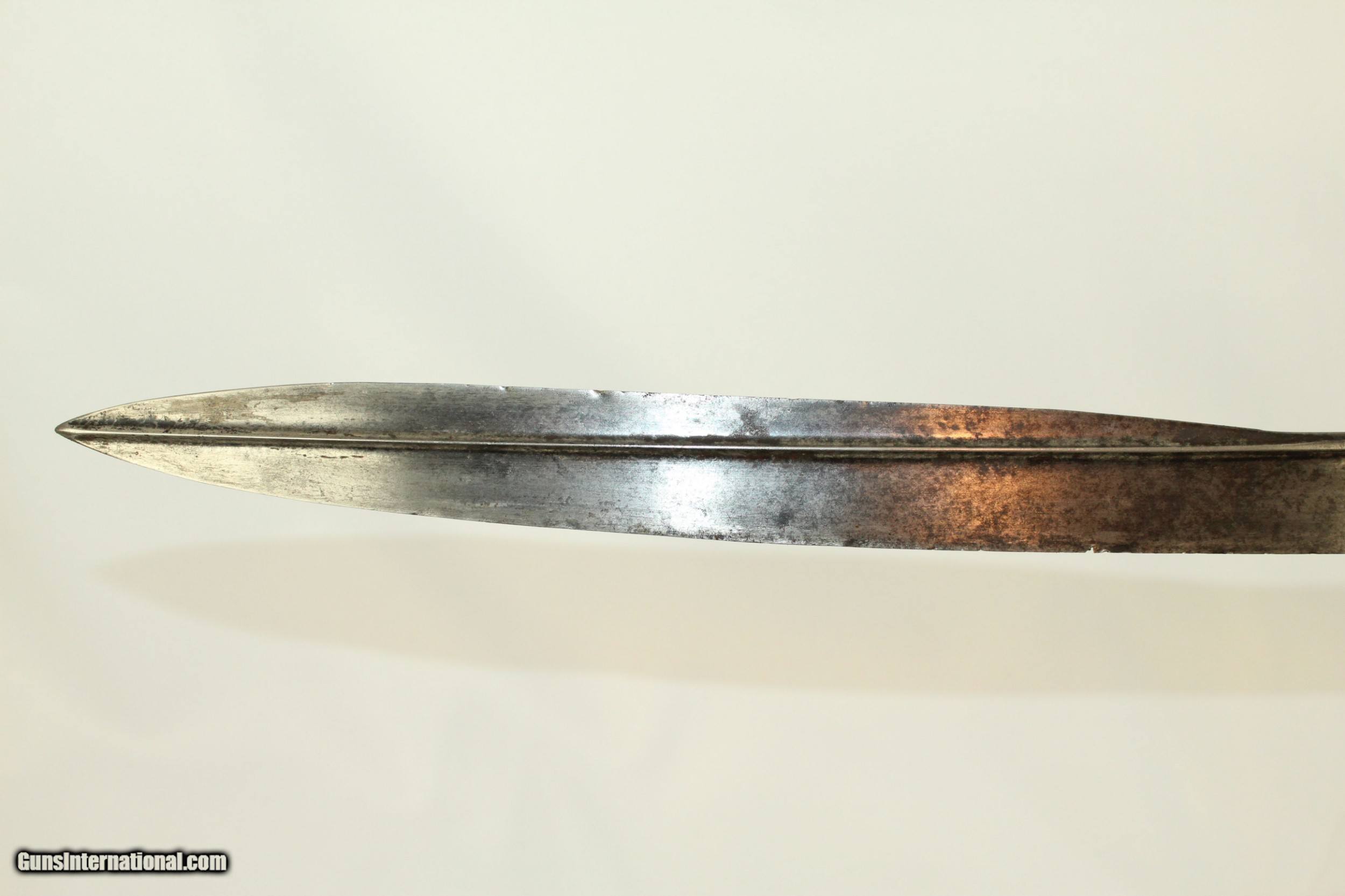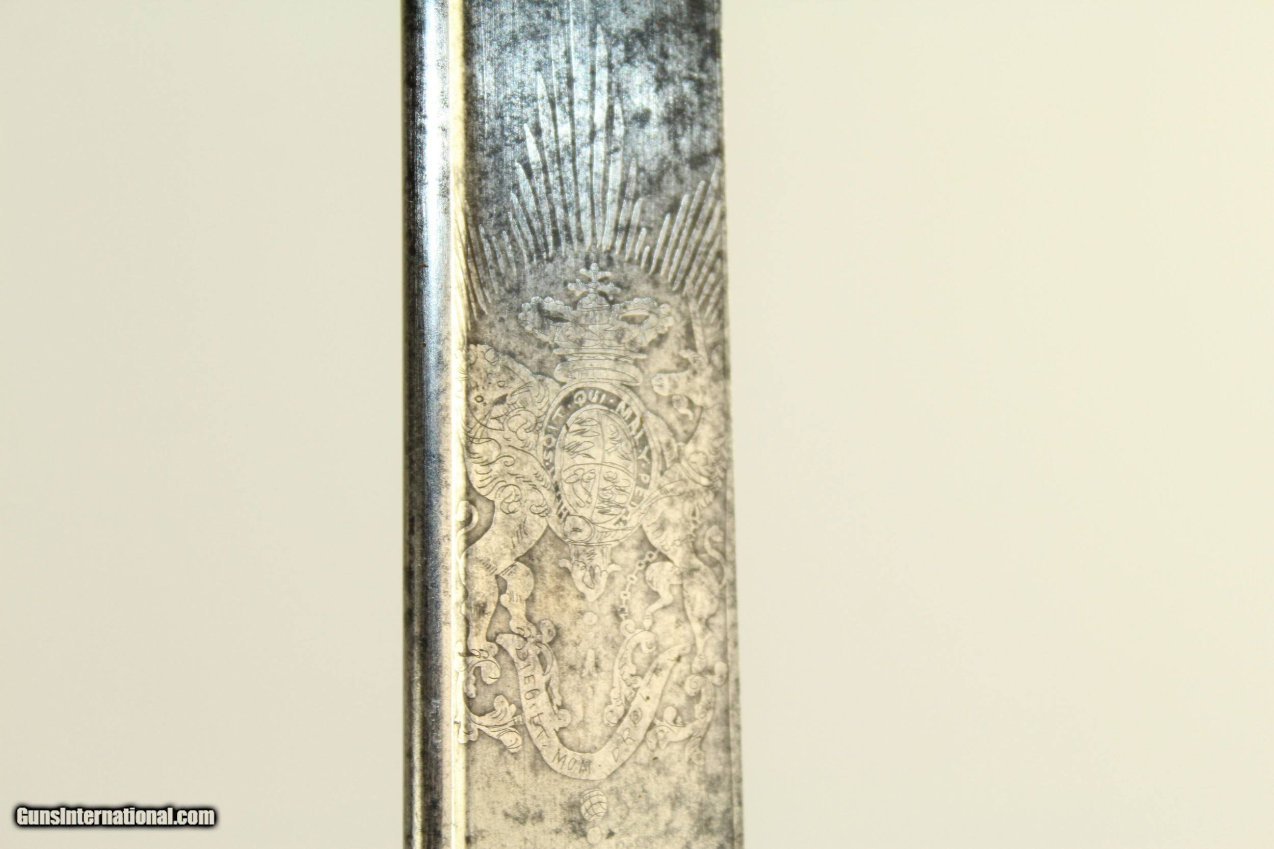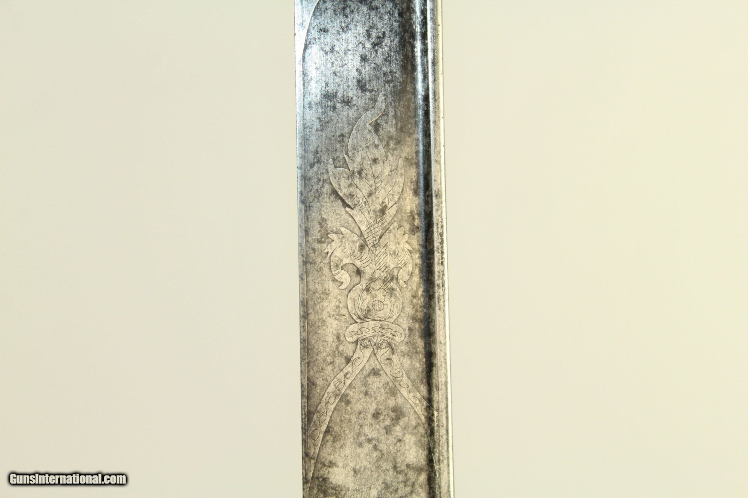 Description: BRITISH Antique SELBY PORTSMOUTH Officer’s Sword Circa 1830 Lion’s Head Pipeback Naval Sword Here we present an antique British Naval Officer’s Sword, made circa 1830 by Selby of Portsmouth. This stately piece has a distinctive rounded “pipe” running the entire length of the spine, lending strength. The tip has a long segment on the back side that would have been sharp like the cutting edge. The blade is beautifully acid etched on either side with about 50% coverage. The left side bears the name “SELBY/Portsmouth”, as well as a British crown over a tangled anchor. The right side bears a lion and unicorn holding up a coat of arms. The pommel is in the shape of a lion’s head. The guard also bears a crown over a naval anchor. Grip is white rayskin, wrapped with wire. The leather scabbard is original, with heavy brass fittings. The throat of the scabbard is marked “Crown/SELBY/PORTSMOUTH”. Overall condition is very good. The blade looks as though this sword was used in a fight or two, with a few dings. The etching is clear and legible. The grip is complete. There was once a hinged piece to the guard that is no longer present. The leather on the scabbard is original and in near fine condition. Here is a fantastic sword with lots of history. Imagine the places this sword has been! Own the original! This is a legitimate antique and not a reproduction. Blade is 29 inches in length. Overall condition as seen in photos. Very Fast. Very Safe. FREE SHIPPING WORLDWIDE. Delivered directly to your door by express mail! Guaranteed AUTHENTIC & Includes CERTIFICATE OF AUTHENTICITY. ancestryguns $1500 #30101 SOLD |