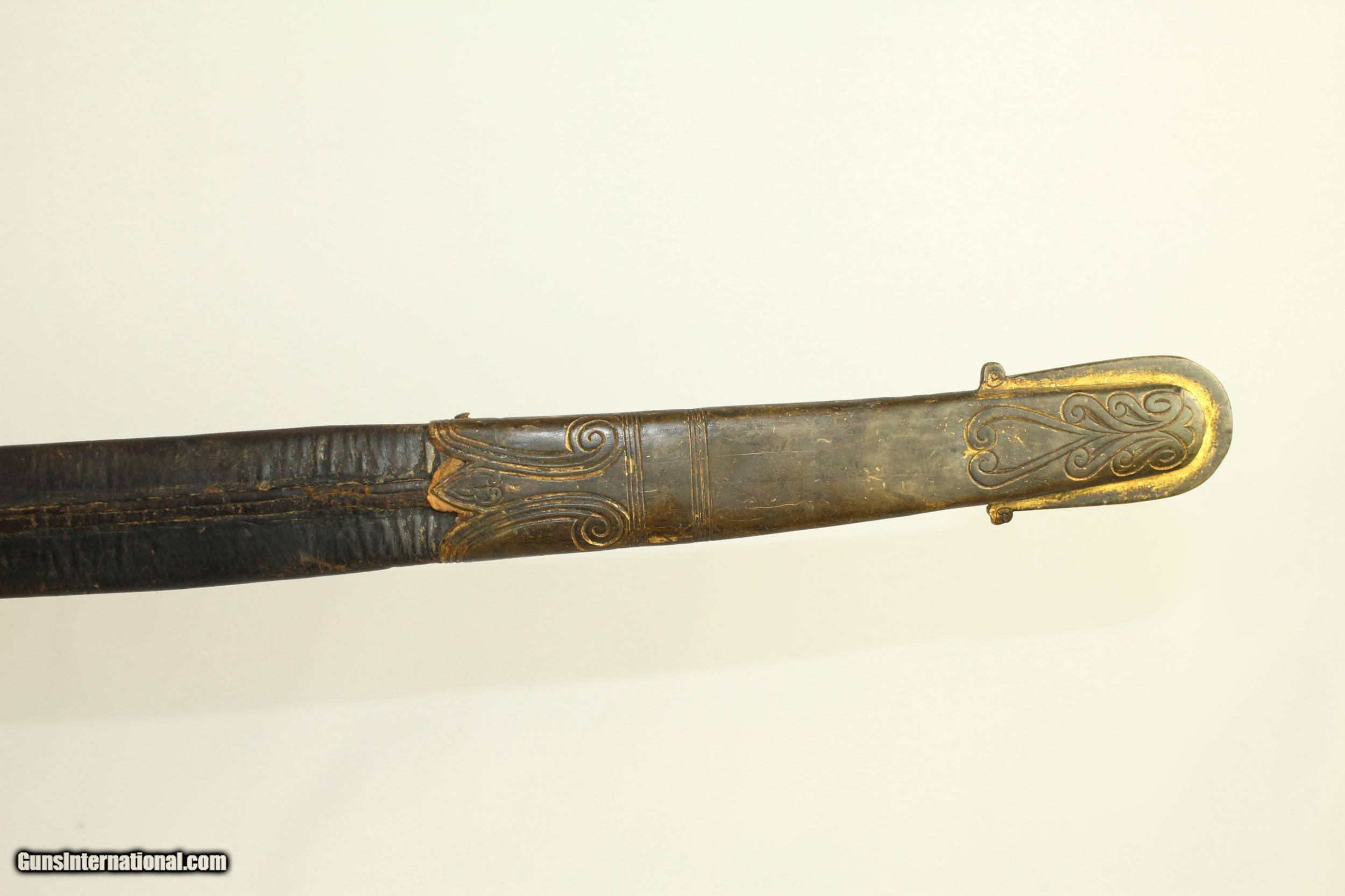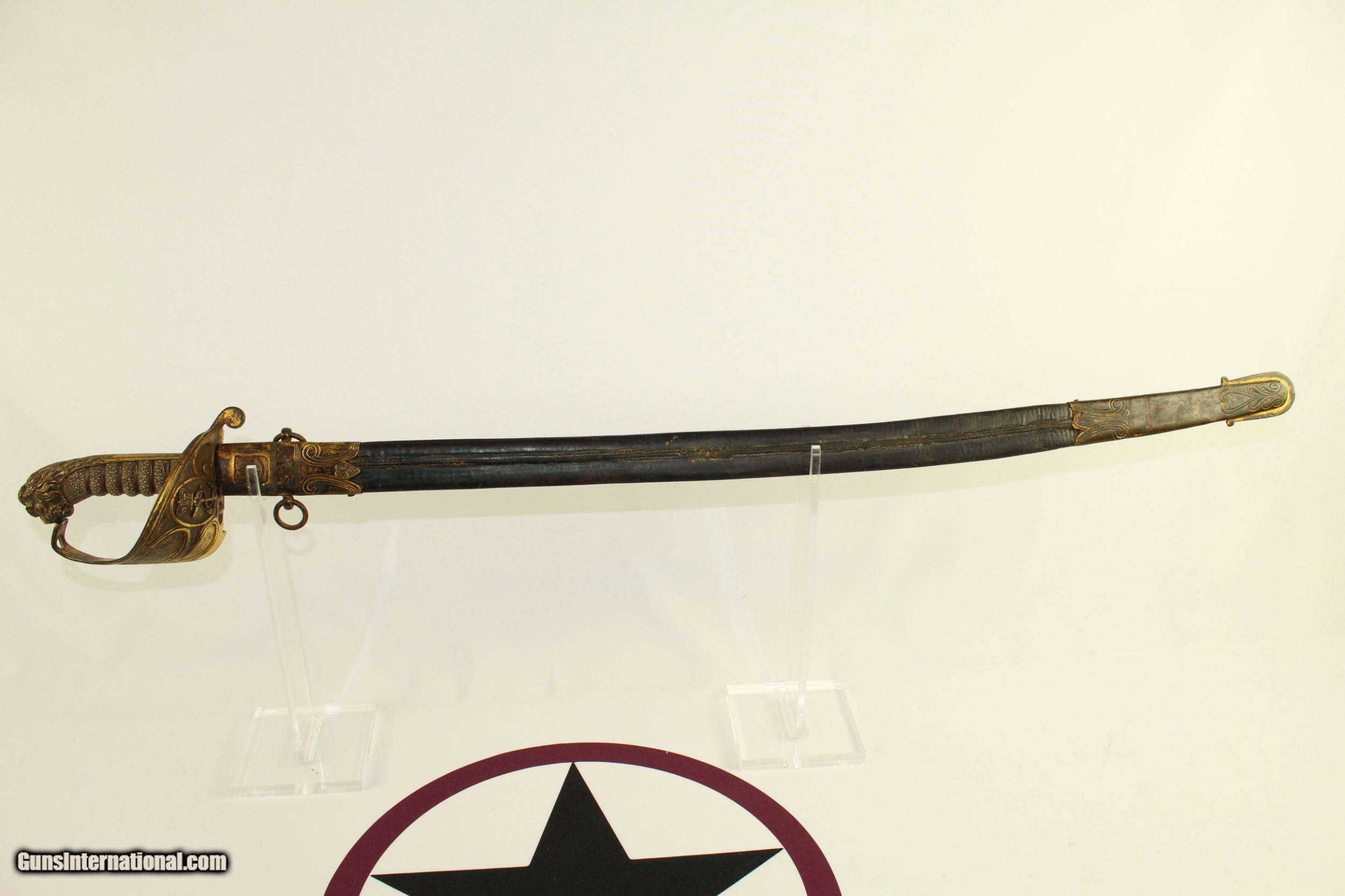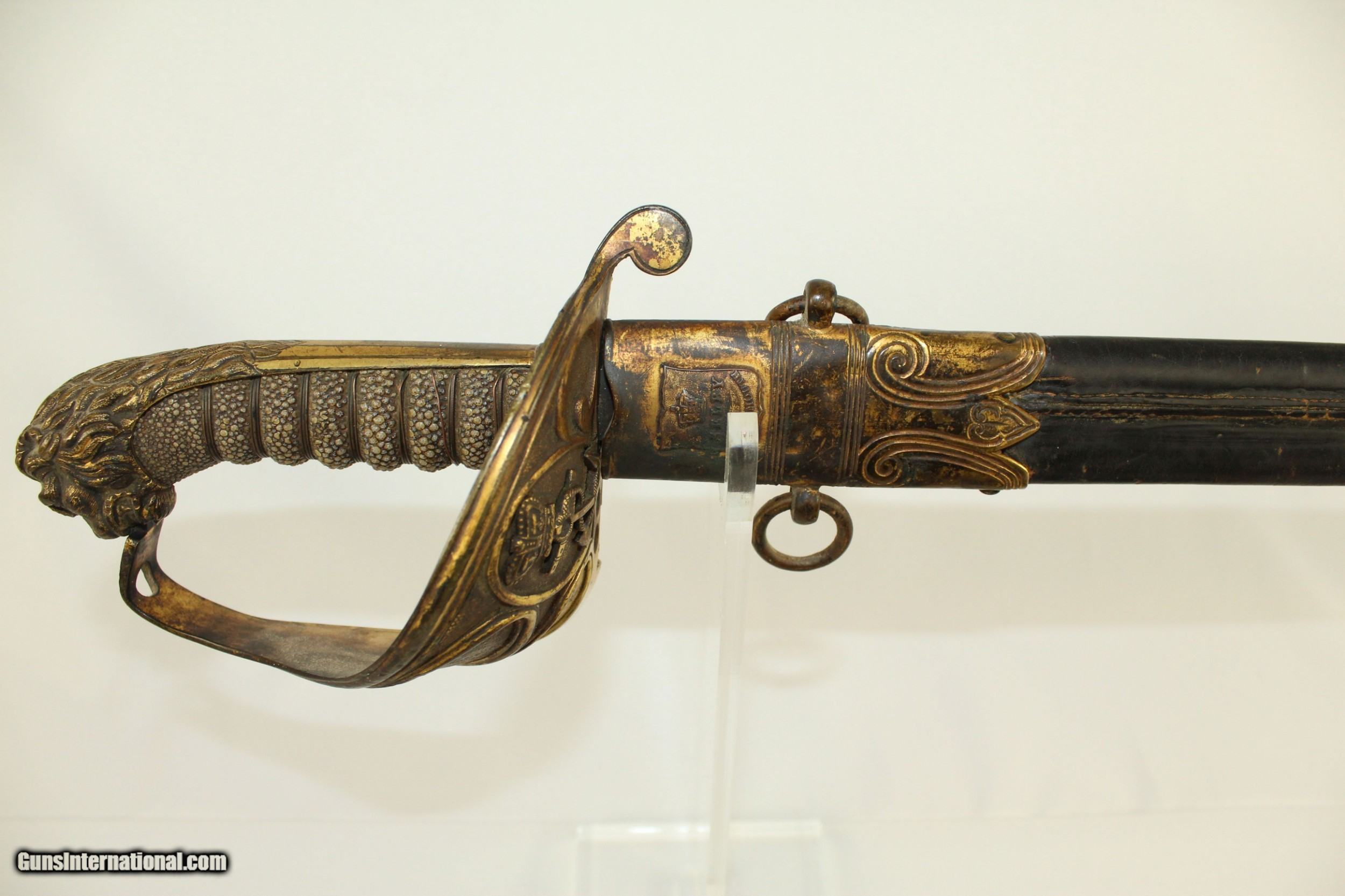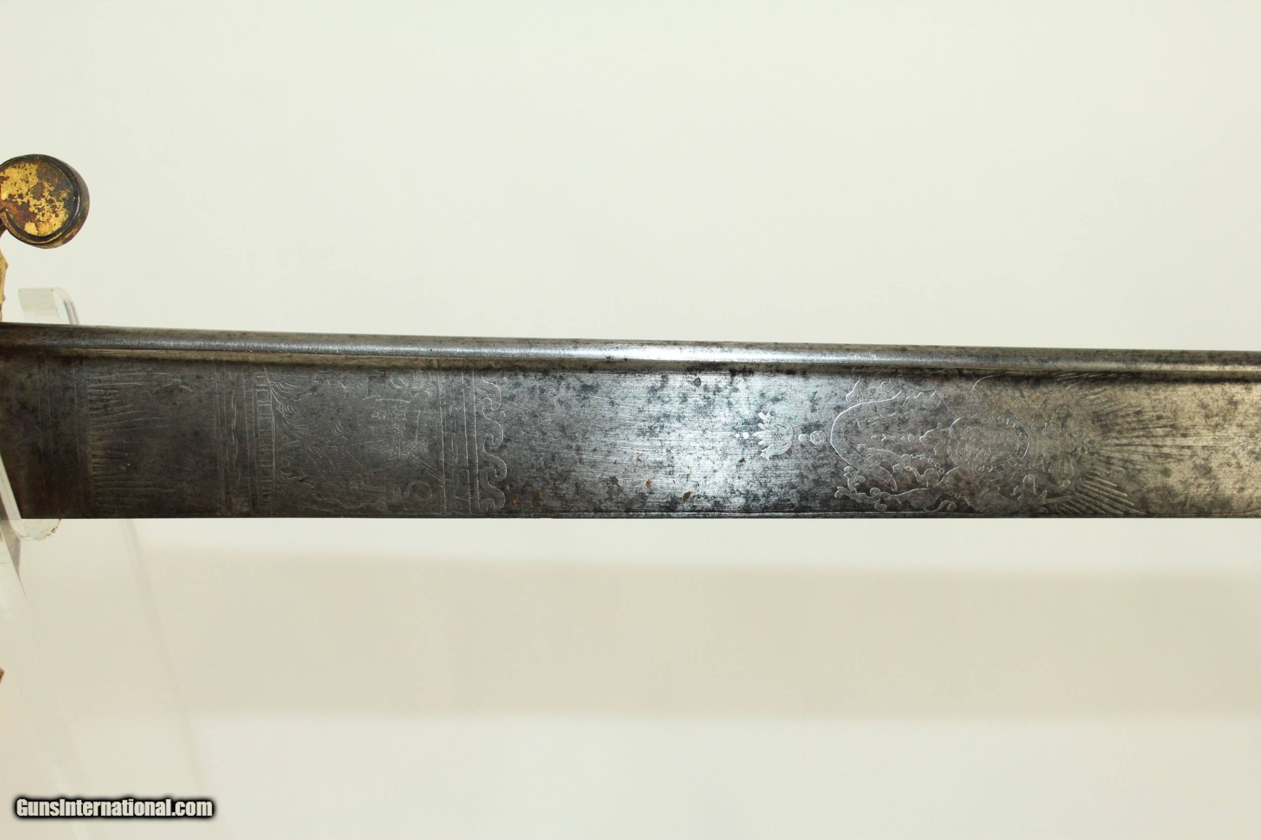 Description: BRITISH Antique SELBY PORTSMOUTH Officer’s Sword Circa 1830 Lion’s Head Pipeback Naval Sword Here we present an antique British Naval Officer’s Sword, made circa 1830 by Selby of Portsmouth. This stately piece has a distinctive rounded “pipe” running the entire length of the spine, lending strength. The tip has a long segment on the back side that would have been sharp like the cutting edge. The blade is beautifully acid etched on either side with about 50% coverage. The left side bears the name “SELBY/Portsmouth”, as well as a British crown over a tangled anchor. The right side bears a lion and unicorn holding up a coat of arms. The pommel is in the shape of a lion’s head. The guard also bears a crown over a naval anchor. Grip is white rayskin, wrapped with wire. The leather scabbard is original, with heavy brass fittings. The throat of the scabbard is marked “Crown/SELBY/PORTSMOUTH”. Overall condition is very good. The blade looks as though this sword was used in a fight or two, with a few dings. The etching is clear and legible. The grip is complete. There was once a hinged piece to the guard that is no longer present. The leather on the scabbard is original and in near fine condition. Here is a fantastic sword with lots of history. Imagine the places this sword has been! Own the original! This is a legitimate antique and not a reproduction. Blade is 29 inches in length. Overall condition as seen in photos. Very Fast. Very Safe. FREE SHIPPING WORLDWIDE. Delivered directly to your door by express mail! Guaranteed AUTHENTIC & Includes CERTIFICATE OF AUTHENTICITY. ancestryguns $1500 #30101 SOLD |