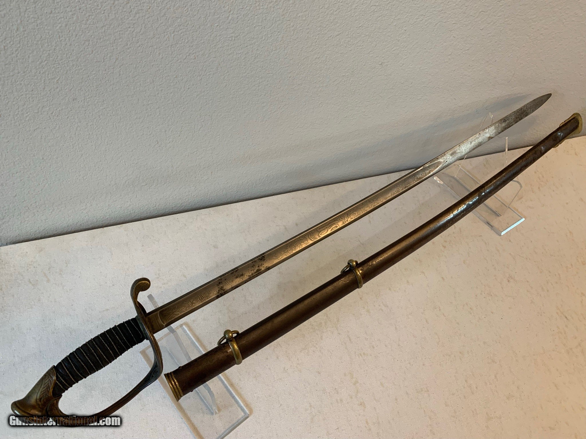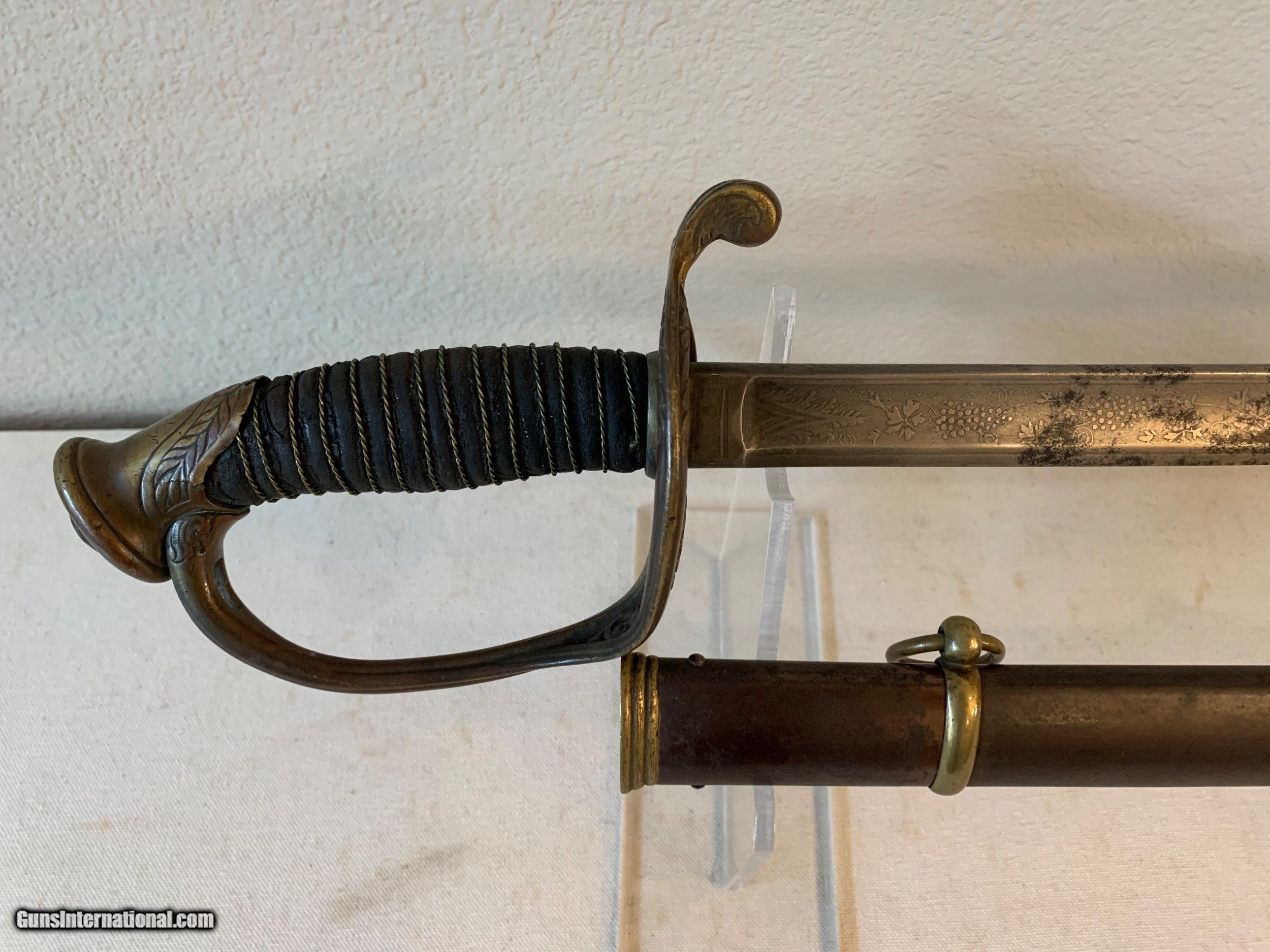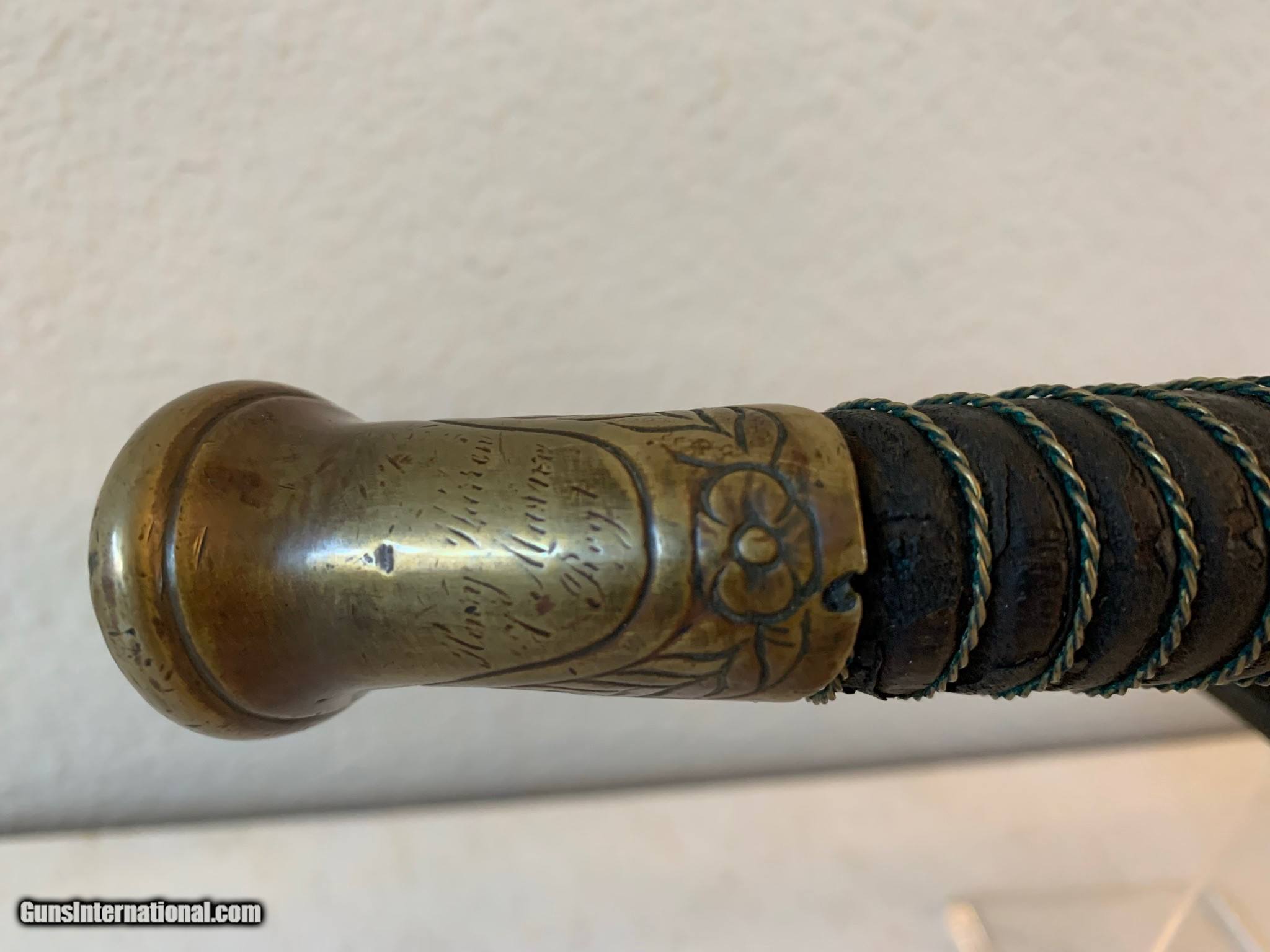 Description: 1850 Foot officers sword belonging to Capt. Henry Warren 7th Maine Regt. Which is engraved upon the pommal. Henry H. Warren was the son of Asa Warren, a farmer in Bangor, Maine. As a boy he had been employed at the Bangor Daily Whig and Courier, and at the outbreak of the war was a student at Bowdoin College. His name appears in connection with local war meetings and prospective volunteer companies early on, but he was not officially enlisted until 8/21/1861, when mustered into Company H of the 7th Maine, initially as private then sergeant soon after. He was promoted to lieutenant in early 1862. The sword is housed in its original, non-regulation brass-mounted metal scabbard, which is eminently more practical for field use than the more fragile, regulation leather. The upper part of the scabbard has a smooth plum surface. The lower portion shows plum also, but with some small dents and surface pitting. The brass throat, ring mounts, and drag are all in place and have a medium patina with just some stains on the drag. The blade has a good edge and point. The metal shows some dark spots and slight pitting for a few inches back from the point, but from above the fuller down to the guard the surface is good and the etching very visible. Both sides are extensively etched with grape vines, leaves and clusters of grapes starting from a set of floral chevrons above the ricasso. The obverse features a tall, vertical U.S. amid some floral scrolls. The reverse shows a broad eagle with wings out, and slightly downturned, holding a banderole in its beak reading E Pluribus Unum,For two weeks, from May 4 through May 18, the regiment was constantly engaged with the enemy at the Wilderness and Spotsylvania, with particularly heavy losses at the Wilderness on May 6 and in the attack on Salient on May 12. A letter to the Bangor newspaper listed some 261 casualties up through May 12, including Warren, wounded in the "arm and foot, slight." Grant, however, ordered one last assault at dawn on May 18 near the old Salient, which he thought had been weakened by Lee in response to his movements. The Sixth Corps retraced its steps and alongside the Second Corps attacked positions that had been strengthened by Ewell and were well defended by infantry and artillery. Federal infantry were kept at a distance by obstacles in front of the earthworks and Confederate artillery tore apart the assault.By CWData's count the regiment added another 22 to its casualty fiqures for the campaign. Warren was "killed instantly" in the attack according to his old paper, which eulogized him, saying that from the day of his enlistment, "to the day of his death he has followed the path of duty, never shrinking from any task, however unpleasant, that his conscience approved. Brave to a fault, always faithful, his fills a soldier's grave, and his friends are left to mourn his early decease. this is a fantastic sword carried by an officer killed in the line of duty!! Rare to own a piece of history such as this. SOLD Model: 1850 |