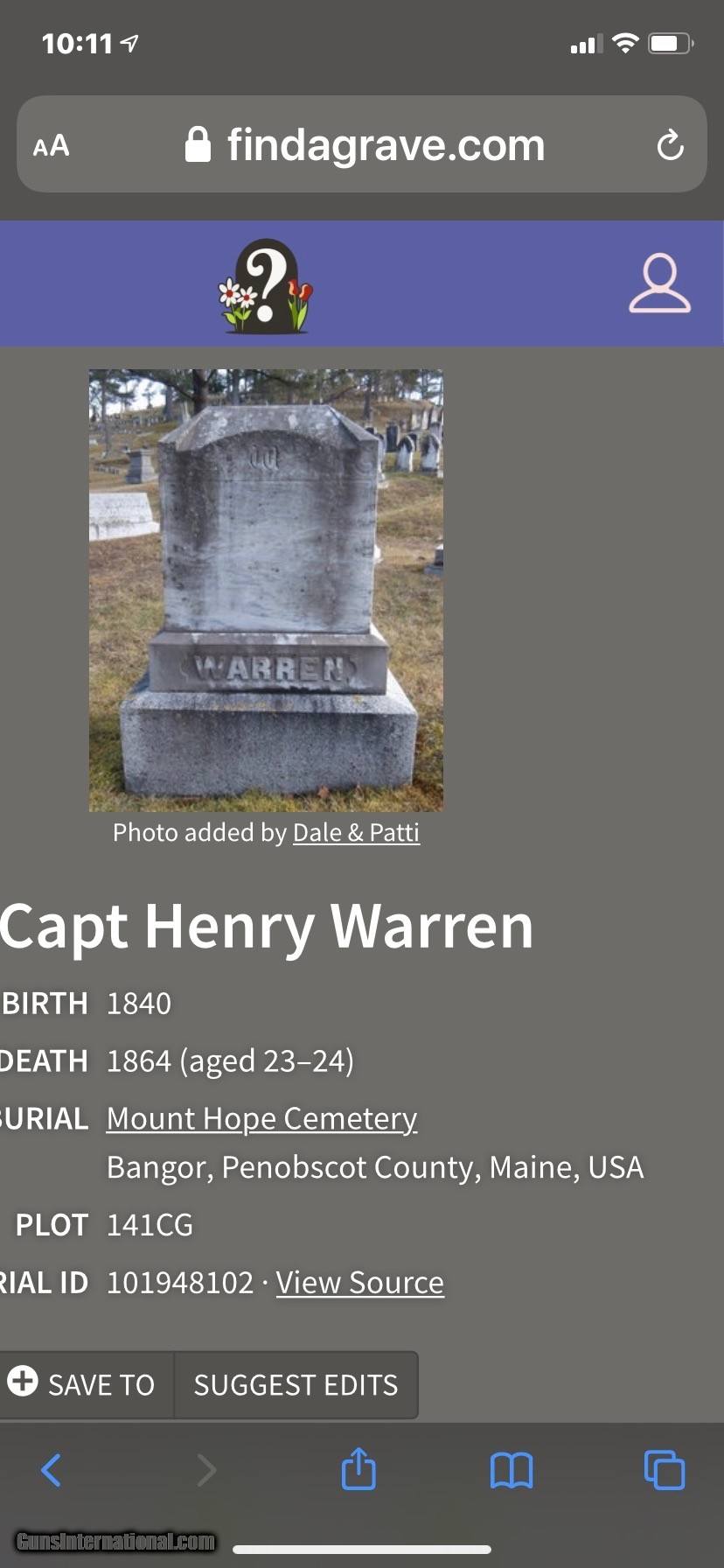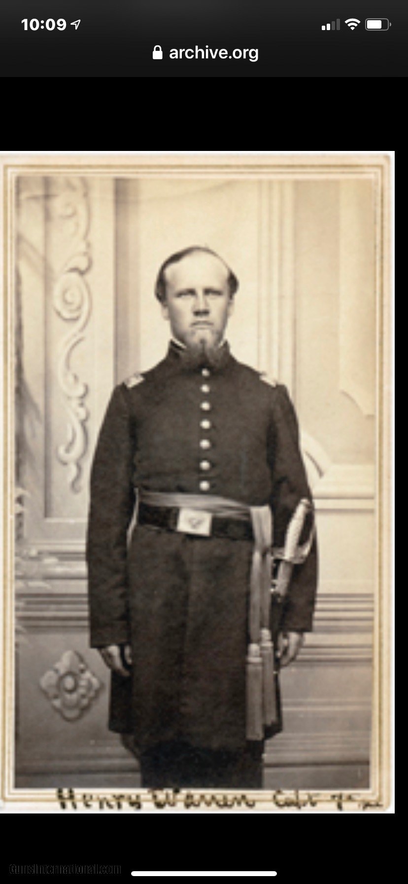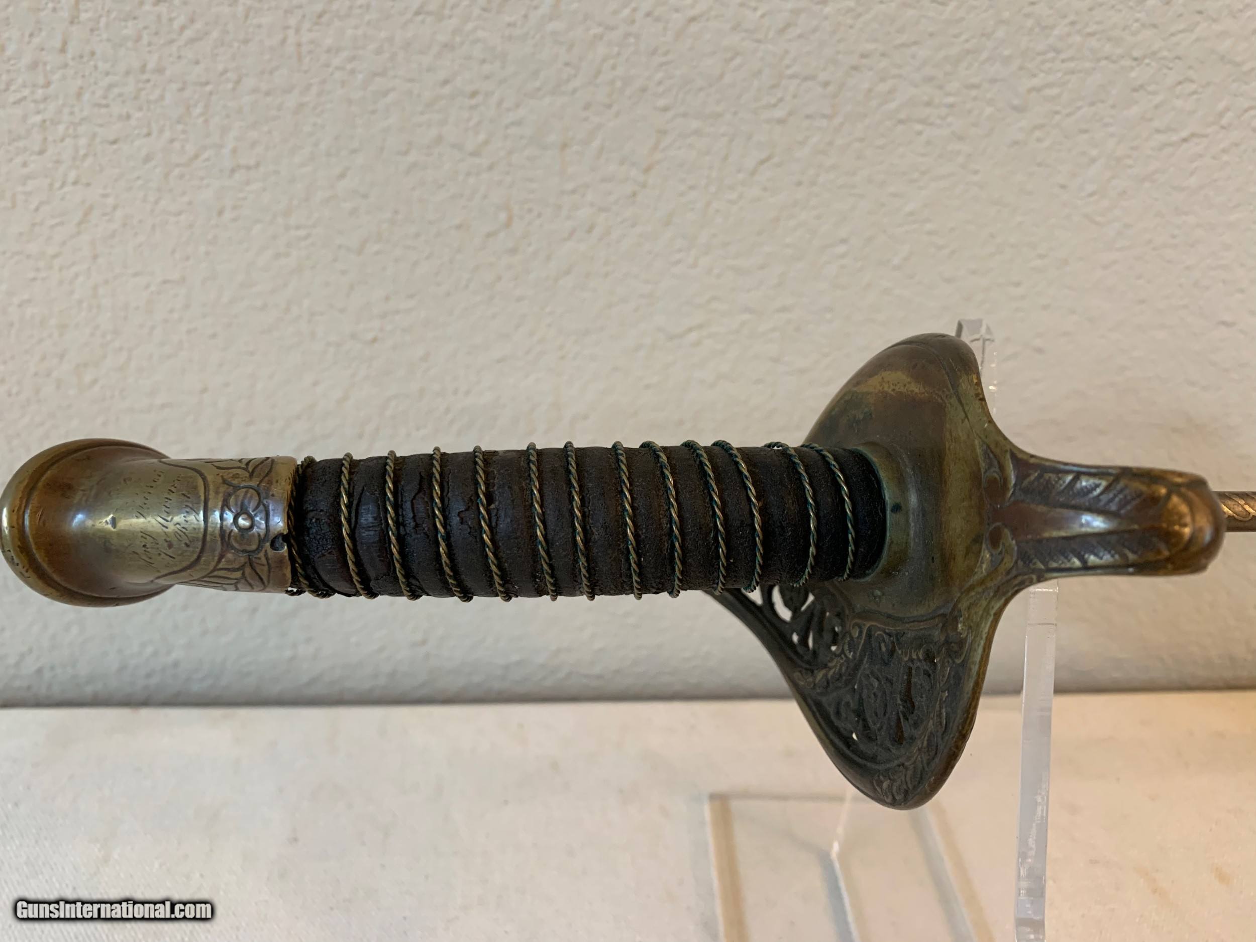 Description: 1850 Foot officers sword belonging to Capt. Henry Warren 7th Maine Regt. Which is engraved upon the pommal. Henry H. Warren was the son of Asa Warren, a farmer in Bangor, Maine. As a boy he had been employed at the Bangor Daily Whig and Courier, and at the outbreak of the war was a student at Bowdoin College. His name appears in connection with local war meetings and prospective volunteer companies early on, but he was not officially enlisted until 8/21/1861, when mustered into Company H of the 7th Maine, initially as private then sergeant soon after. He was promoted to lieutenant in early 1862. The sword is housed in its original, non-regulation brass-mounted metal scabbard, which is eminently more practical for field use than the more fragile, regulation leather. The upper part of the scabbard has a smooth plum surface. The lower portion shows plum also, but with some small dents and surface pitting. The brass throat, ring mounts, and drag are all in place and have a medium patina with just some stains on the drag. The blade has a good edge and point. The metal shows some dark spots and slight pitting for a few inches back from the point, but from above the fuller down to the guard the surface is good and the etching very visible. Both sides are extensively etched with grape vines, leaves and clusters of grapes starting from a set of floral chevrons above the ricasso. The obverse features a tall, vertical U.S. amid some floral scrolls. The reverse shows a broad eagle with wings out, and slightly downturned, holding a banderole in its beak reading E Pluribus Unum,For two weeks, from May 4 through May 18, the regiment was constantly engaged with the enemy at the Wilderness and Spotsylvania, with particularly heavy losses at the Wilderness on May 6 and in the attack on Salient on May 12. A letter to the Bangor newspaper listed some 261 casualties up through May 12, including Warren, wounded in the "arm and foot, slight." Grant, however, ordered one last assault at dawn on May 18 near the old Salient, which he thought had been weakened by Lee in response to his movements. The Sixth Corps retraced its steps and alongside the Second Corps attacked positions that had been strengthened by Ewell and were well defended by infantry and artillery. Federal infantry were kept at a distance by obstacles in front of the earthworks and Confederate artillery tore apart the assault.By CWData's count the regiment added another 22 to its casualty fiqures for the campaign. Warren was "killed instantly" in the attack according to his old paper, which eulogized him, saying that from the day of his enlistment, "to the day of his death he has followed the path of duty, never shrinking from any task, however unpleasant, that his conscience approved. Brave to a fault, always faithful, his fills a soldier's grave, and his friends are left to mourn his early decease. this is a fantastic sword carried by an officer killed in the line of duty!! Rare to own a piece of history such as this. SOLD Model: 1850 |