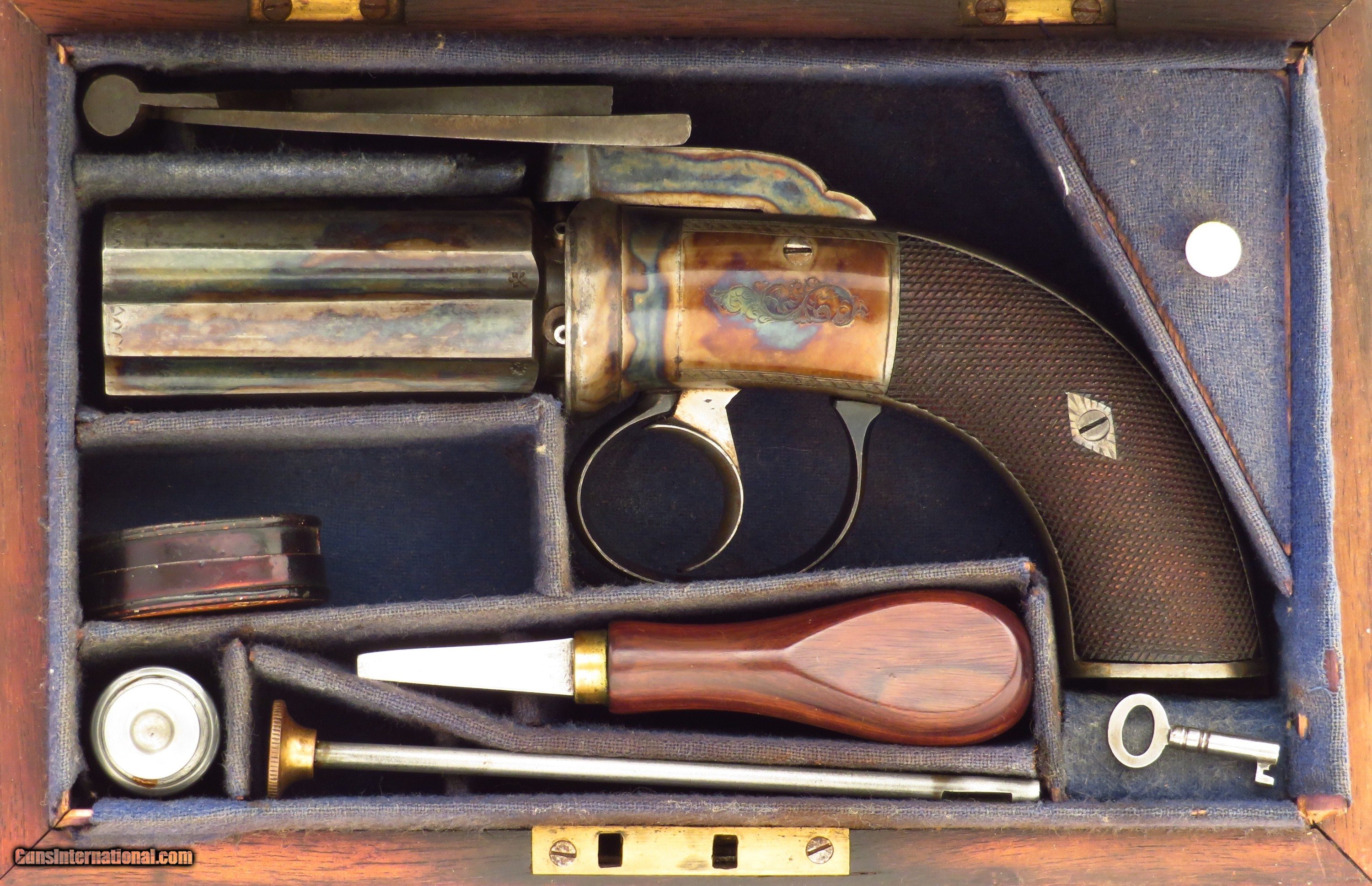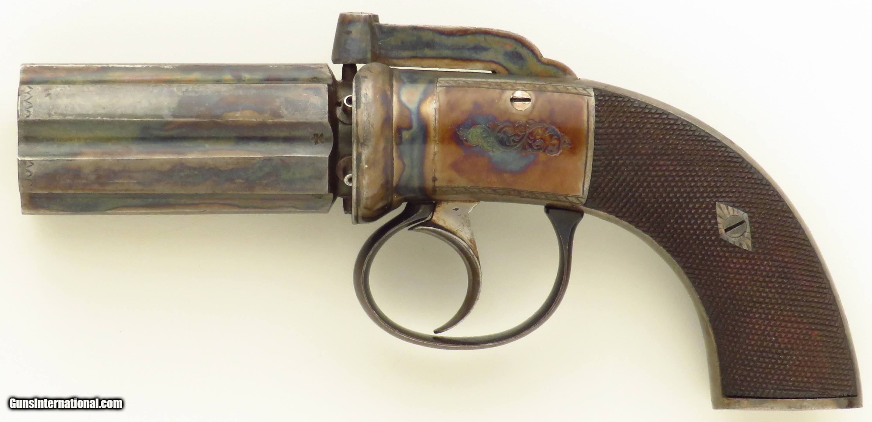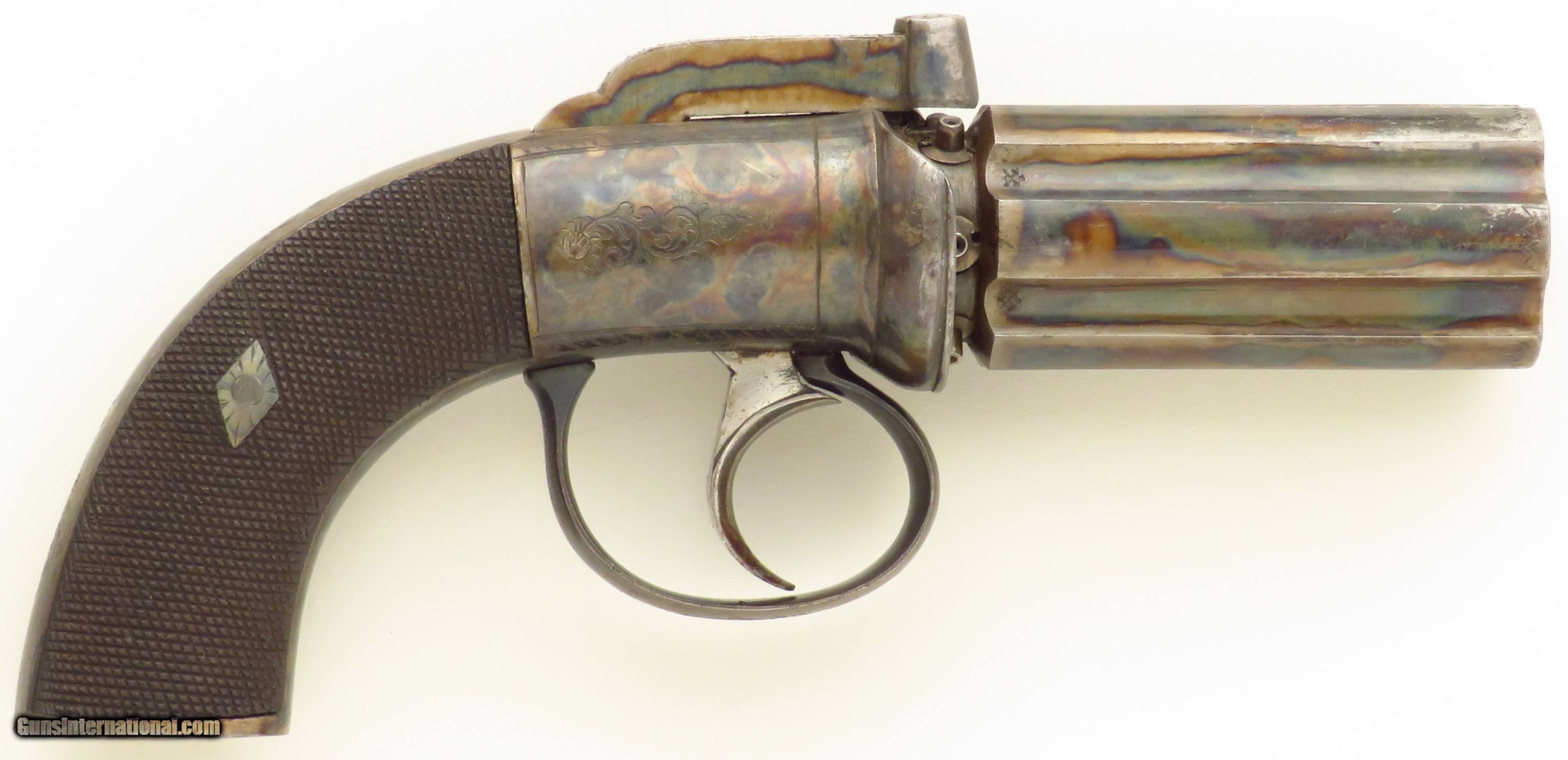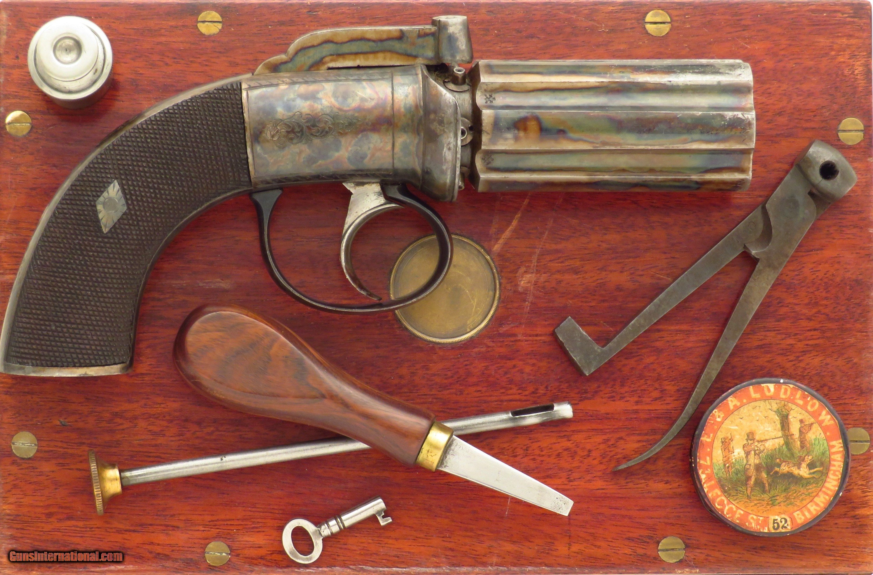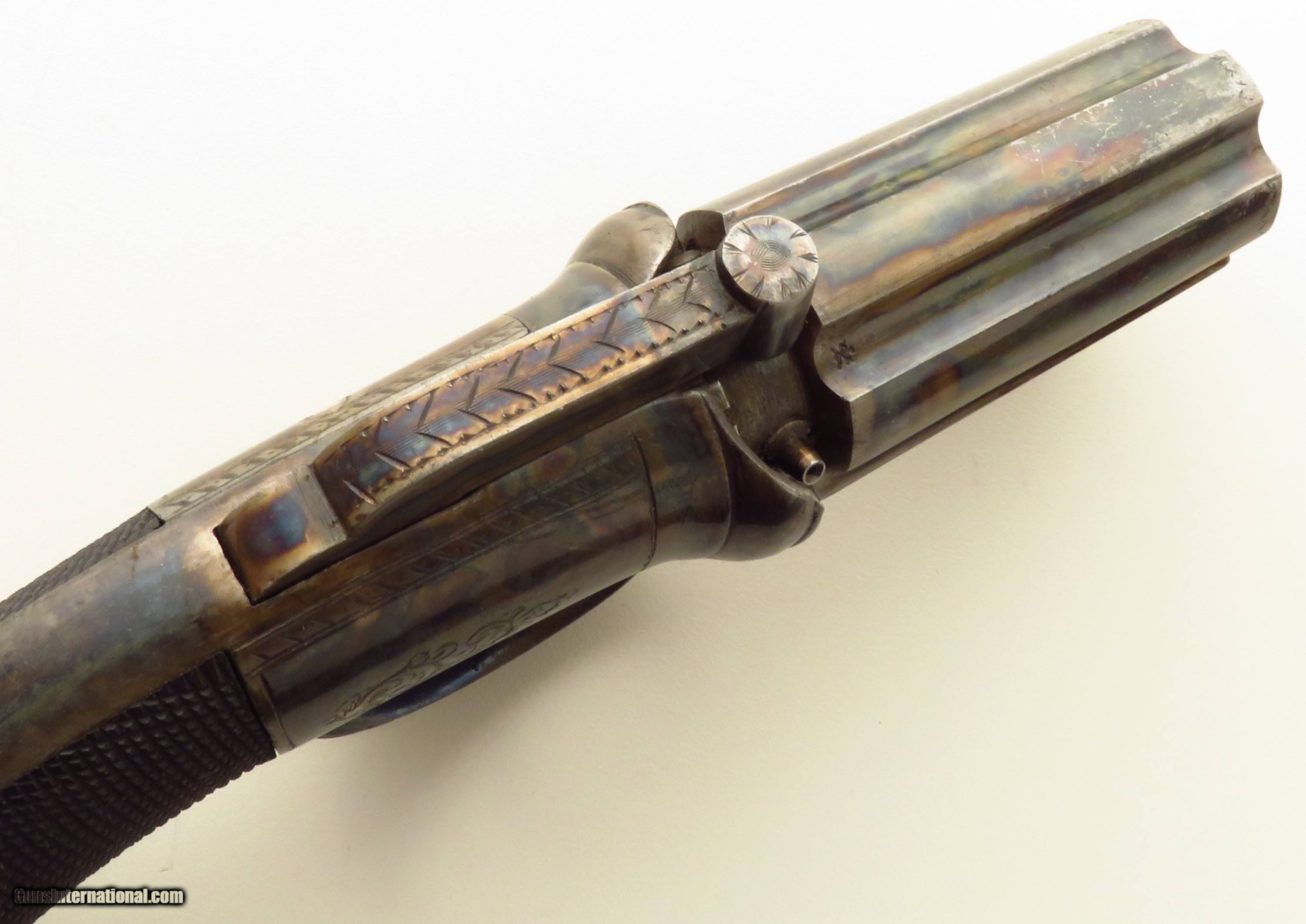 Engraved & cased .33 caliber pepperbox, Higham case, proper mechanics, layaway
