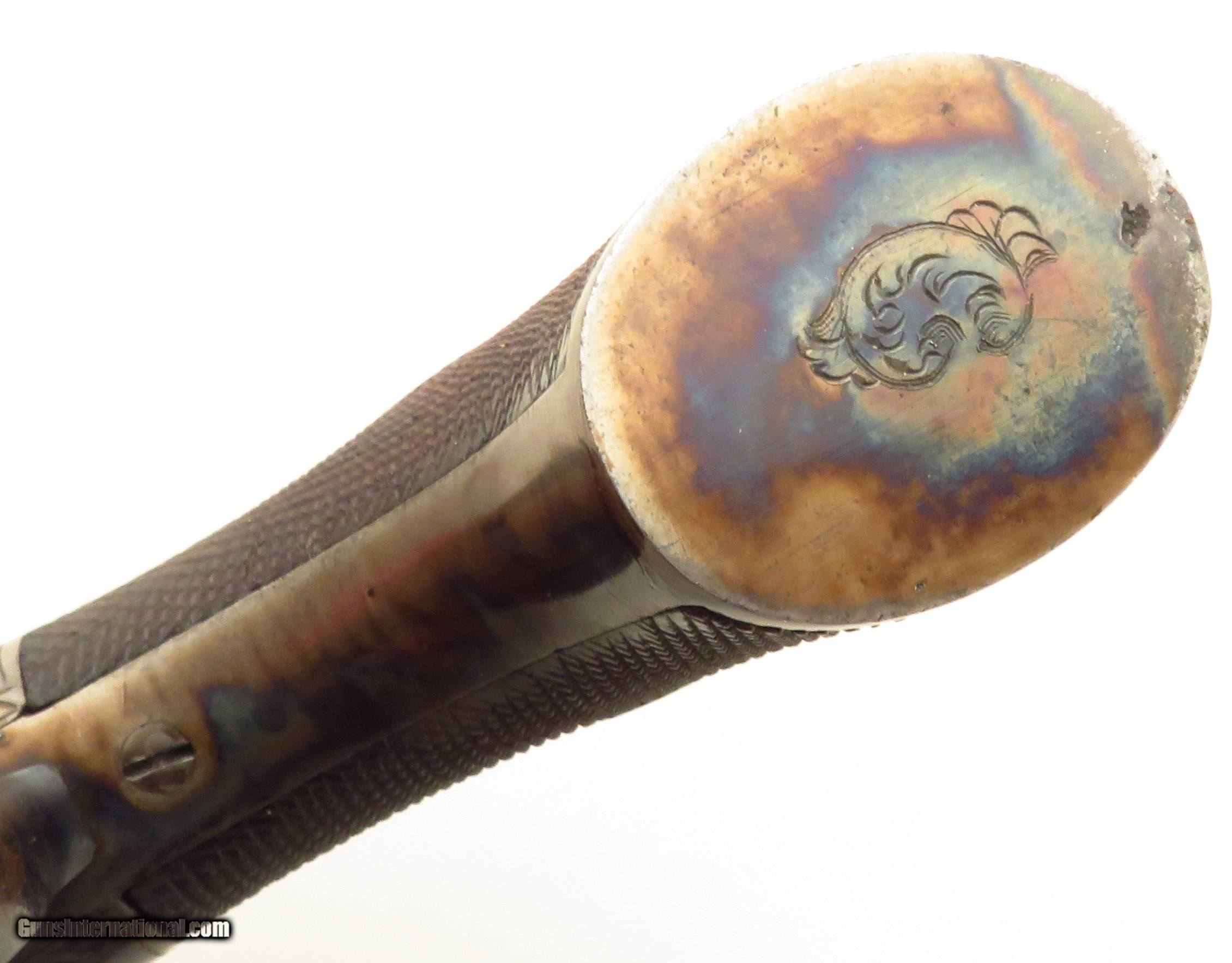 Description: Engraved and cased .33 caliber pepperbox. Features include six three-inch barrels, color case and walnut grips. Weight is 1.6 pounds. CONDITION: Bores are good with some browning and light roughness. Barrels rotate and lock properly. Engraving is sharp. Likely restored, colors are approximately 80 percent. Blue over the guard is approximately 20 percent. Grips grips are solid. NOTE: The pistol is unmarked as to brand. Case label is Higham. CASE: The included case includes tools. Condition is somewhat poor with detached partitions. The price is firm and layaway is available. $2,750 plus shipping. Price: $2,750.00 Shipping: $75.00 Contact Seller |