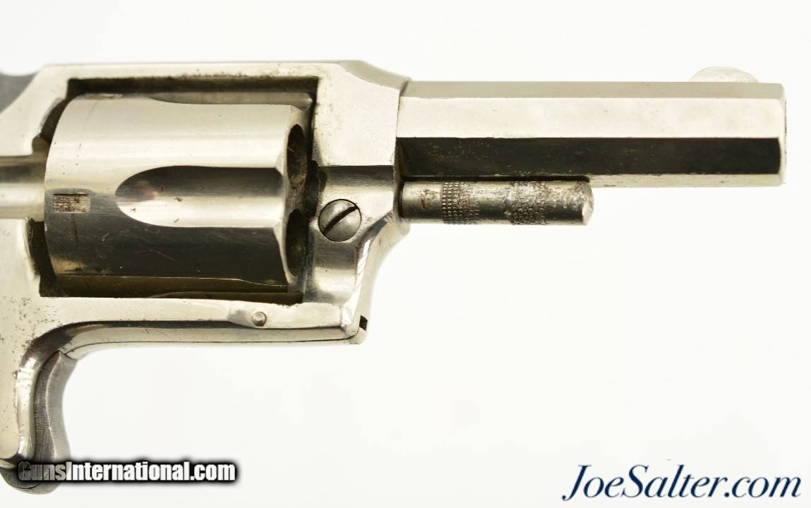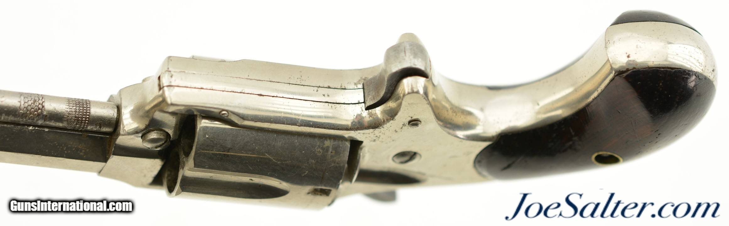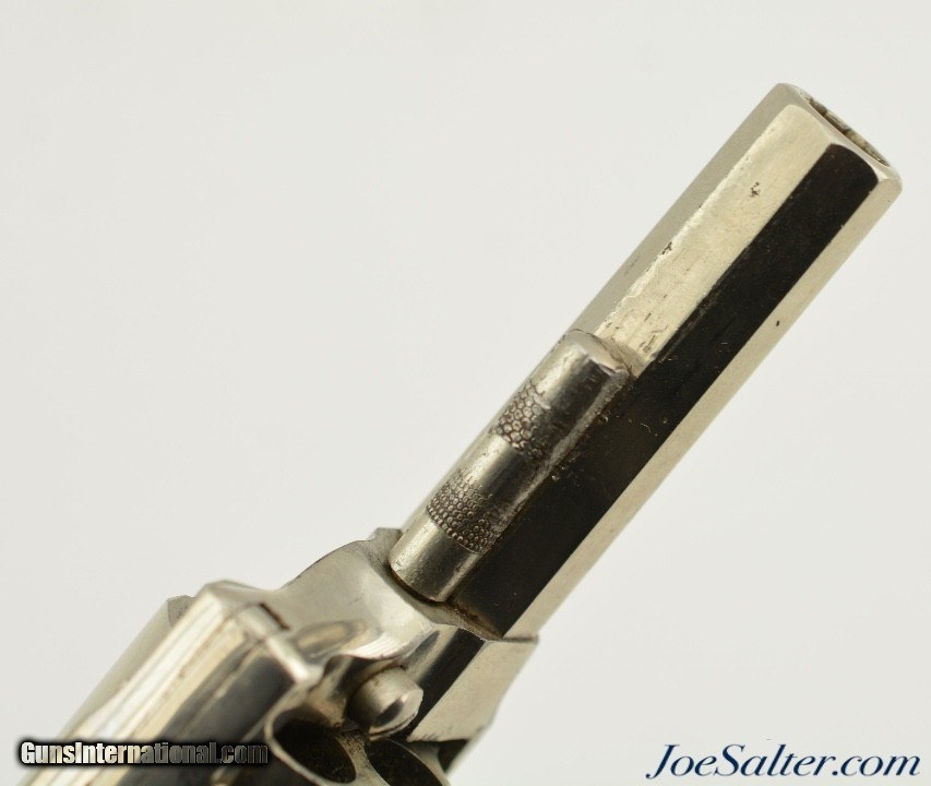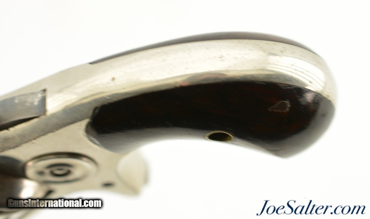 Description: Serial #68541, .32 Rim Fire, 2 ¼ inch octagon barrel with a good, bright bore with light scattered pitting. This is the "RED JACKET No. 3" revolver as marked on the barrel manufactured by "THE LEE ARMS COMPANY / WILKES-BARRE, PA" marked on the top strap and was produced circa 1877-1880 (the three years the company was in operation). In excellent condition the metal surface retain about 96-98% of the original nickel finish showing fine handling marks, scattered tiny flaking and a faint drag line on the cylinder. The rosewood grips rate near excellent showing light handling wear. It functions well mechanically holding at half and full cock. The cylinder release pin moves freely and is likely missing a spring. An overall excellent example of the neat little pocket spur trigger "suicide special" revolvers from a short lived company. Antique. Antique: Yes Price: $495.00 Contact Seller |