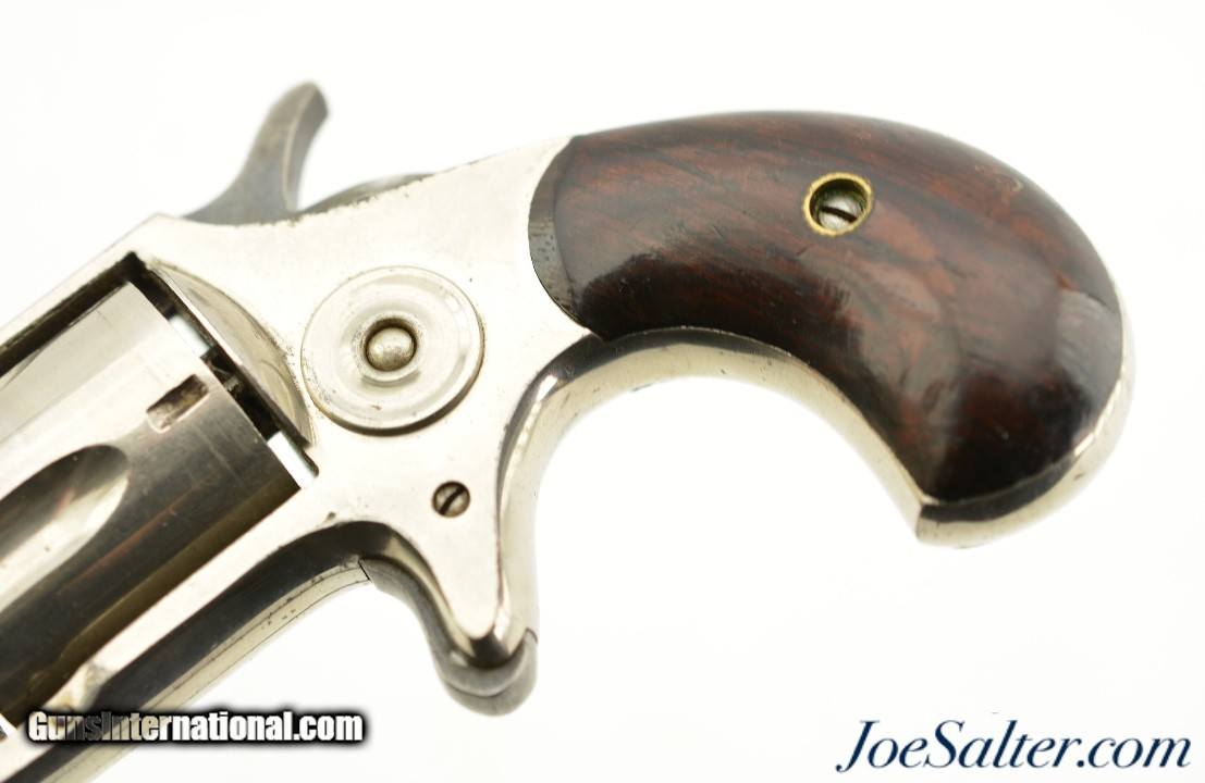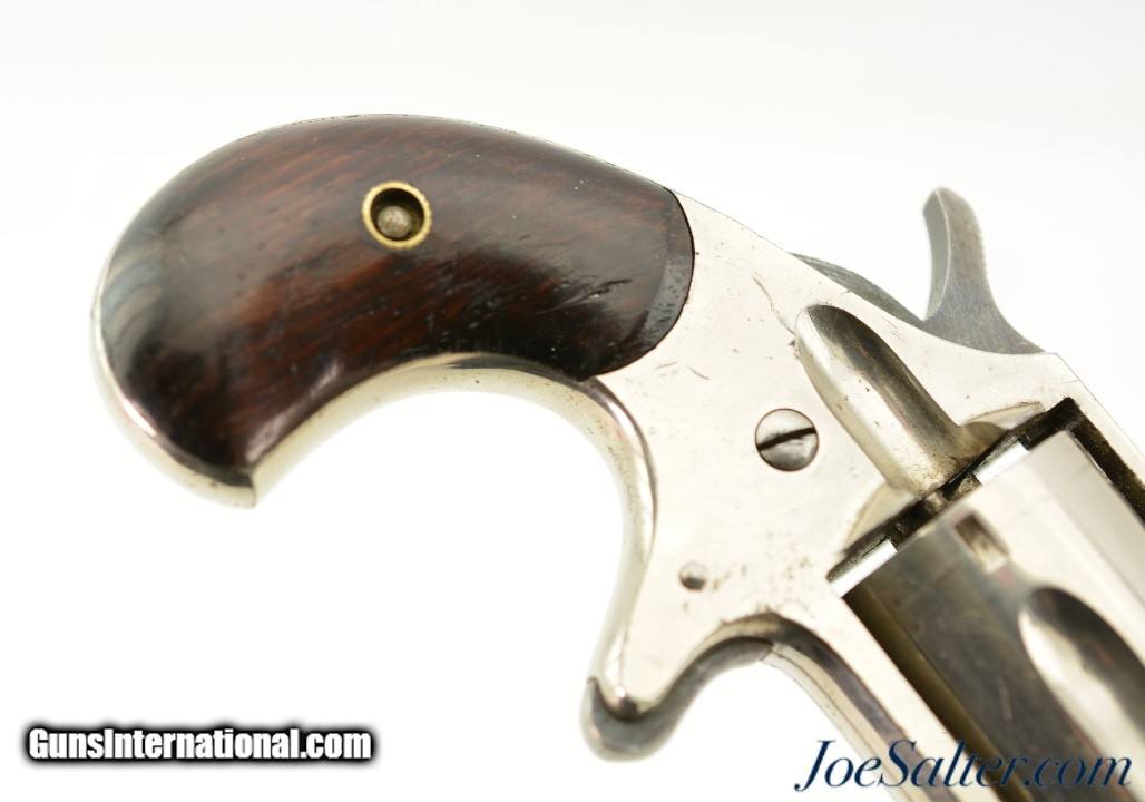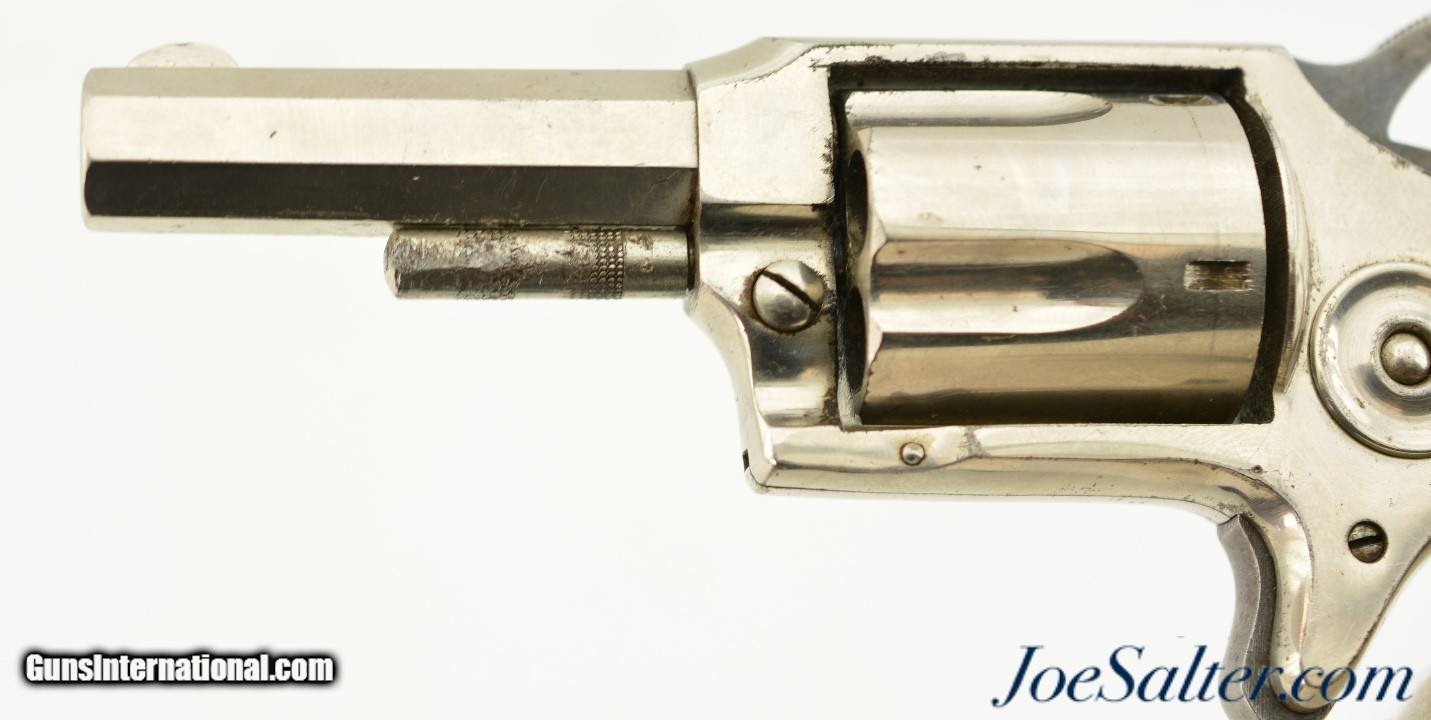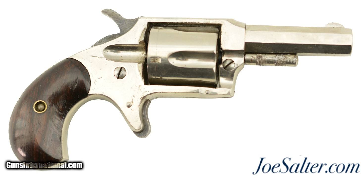 Description: Serial #68541, .32 Rim Fire, 2 ¼ inch octagon barrel with a good, bright bore with light scattered pitting. This is the "RED JACKET No. 3" revolver as marked on the barrel manufactured by "THE LEE ARMS COMPANY / WILKES-BARRE, PA" marked on the top strap and was produced circa 1877-1880 (the three years the company was in operation). In excellent condition the metal surface retain about 96-98% of the original nickel finish showing fine handling marks, scattered tiny flaking and a faint drag line on the cylinder. The rosewood grips rate near excellent showing light handling wear. It functions well mechanically holding at half and full cock. The cylinder release pin moves freely and is likely missing a spring. An overall excellent example of the neat little pocket spur trigger "suicide special" revolvers from a short lived company. Antique. Antique: Yes Price: $495.00 Contact Seller |