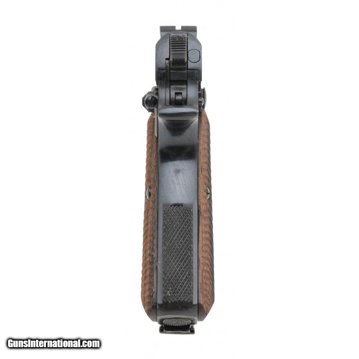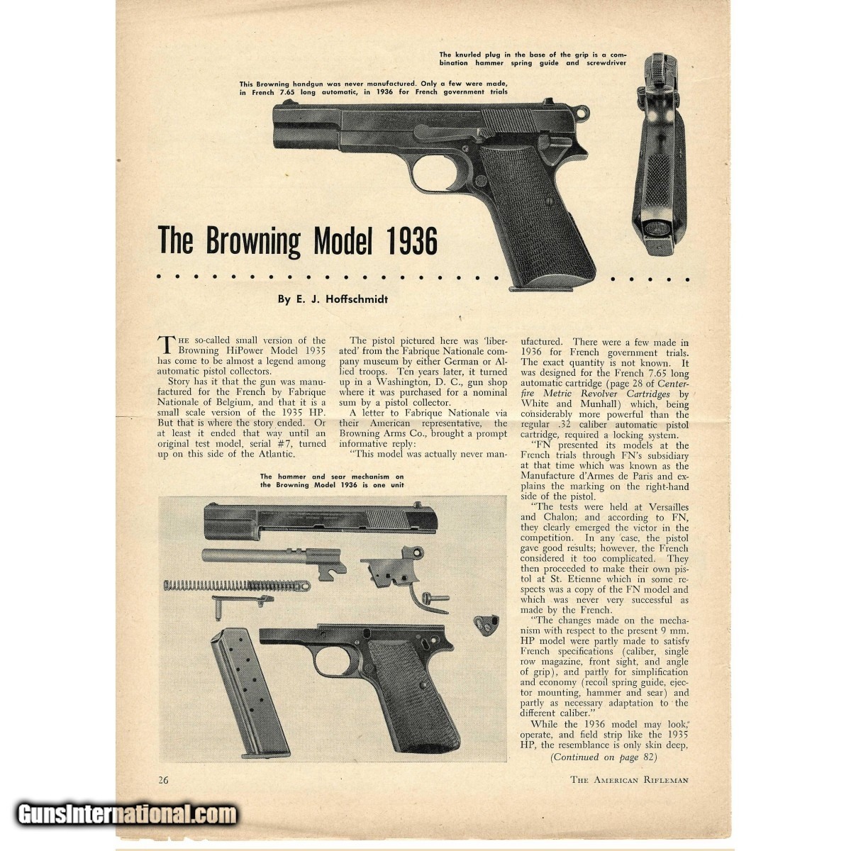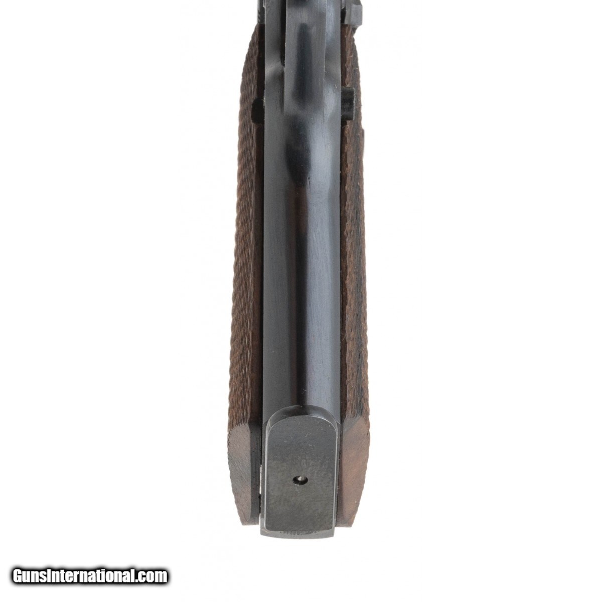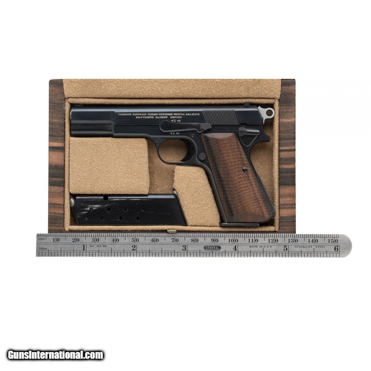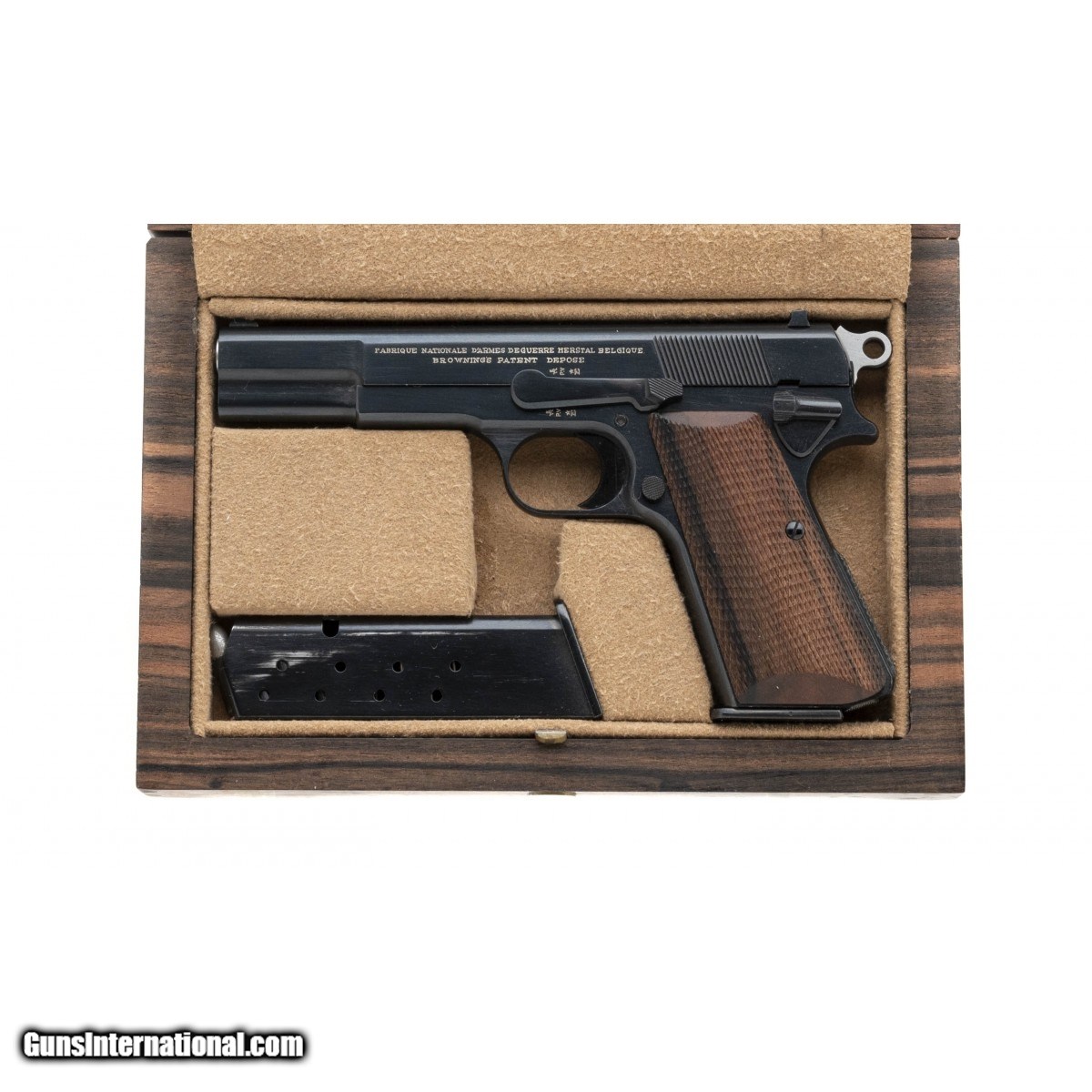 Description: "Serial number 7. Beautiful miniature by the master maker Raymond Hutchens. This is a miniature of an experimental Browning hi power with a single stack magazine. This gun comes with two magazine and one of the magazines has four bullets. This gun comes in a suede lined burl wood box. This is a 1/3 scale Model SOLD |