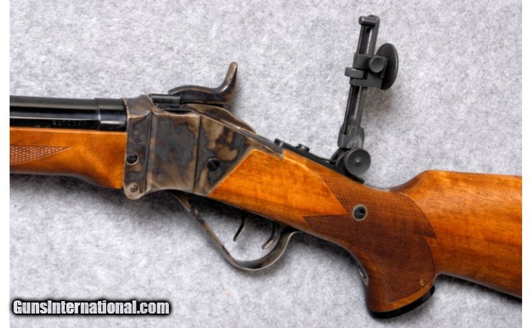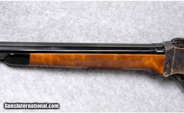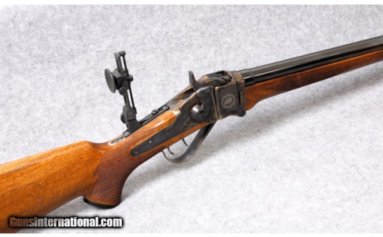 Description: SOLD Caliber Info: .45-70. Metal Condition: Case colored receiver, hammer, side plates, and trigger tang. Wood Condition: Excellent. Bore Condition: Excellent. Barrels: 34" heavy round barrel. Triggers: Double set triggers. Stock: DeLuxe checkered pistol grip stock with a black grip cap. Stock Dimensions: LOP: 15". Fore End: DeLuxe checkered fore end with a black end cap. Butt Pad: Checkered butt plate. Weight: 11 lbs. 5 oz. Sights: Hooded globe front sight with a level and a tang mounted, Creedmoor, Vernier peep sight. Extras: Comes with the original box. Item Location: Kansas City, KS |