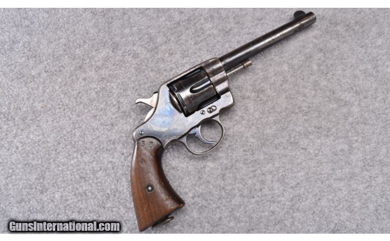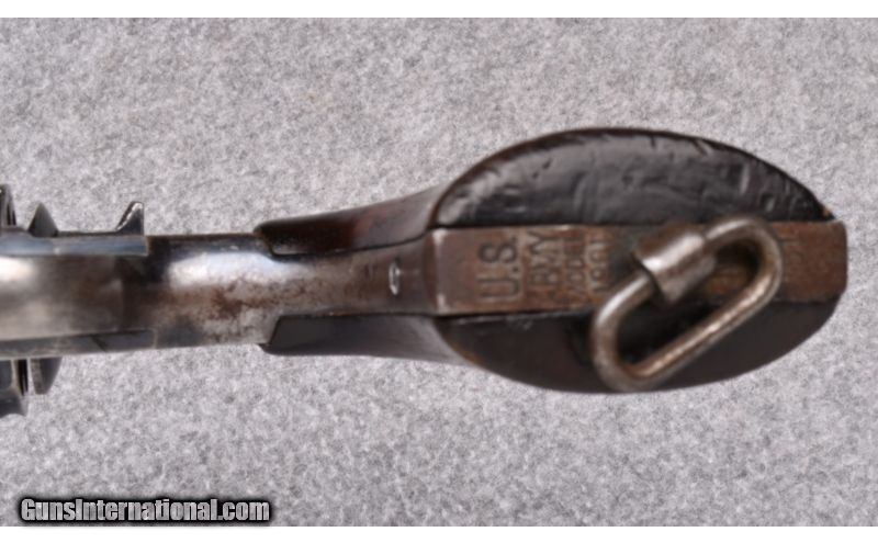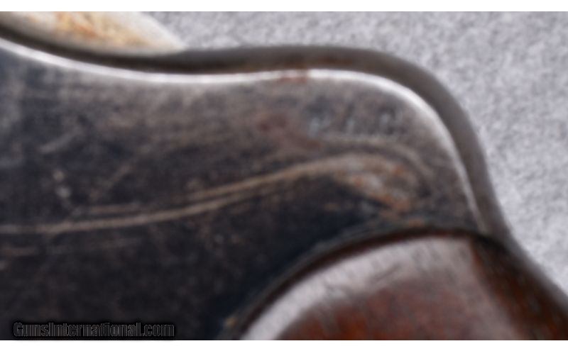 Description: Shows thinning blue throughout with areas of old pitting. Grips show carry wear and remain free of cracks. Right grip panel stamped with number "55". Left side stamped "R.A.C." Bottom of grip-frame"U.S. Army" marked. Bore and chambers could use a good cleaning. Mechanical function remains excellent. SOLD Curio/Relic: Yes Manufacturer: S/N 152XXX Caliber Info: .38 Long Colt Metal Condition: Fair Wood Condition: Fair Bore Condition: Good Barrels: 6 Triggers: Original Stock: Uncheckered Walnut Weight: 32 OZ Sights: Blade Front - Notch Rear Item Location: Wheeling, WV |