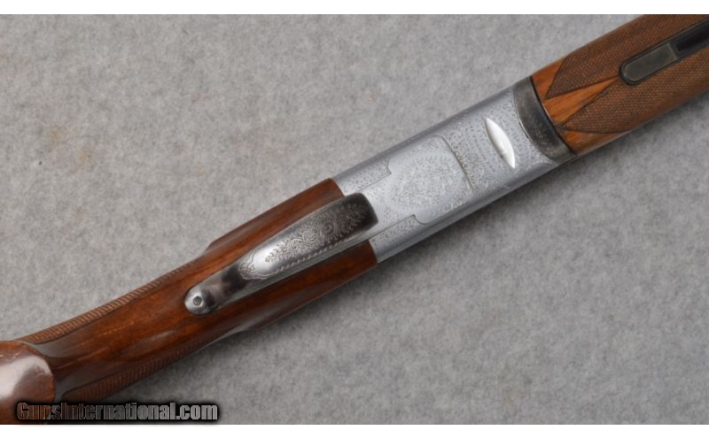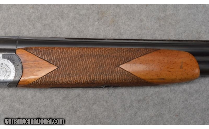 Description: This is a Franchi Aristocrat Field in 12 Ga. The gun is in good condition with original finish which reflects wear consistent with field use. The walnut stock has some dings and handling marks. The bores are bright and shiny. There is a 2” crack in the fore end which can be seen in the pictures of the underside of the gun. The crack is marked with red arrows. SOLD Manufacturer: 1965 Caliber Info: 12 ga. Chambers: 2-3/4" with ejectors. Metal Condition: Original finish reflects field use consistent with age. Wood Condition: Fore end has been refinished and shows a two inch crack trailing rearward off of the release. Bore Condition: Shows some fouling at the forcing cones, but otherwise good. Barrels: 28" blued with vent rib. Triggers: Blued single selective trigger. Stock: Walnut with checkered pistol grip. Stock Dimensions: 14 1/4" LOP; 1 1/2" DAC; 2 1/4" DAH Fore End: Matching checkered walnut. Deeley release - Note that the rear section of the release carrier does not anchor securely to the internals. Butt Pad: Black plastic butt plate. Weight: 7-1/4 lb. Sights: Brass bead mid and front on the vent rib. Chokes: Fixed full over modified. Item Location: West Chester, OH |