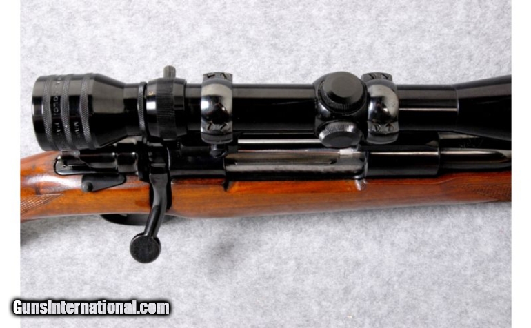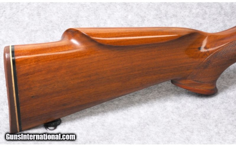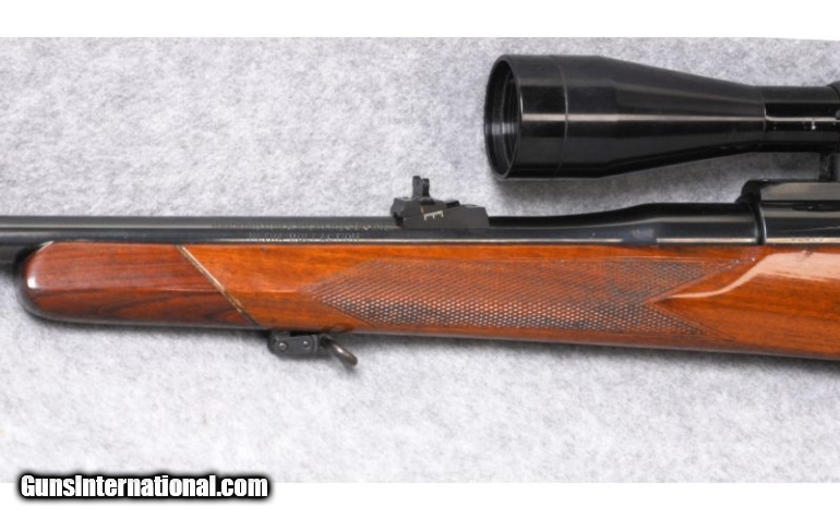 Description: SOLD Caliber Info: .30-06. Metal Condition: Blue-black receiver with a claw extractor, right-hand safety, cocking indicator, left side bolt release, and flat bolt handle. Wood Condition: Heat cracks in the finish on the stock. Bore Condition: Excellent. Barrels: 22" round barrel. Triggers: Smooth surface, adjustable trigger. Stock: High gloss finish,straight grain walnut, checkered pistolg rip stock with a flared, mahogany pistol grip cap, cheek piece, checkered fore endend reverse mahogany fore end tip and sling studs. Stock Dimensions: LOP: 13 3/4". Fore End: Checkered. Butt Pad: 1/2" H&R rubber recoil pad. Sights: Ramped blade front and single adjustable rear sight, Redfield 3 x 8 x 33mm fine cross hair scope and bases. Item Location: Kansas City, KS |