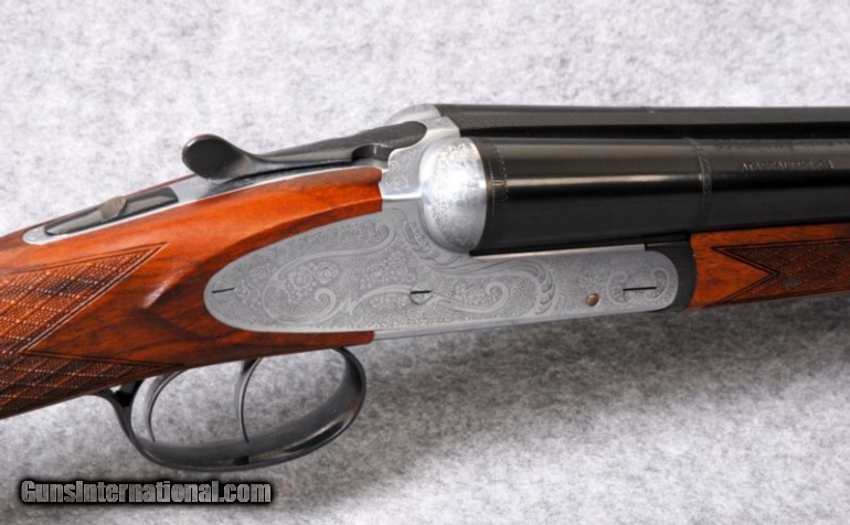 Description: SOLD Caliber Info: 12 gauge. Chambers: 3" chambers. Metal Condition: Gray side plate receiver with full coverae engraving, engraved top lever and upper tang, with an upper tang, left barrel first, non-selective trigger and nn-automatic safety. Wood Condition: Excellent. Bore Condition: Excellent. Barrels: 28" barrels with a knurl surface. Triggers: Double triggers. Stock: Basket weave, satin finish straight -hand stock and smooth rubber recoil pad. Stock Dimensions: LOP: 14 3/8". Fore End: Basket weave checkered fore end with a push-button release. Butt Pad: Rubber recoil pad. Weight: 7 lbs 3 oz. Sights: Brass front bead, Chokes: Screw-ins. Extras: Original box with accessories and tubes. Item Location: Kansas City, KS |