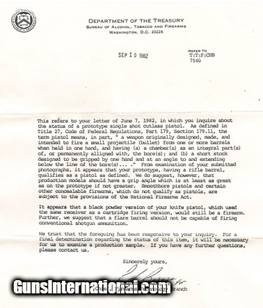Description: Powell & Brown Cutlass .22 LR caliber knife pistol. Rare and unusual knife pistol, 1980’s vintage. This is not a Class III item, and comes with a letter from the ATF stating such. A very neat piece, in excellent condition with scabbard and box. A very early model.