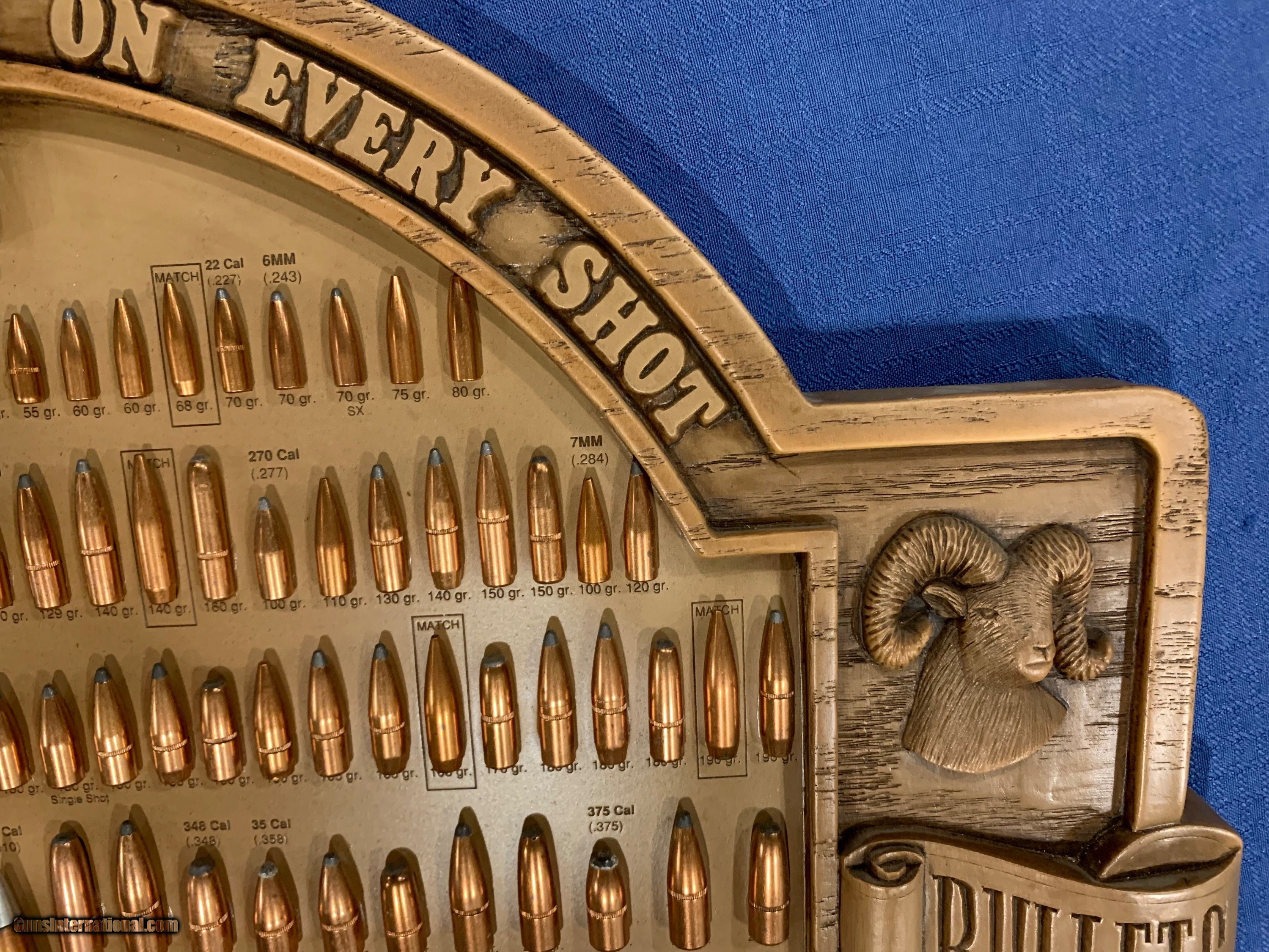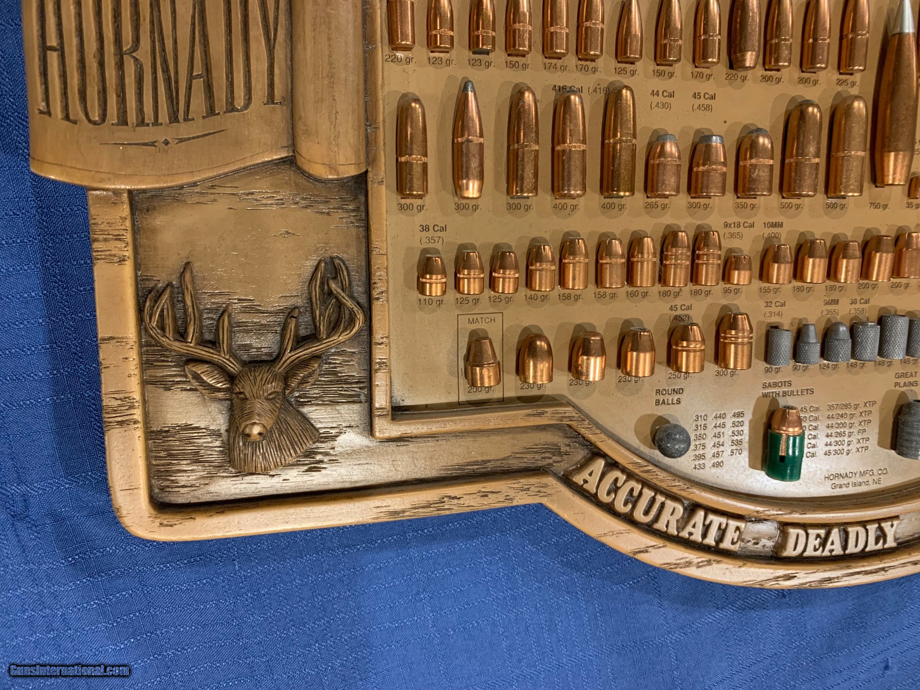Description: Here's a mint Hornady Bullet Board . One of the last bullet boards that used real cartridges! !super nice original condition . Comes with all the original cartridges., these Bullet boards are getting tuffer and tuffer to find ! Near mint condition! Please review my photos and email me with any questions ? 3 day inspection as allways ! Thank you for looking, Little Jo SOLD |