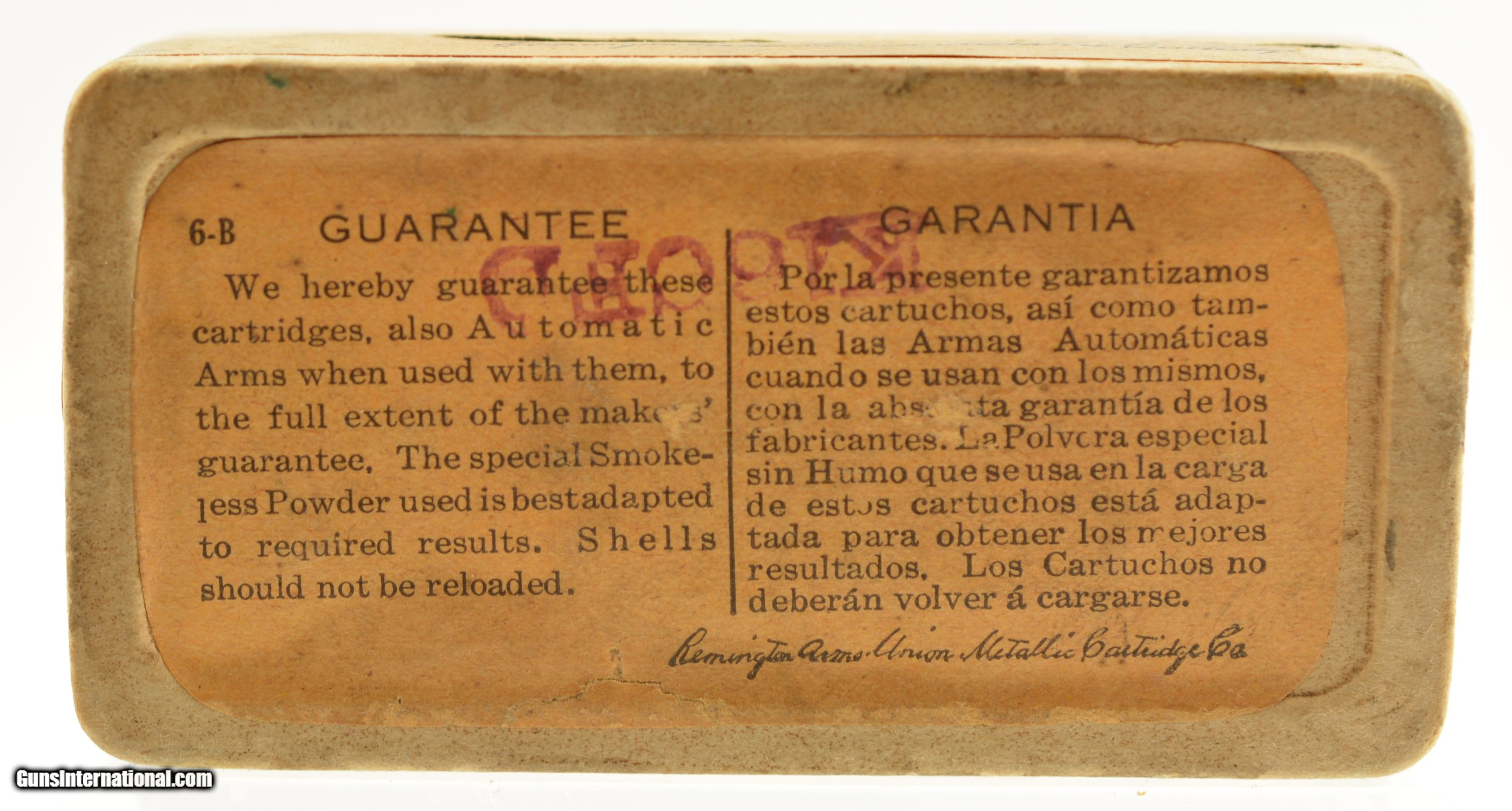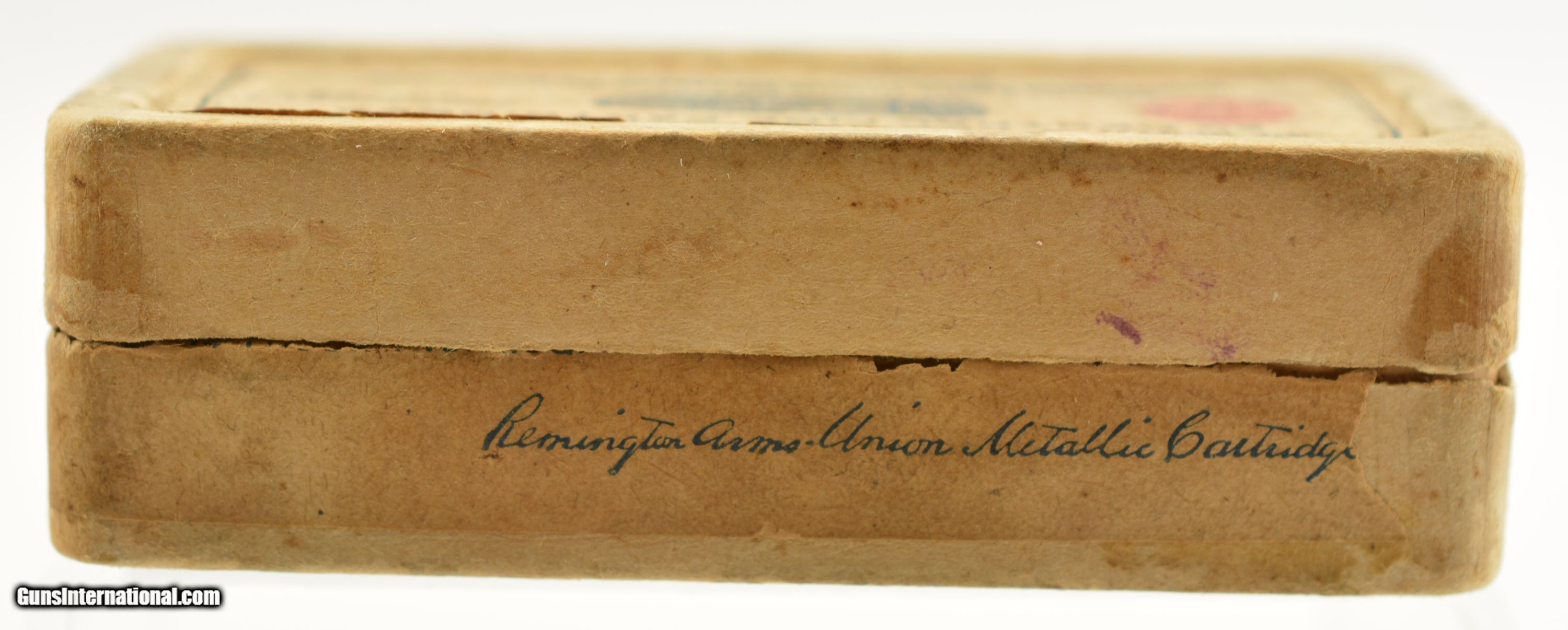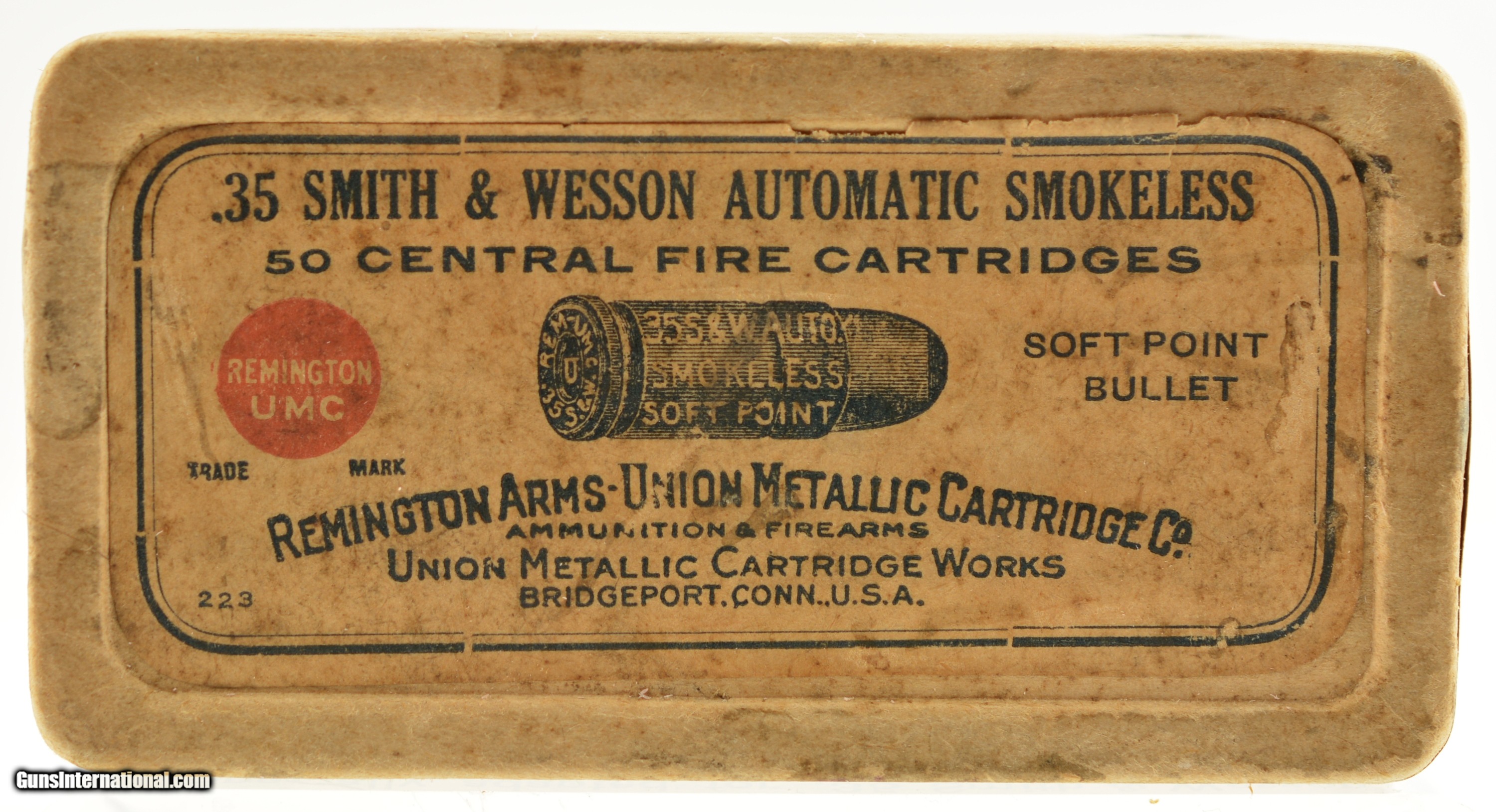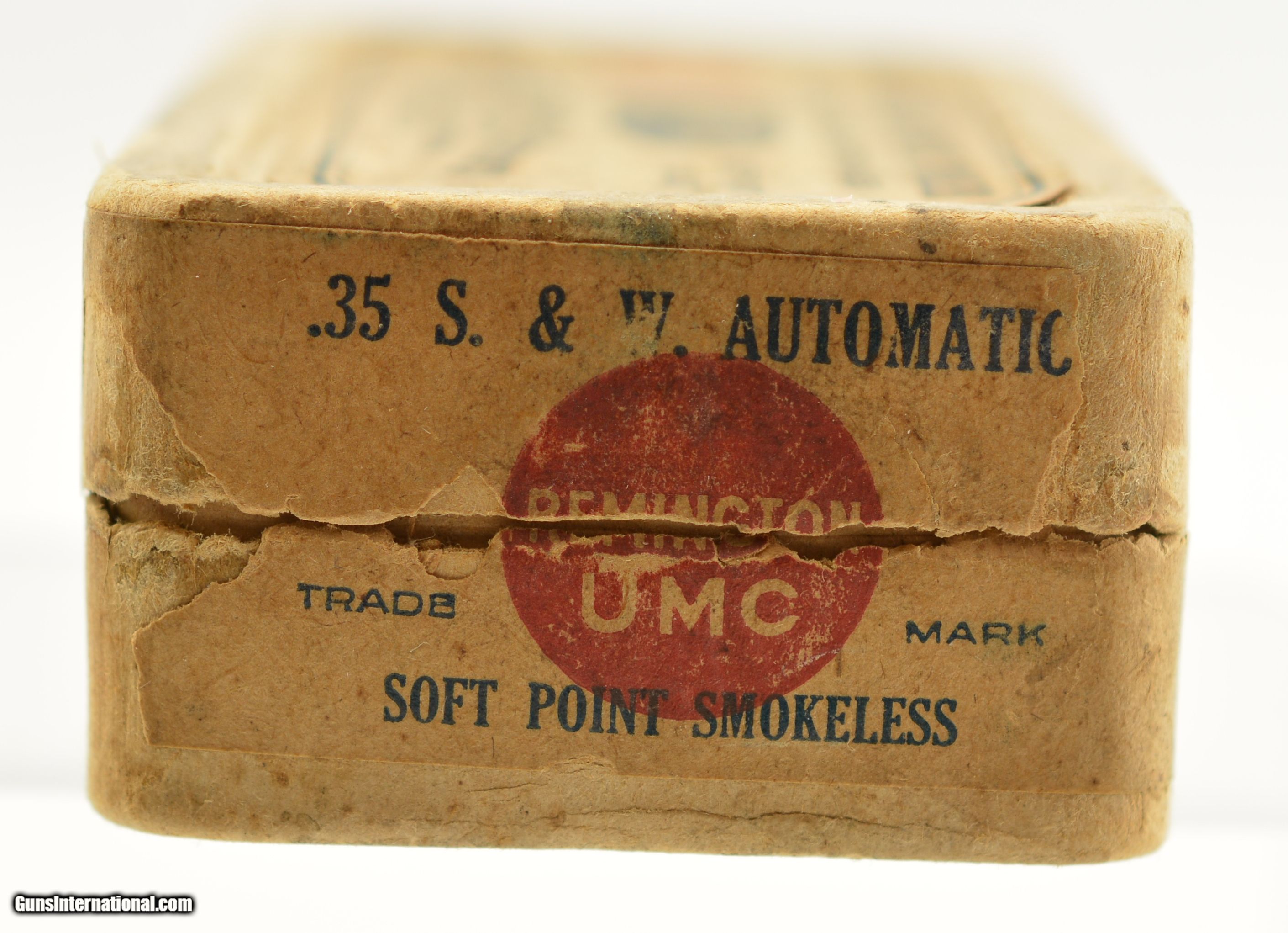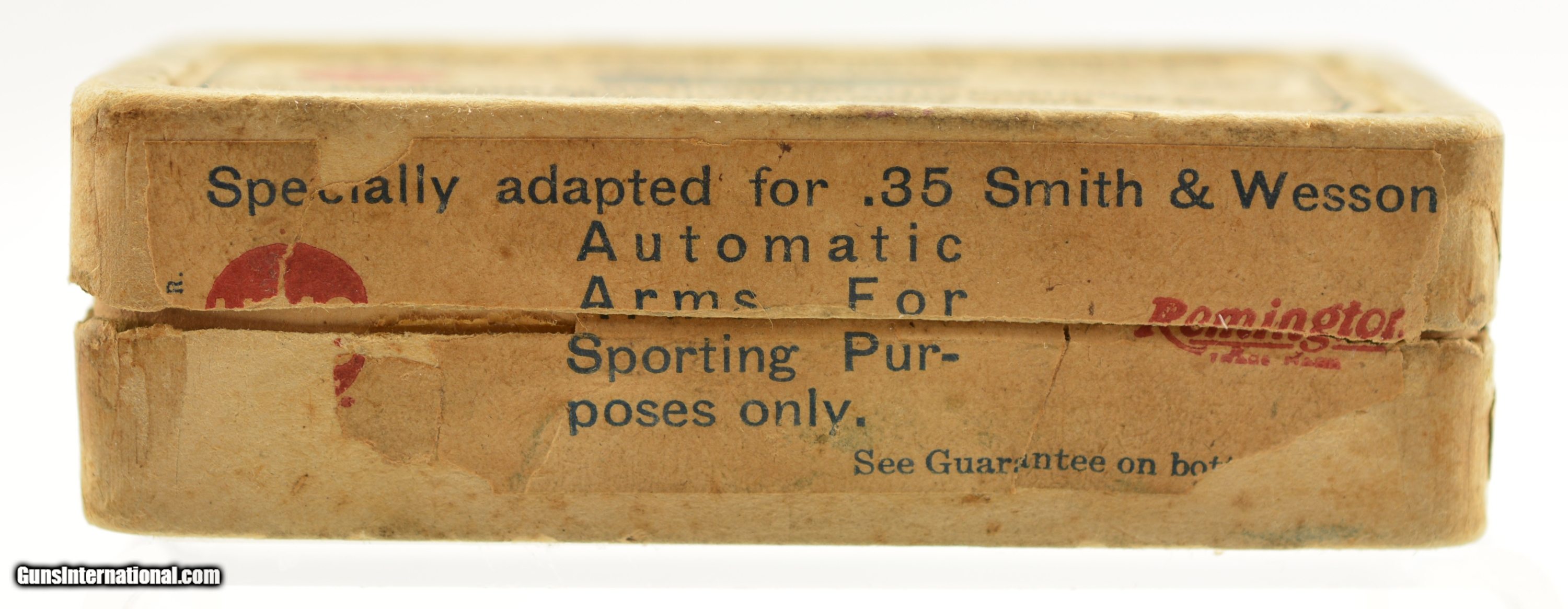 Description: This is a full box, 50 original rounds, of .35 Smith & Wesson auto ammunition manufactured by Remington UMC with scarce soft point bullet loading. The early pre-WWI (circa 1913-1915 box style) two piece, half-split box round corner box is among the earliest loading in this caliber (introduced in 1913) from Rem-UMC. In very good plus condition the box is solid with a fully intact primary label with 50-55% of the side label showing some overall age soiling and light staining. The cartridges are in excellent condition and appear native to the box. An early example of this short lived caliber with commercial loadings ceasing before WWII. SOLD |