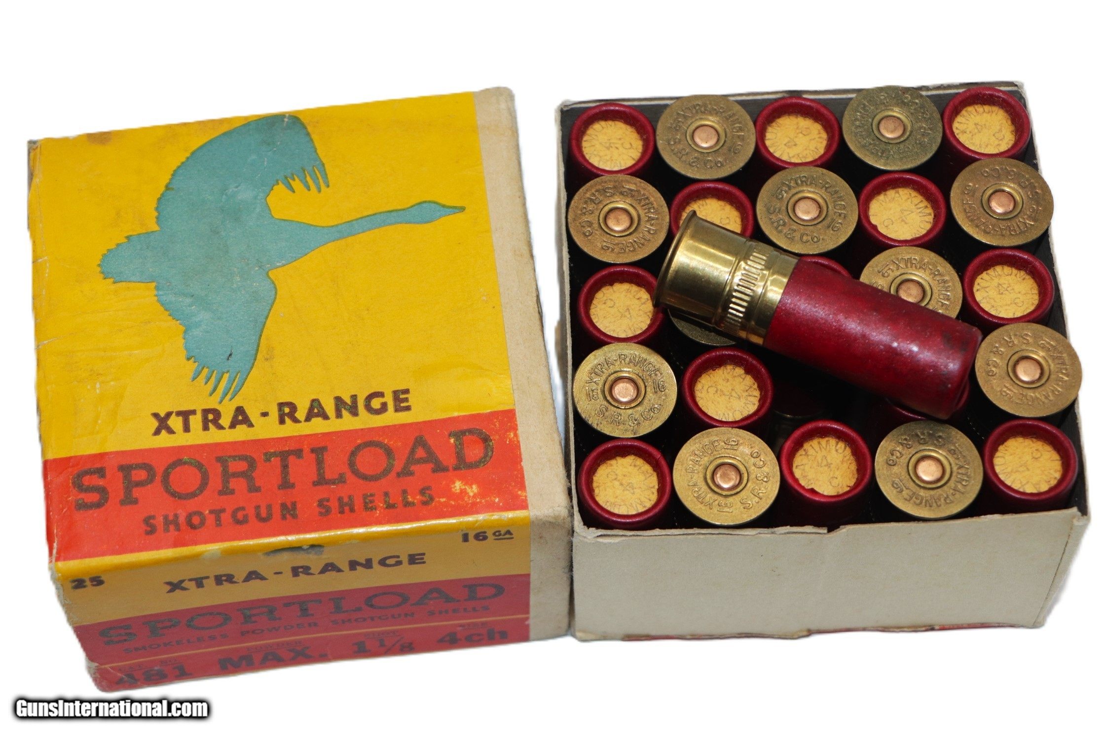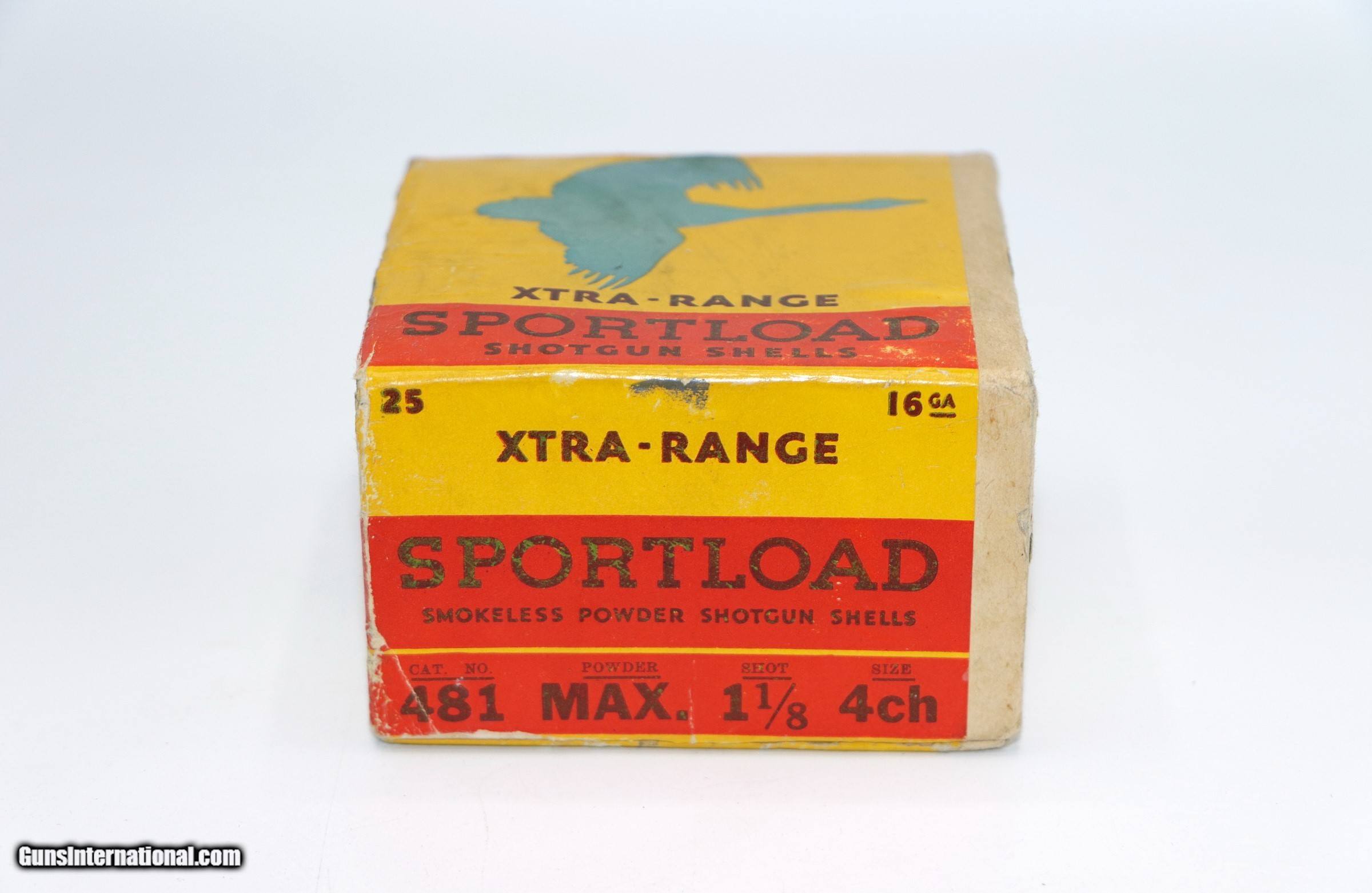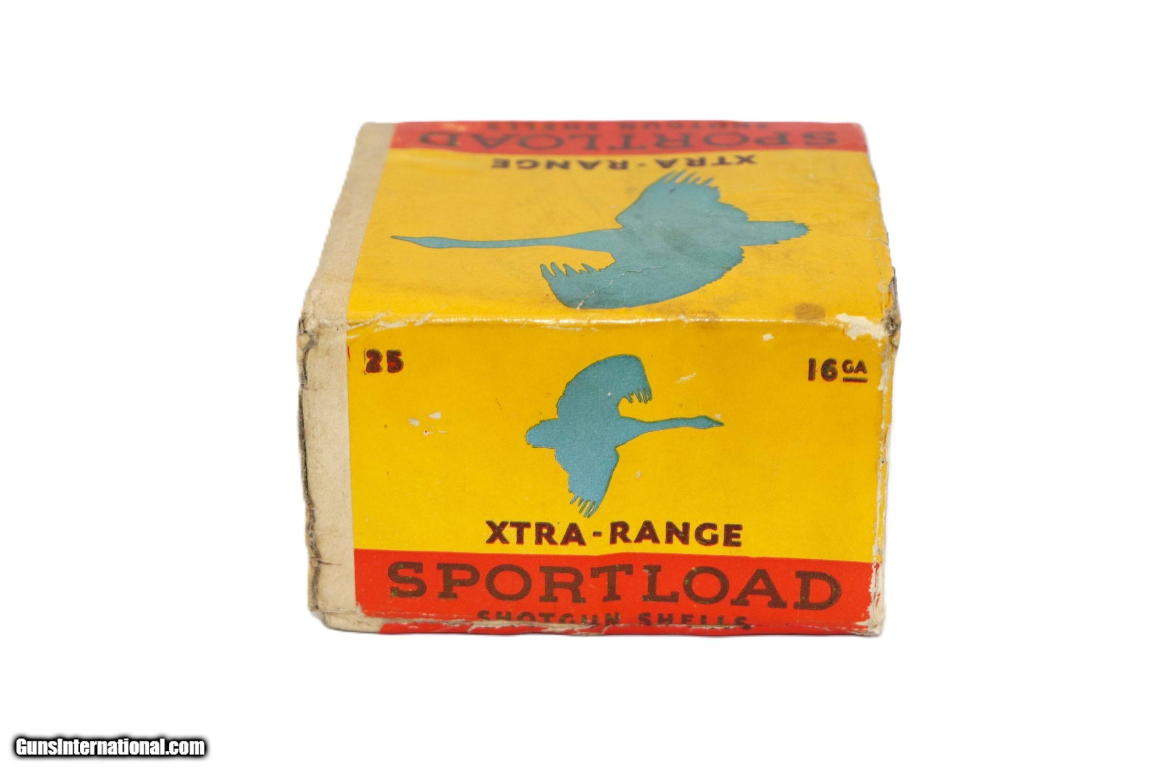 Description: Sears Sportload, 16 Gauge, Shot Size 4CH, 2 Piece Shotgun Shell Box, 25 Excellent Rounds. Box is VG with tape repair on top half of box. Add $15 S+H SOLD Shotgun Gauge: 16 Gauge |