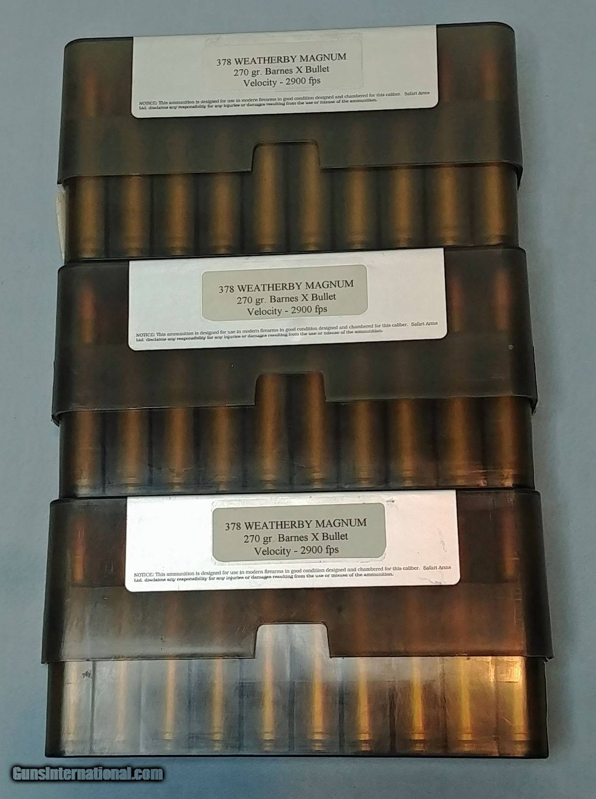 Description: Three Boxes of 20 Each of Safari Arms 378 Weatherby Magnum 270 Grain Barnes X-Bullets. Sixty Rounds total. Shipping will be the exact amount for a 7 lb 6 oz box 10"x8"x5" by UPS Ground. Send me your address and I'll give you the shipping amount. SOLD Rifle Caliber: .378 Weatherby Magnum |