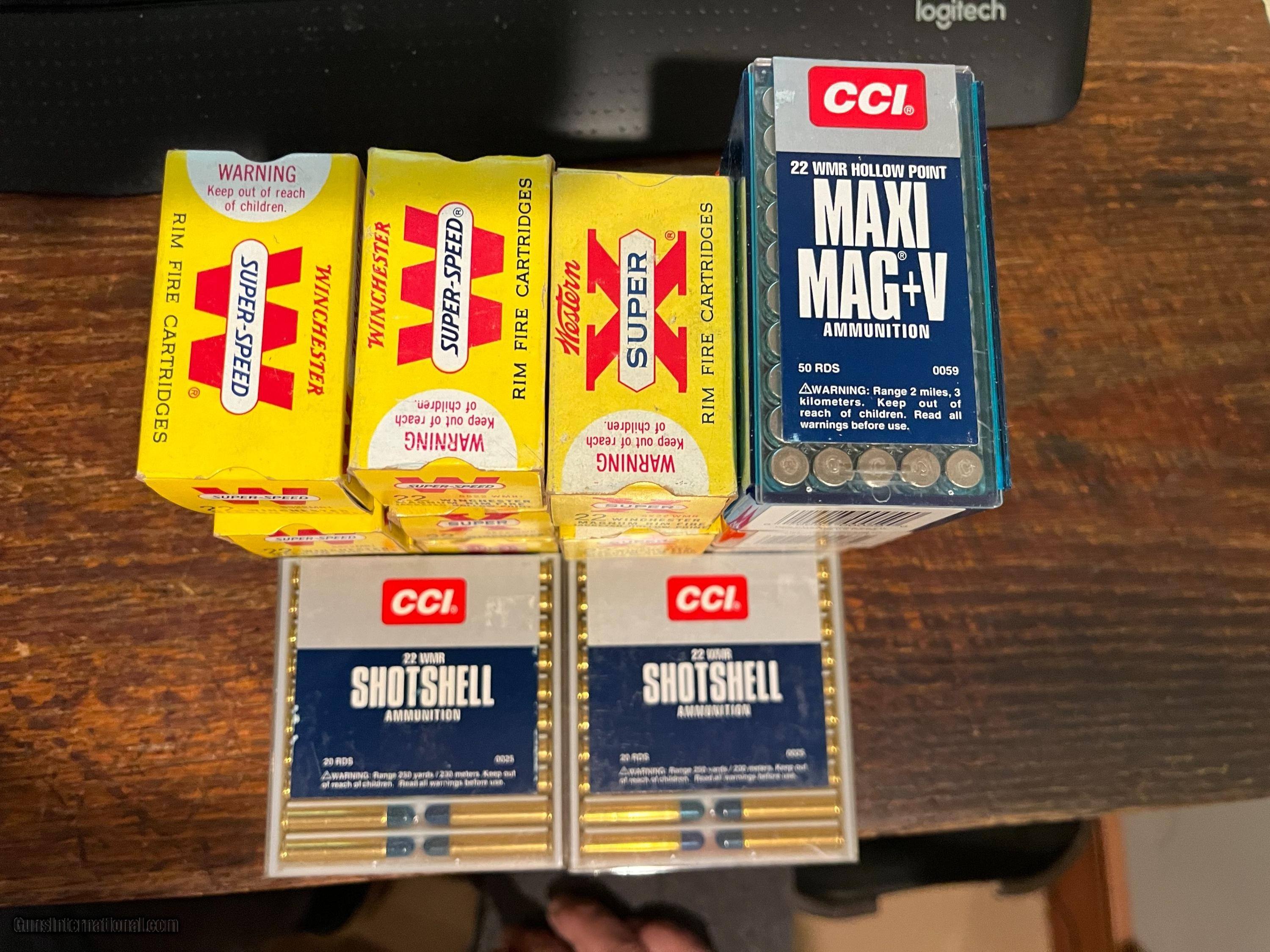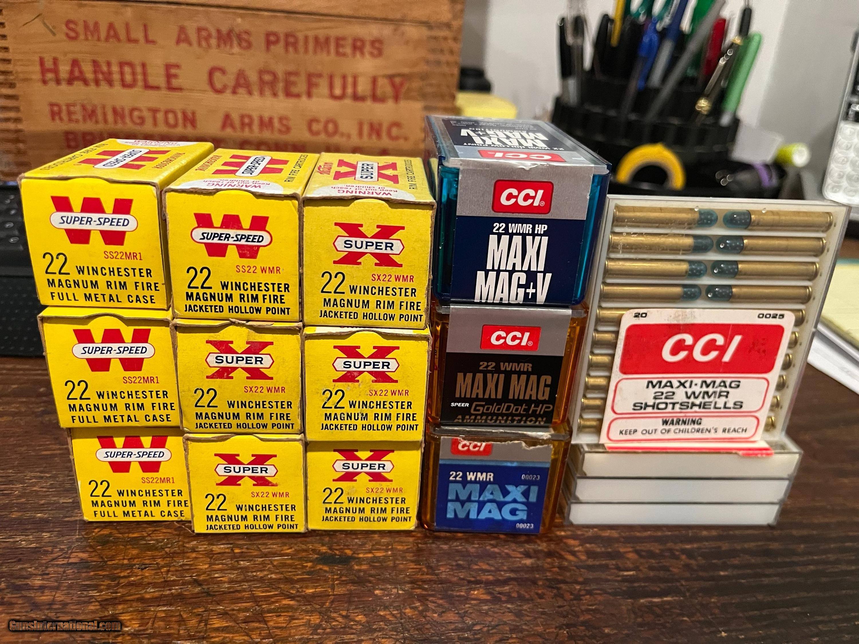 Description: LOT PRICE $225 All factory fresh 22 Mag ammo 1. 3 boxes of 50 CCI hollow point 2. 4 boxes of 20 CCI Shot Shell 3. 3 boxes of 50 Winchester 40 grain FMJ 4. 6 boxes of 50 Winchester 40 grain JHP SOLD Rifle Caliber: .22 WMR (.22 Magnum) Handgun Caliber: .22 WMR (.22 Magnum) |