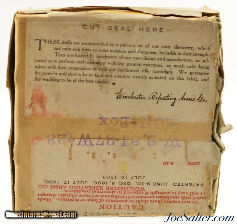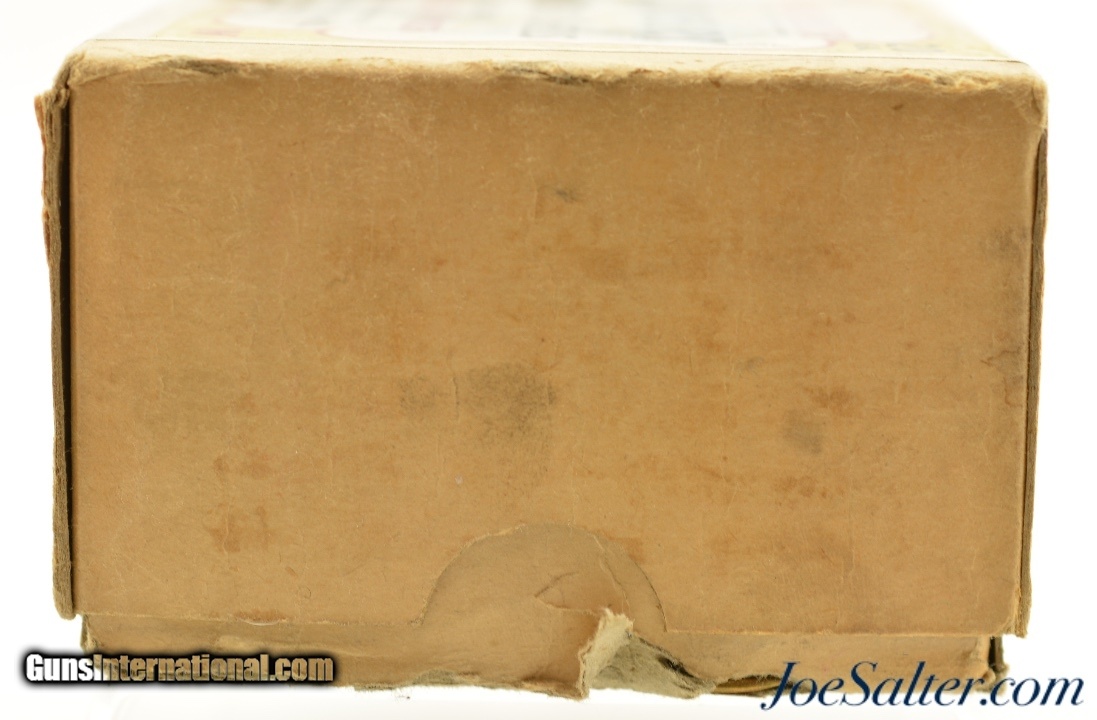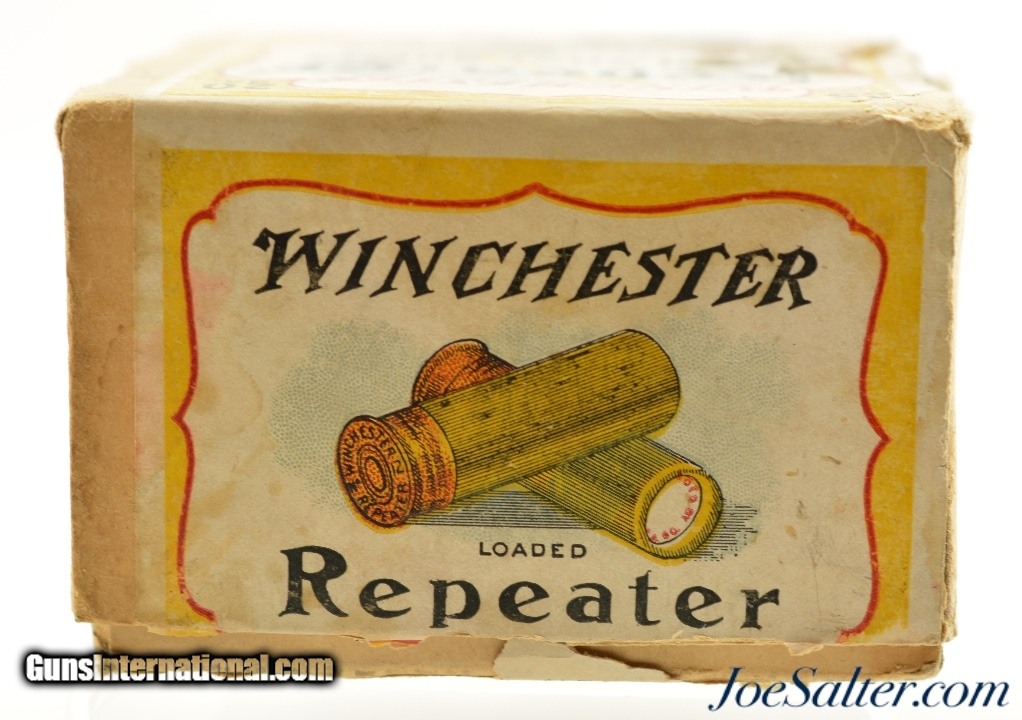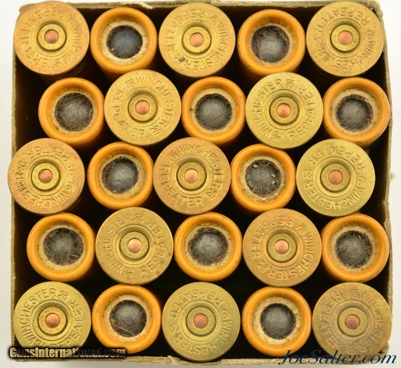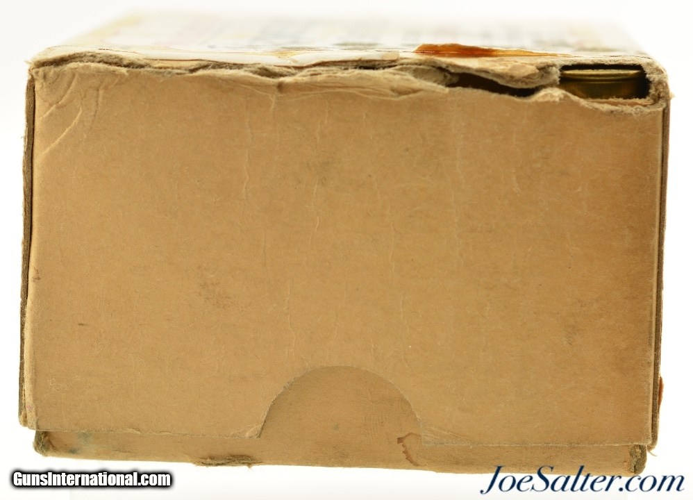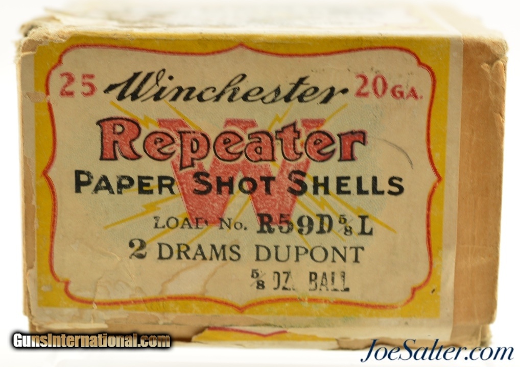 Description: This is a full box, 25 original rounds, of 20 Gauge paper shotgun shell ammunition loaded with 5/8 ounce ball load manufactured by Winchester. The two piece Repeater box has excellent side label graphics with a seam separation and tears to the top left side and separation of one bottom side. The paper hull shotgun shells are in excellent condition. SOLD |