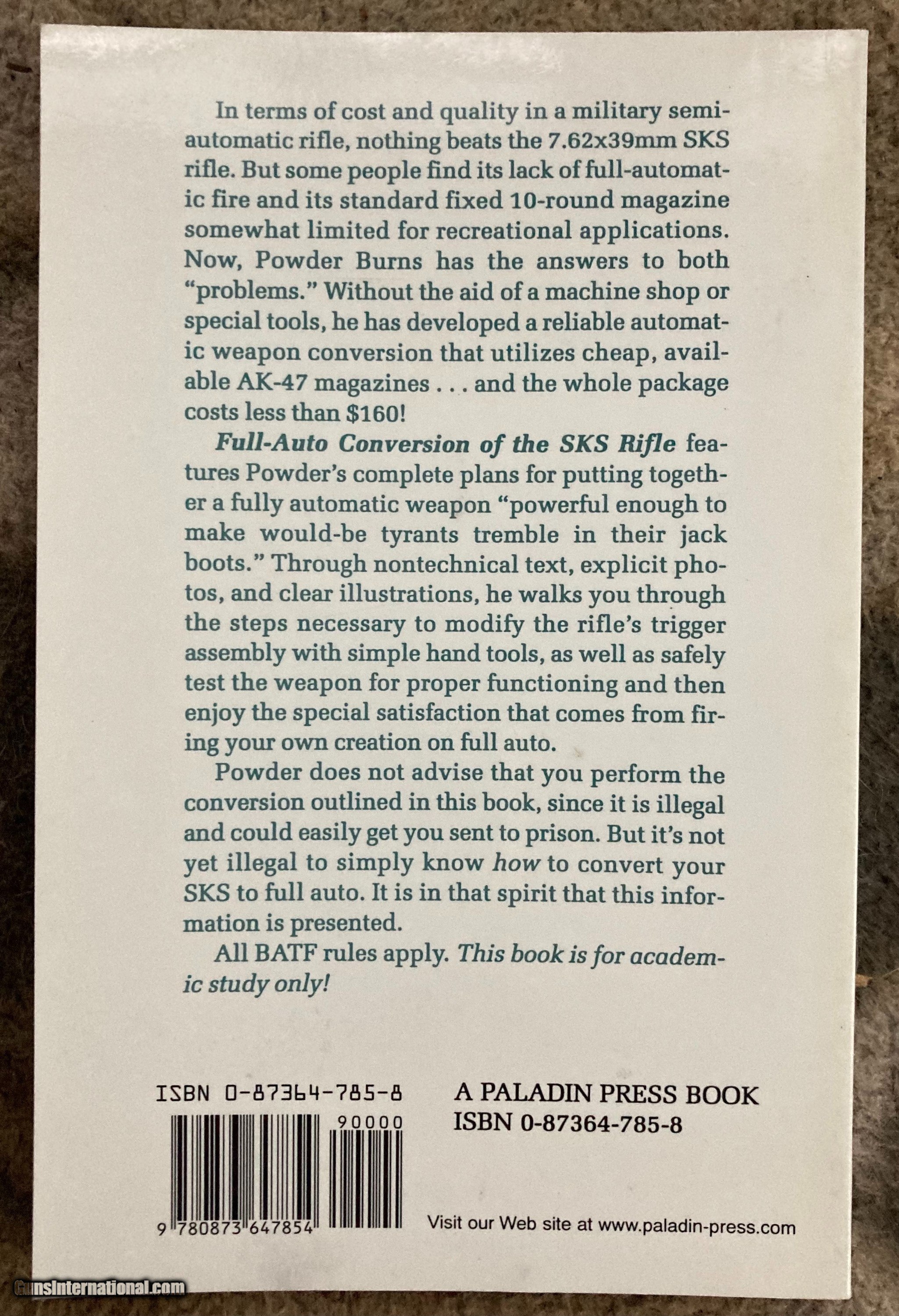 Description: Sale Pending Full-Auto Conversion of the SKS Rifle, Powder Burns, ISBN 0-87364-785-8 out of print and hard to find. Priced way less than the only copies I could find. Shipped USPS 1st class with tracking for free. SOLD |