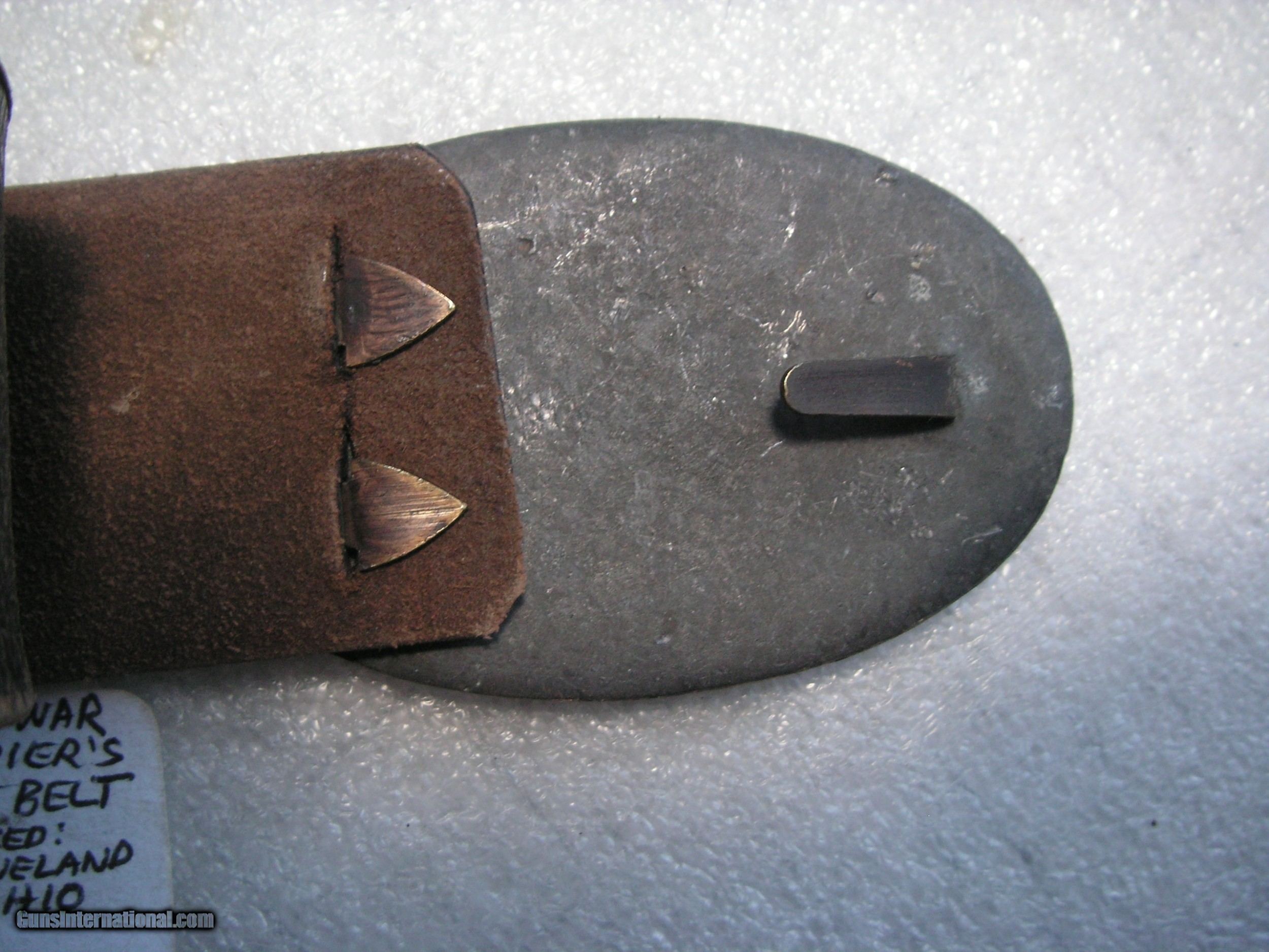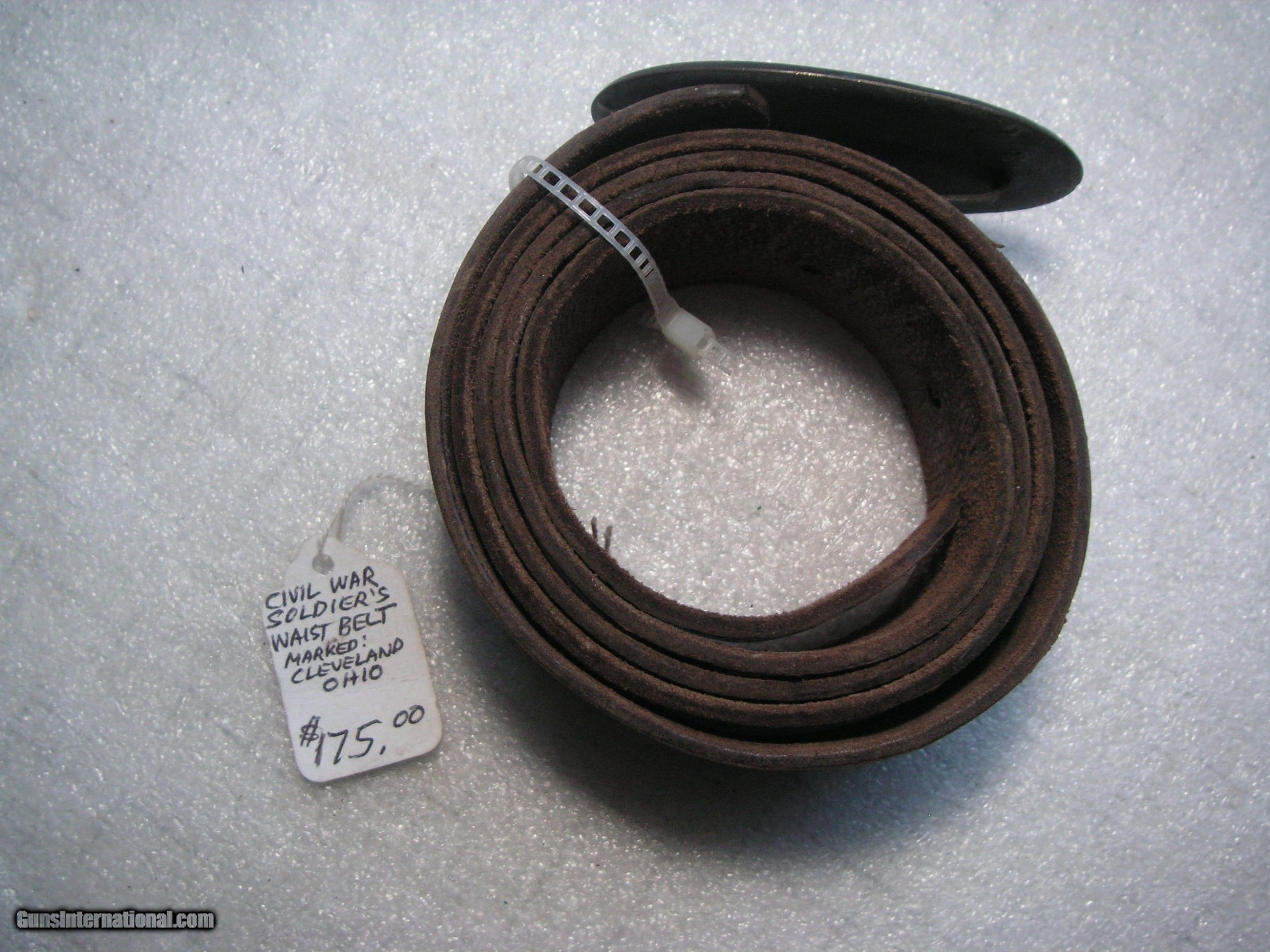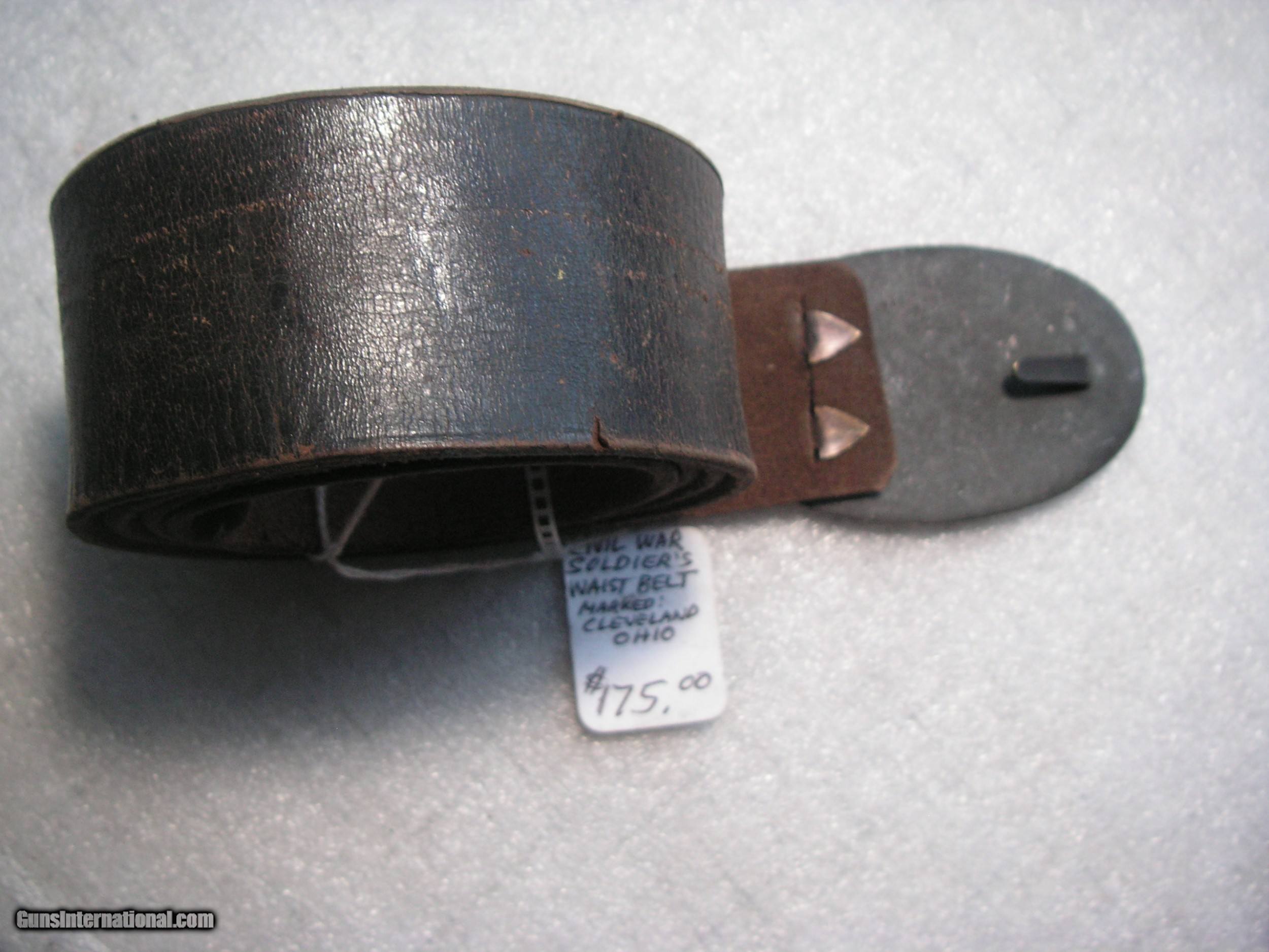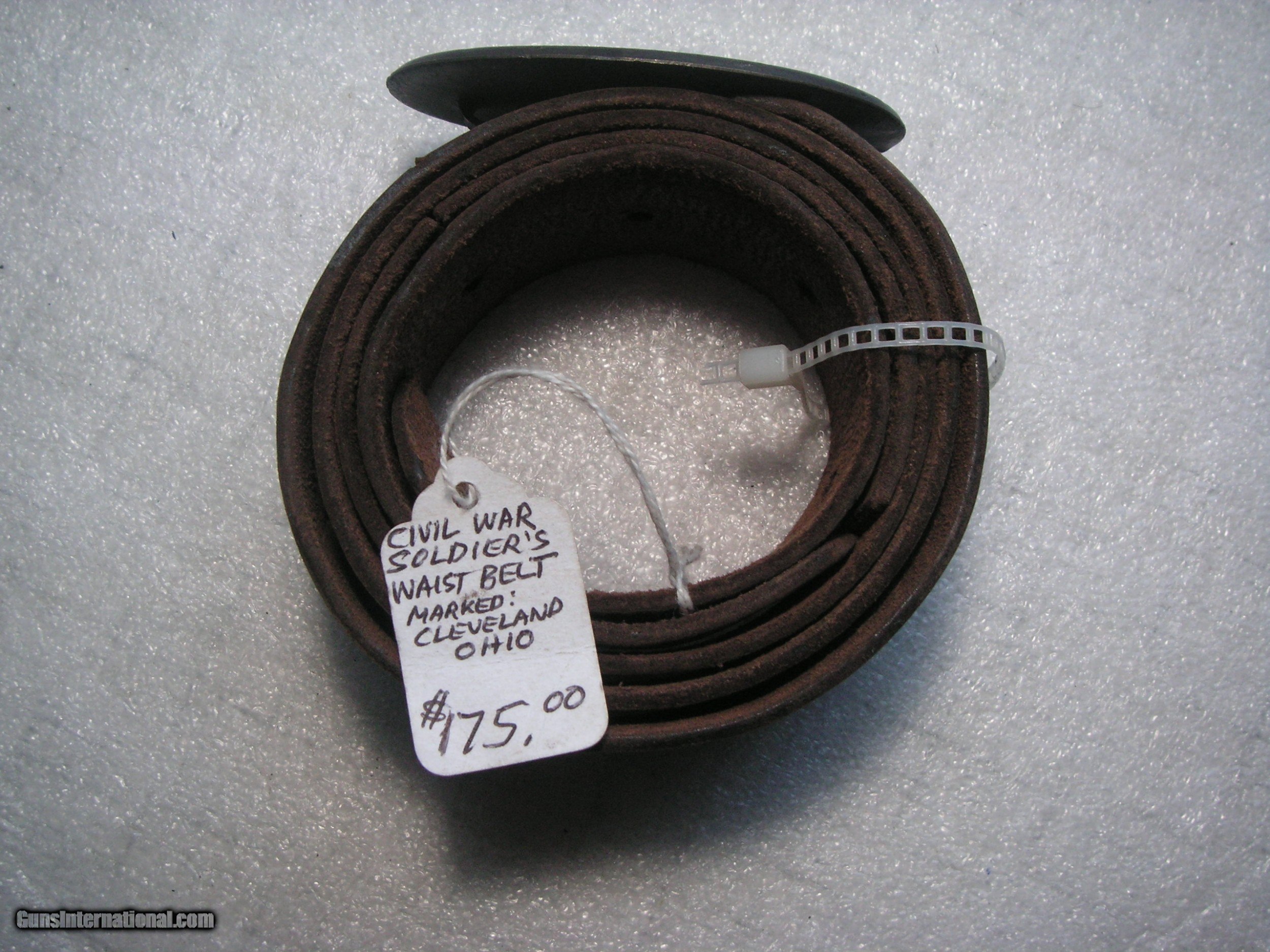 Description: SEE THE PICTURES OF THIS RARE CONDITION CIVIL WAR SOLDIER WAIST BELT MARKED CLEVLAND OHIO IN GOOD ORIGINAL CONDITION. PRICE $175 PLUS $19 SHIPPING. SOLD |