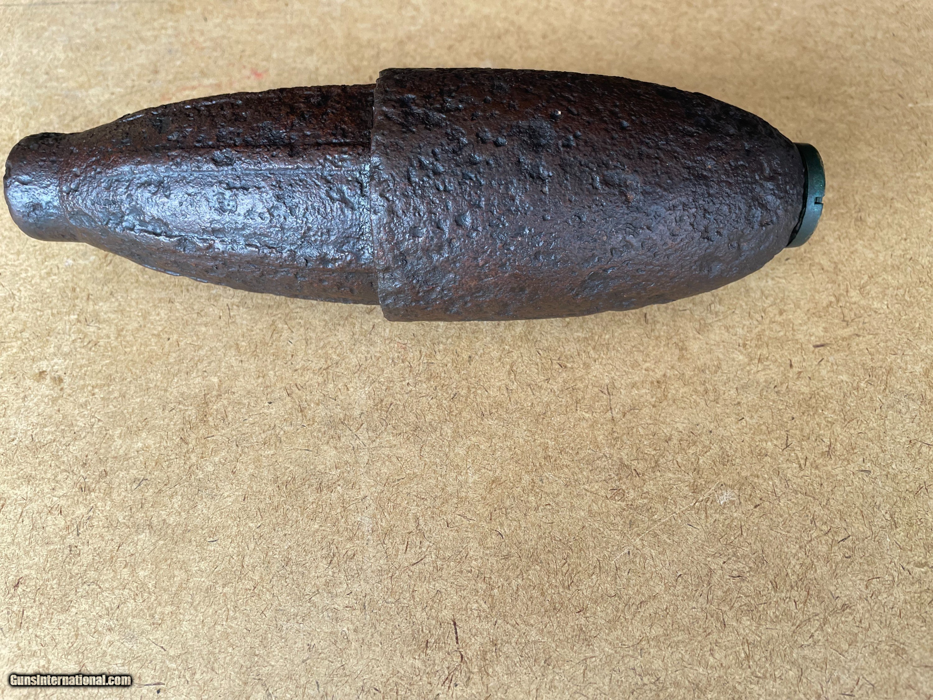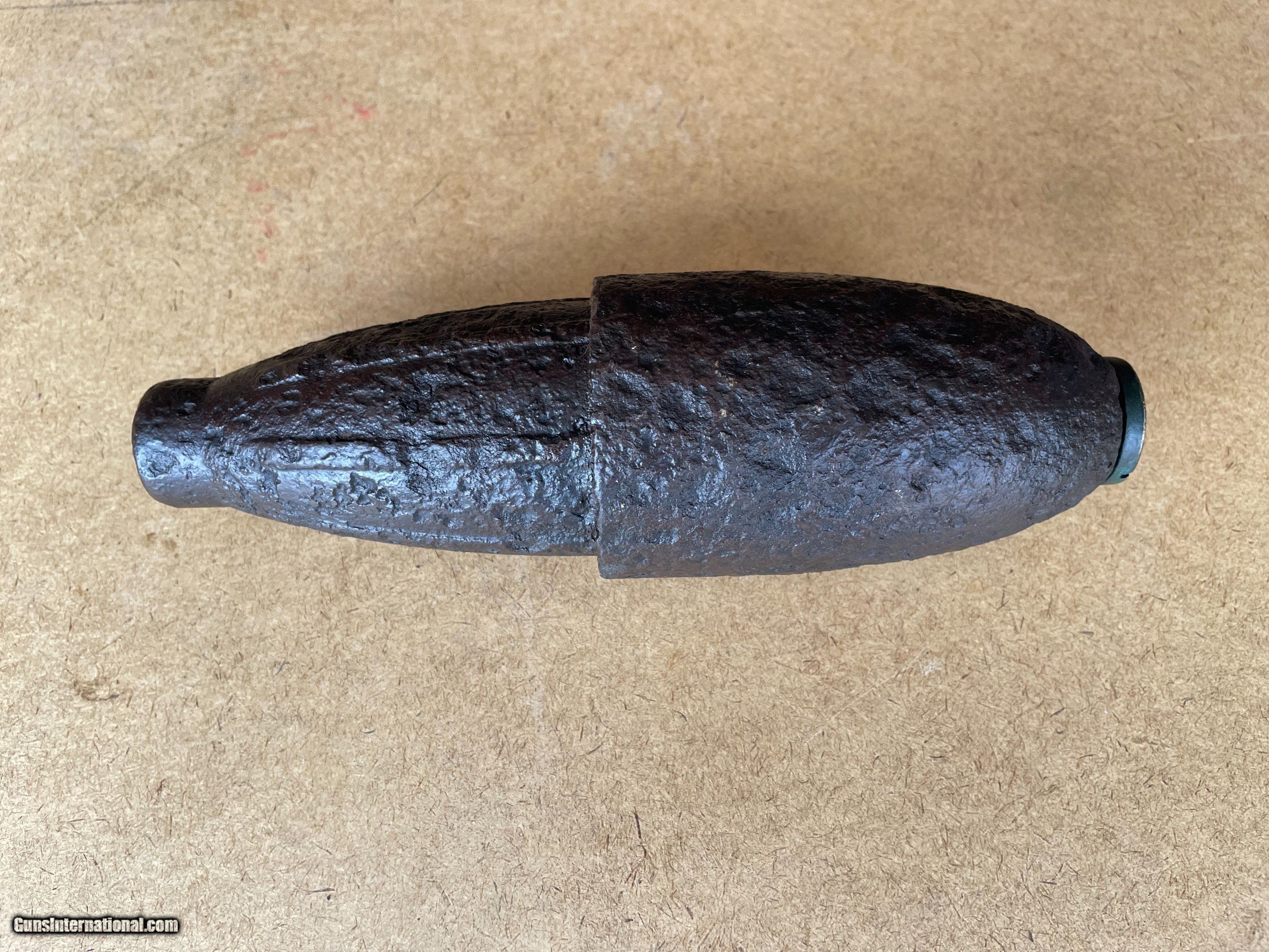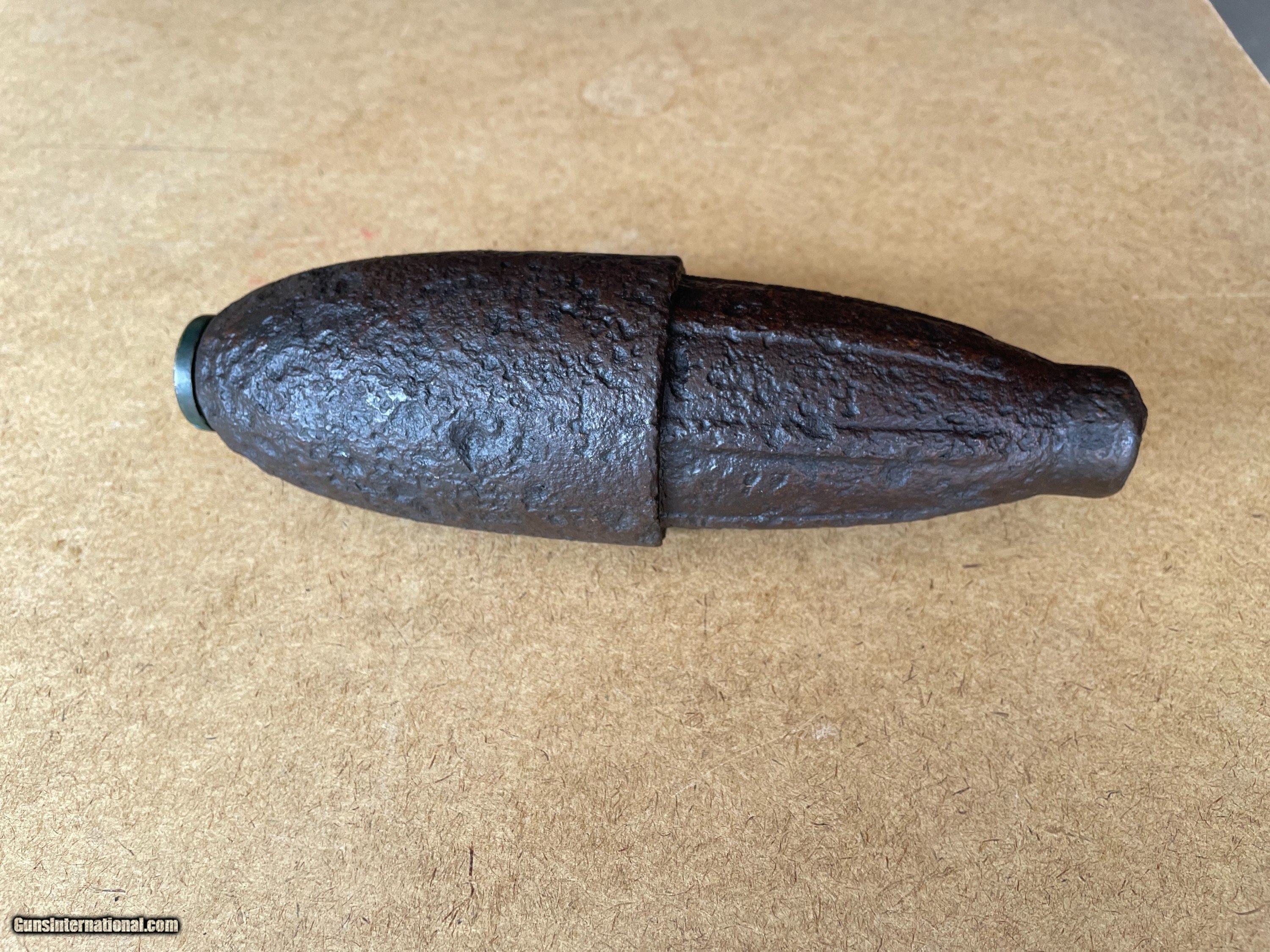 Description: Original Civil War Federal US Army Schenkl Artillery Shell 3-Inch Ordnance Rifle. Up for grabs is a beautiful 3-Inch Ordnance Rifle Schenkl Artillery Shill in dug relic condition. Someone did an outstanding electrolysis cleaning preserving this iron Civil War relic. The fuze, Schenkl percussion, is in very good uncleaned original condition with a 1861 patent date. Please email if you have any questions. A+ rating on GB (joejoeandme) since 2001 and, 100% positive feedback on eBay(joejoeandme) since 1996. This is a real nice one don't let it get away. Thank you for looking. SOLD |