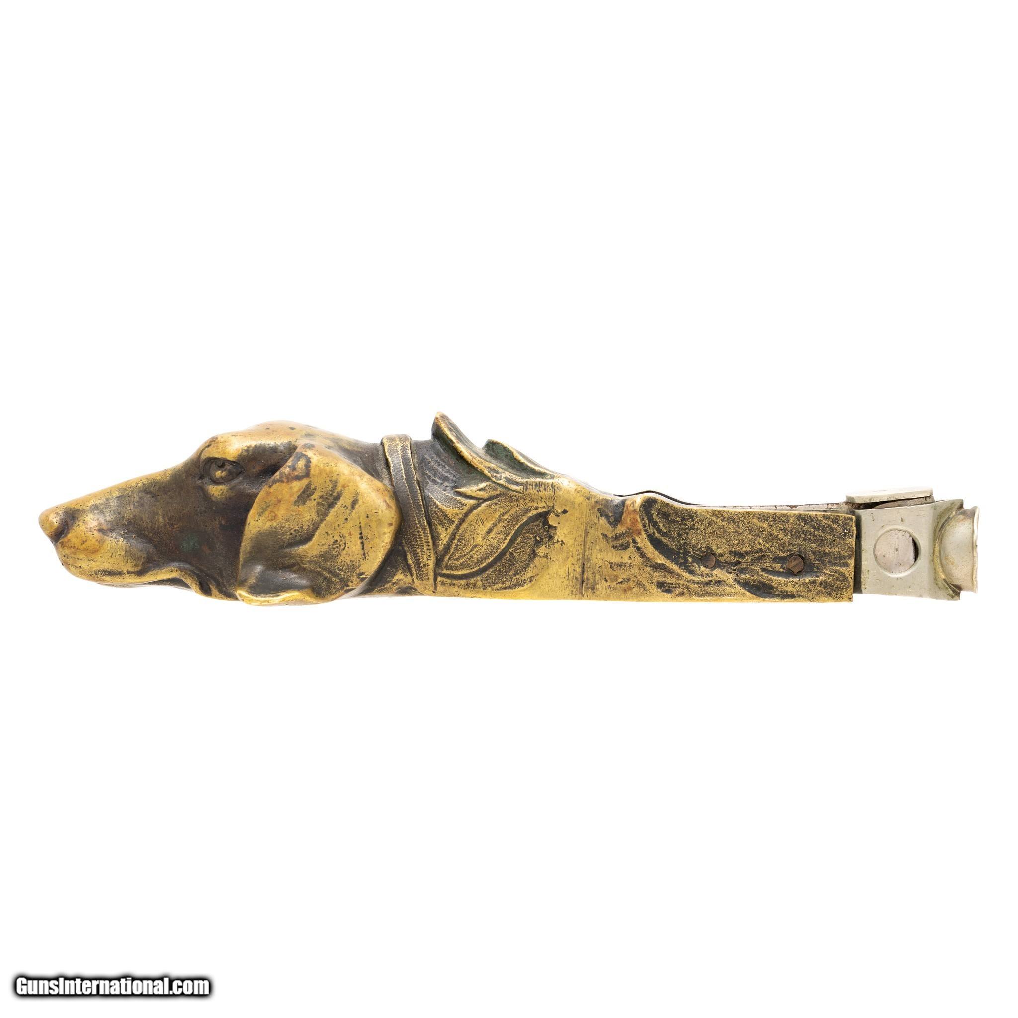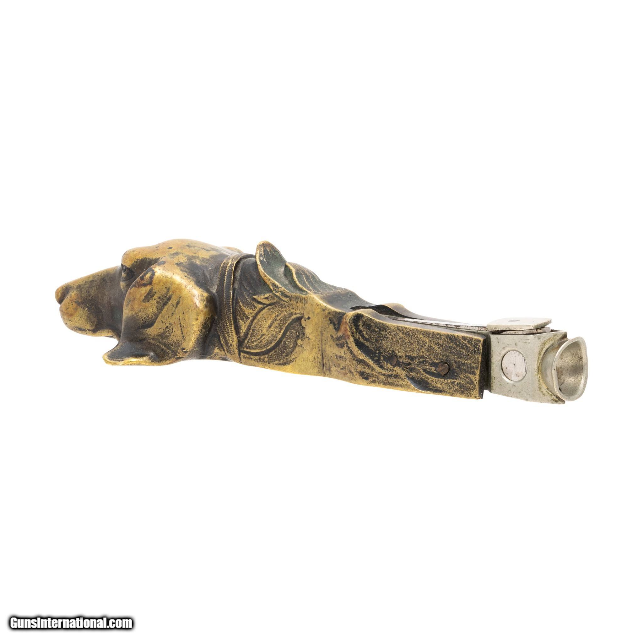 Description: 19th Century brass cigar cutter in the shape of dog head having a V cut. Looks to be a bird dog or pointer. Finish worn smooth from much use with great patina. Perfect addition to a tobacciana or smoking collection. Size: 1 1/4"H x 6 1/4"L x 2"W Family Owned & Operated Cisco’s Gallery deals in the rare, exceptional, and one-of-a-kind pieces that define the history of America and the Old West. Our pieces range from American Indian to Cowboy Western and include original items of everyday life, commerce, art, and warfare that tamed America’s frontier. Our 14,000 square foot gallery opened in 1996 in beautiful Coeur d’Alene, Idaho. Personal Service Cisco’s operates on old fashioned values – honesty and integrity, and all of our items are backed by our money back guarantee. We appreciate the opportunity to earn your business. Whether you desire assistance with a jewelry purchase, choosing a gift, identification, or even selling – we hope to be your trusted source. SOLD |