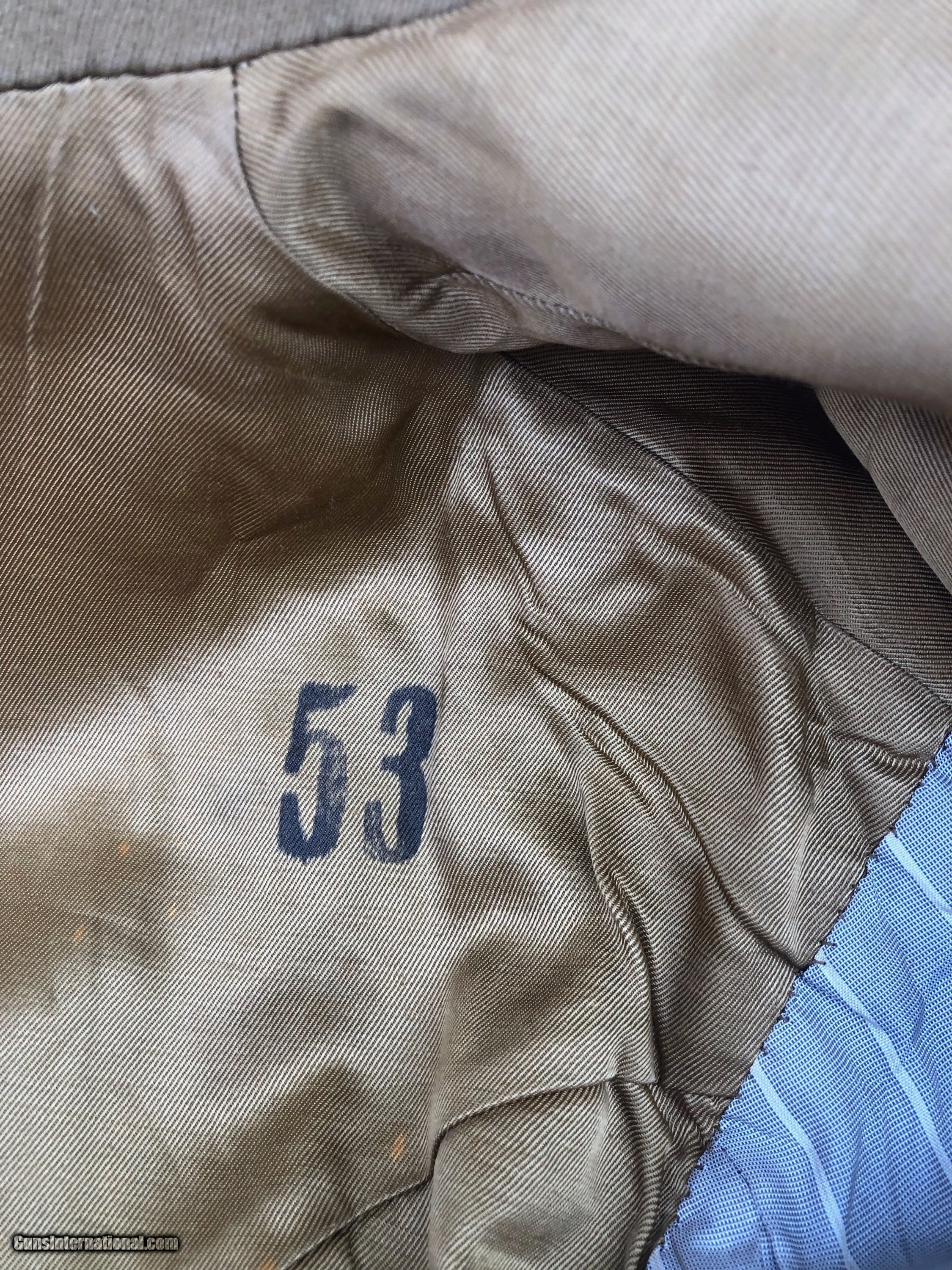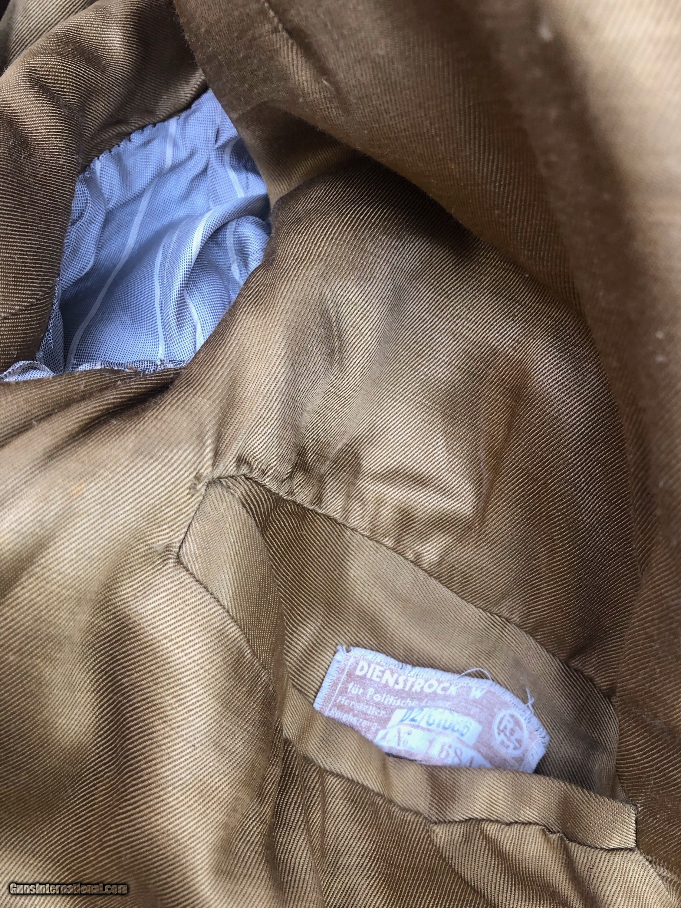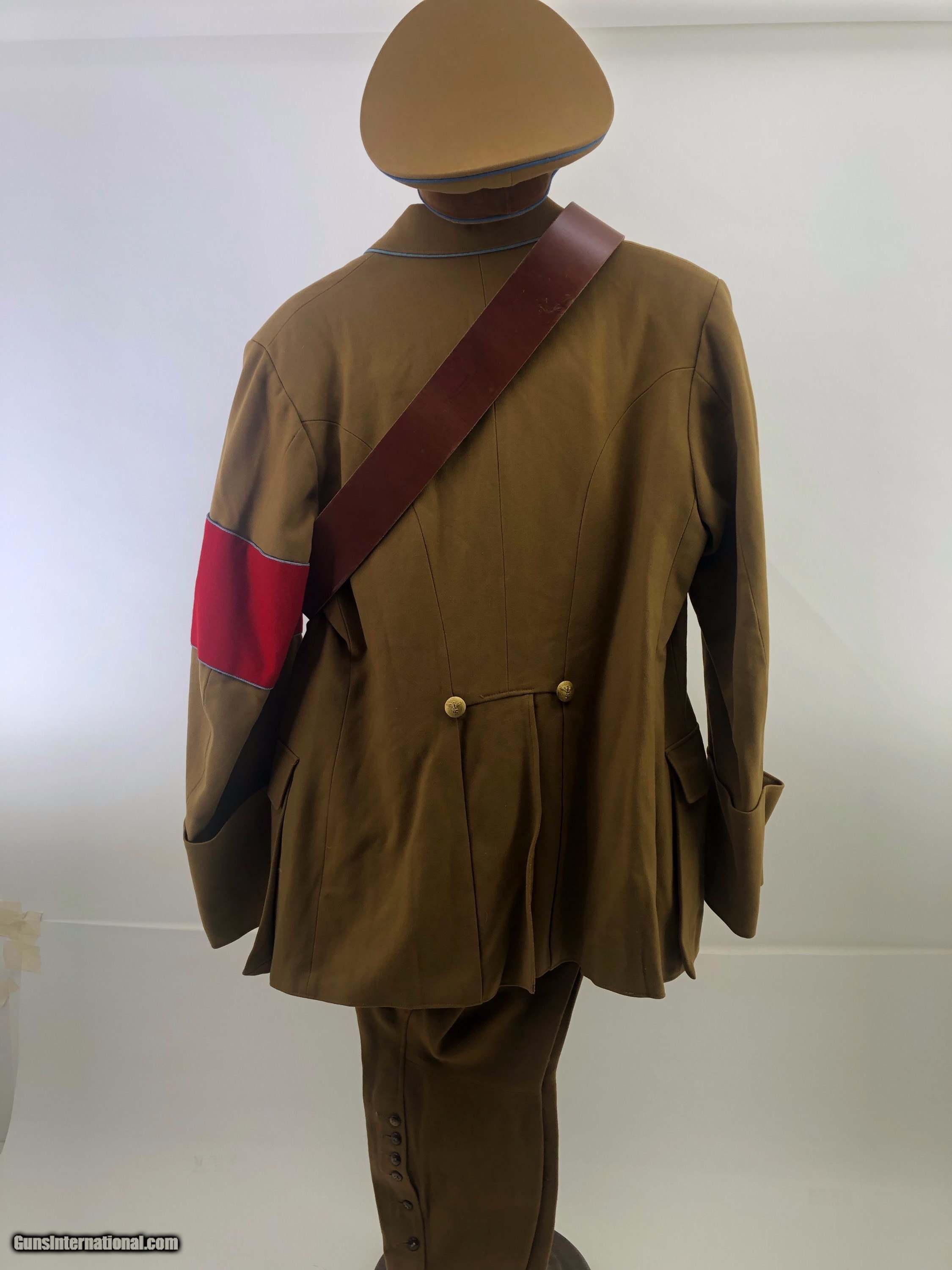 Description: Rare German N.S.D.A.P. Political Leaders Ortsgruppenleiter, brown gabardine wool, uniform. This matched set includes the jacket, jodhpurs, peaked cap, belt & buckle. The tarnished buttons date this to late war, approximately 1944. The jacket is Officers quality, and is fully lined and piped in blue. it is stamped size "53" inside with an RZM tag on the inside breast pocket. No mothing or holes found. The jodhpurs are stamped size "27" inside, with an RZM stamped inside at their rear seat seam. No mothing or holes found. All buttons are present, but 2 are broken. The matching hat has an enameled cocade with a swastika, and retains its gold gilt chin cords. The interior is tan silk lined with much of the celluloid diamond remaining. The simulated leather bill/visor is in excellent condition. It is loose from the hat but not detached. The deteriorating sweatband is loose from the hat at the bill. The interior label is missing. No mothing or holes found. The eagle and oak leaves are gold in color. The belt and buckle are in like new condition with an RZM stamped 12/1780/42 // Kerstuck on one end. SOLD |
