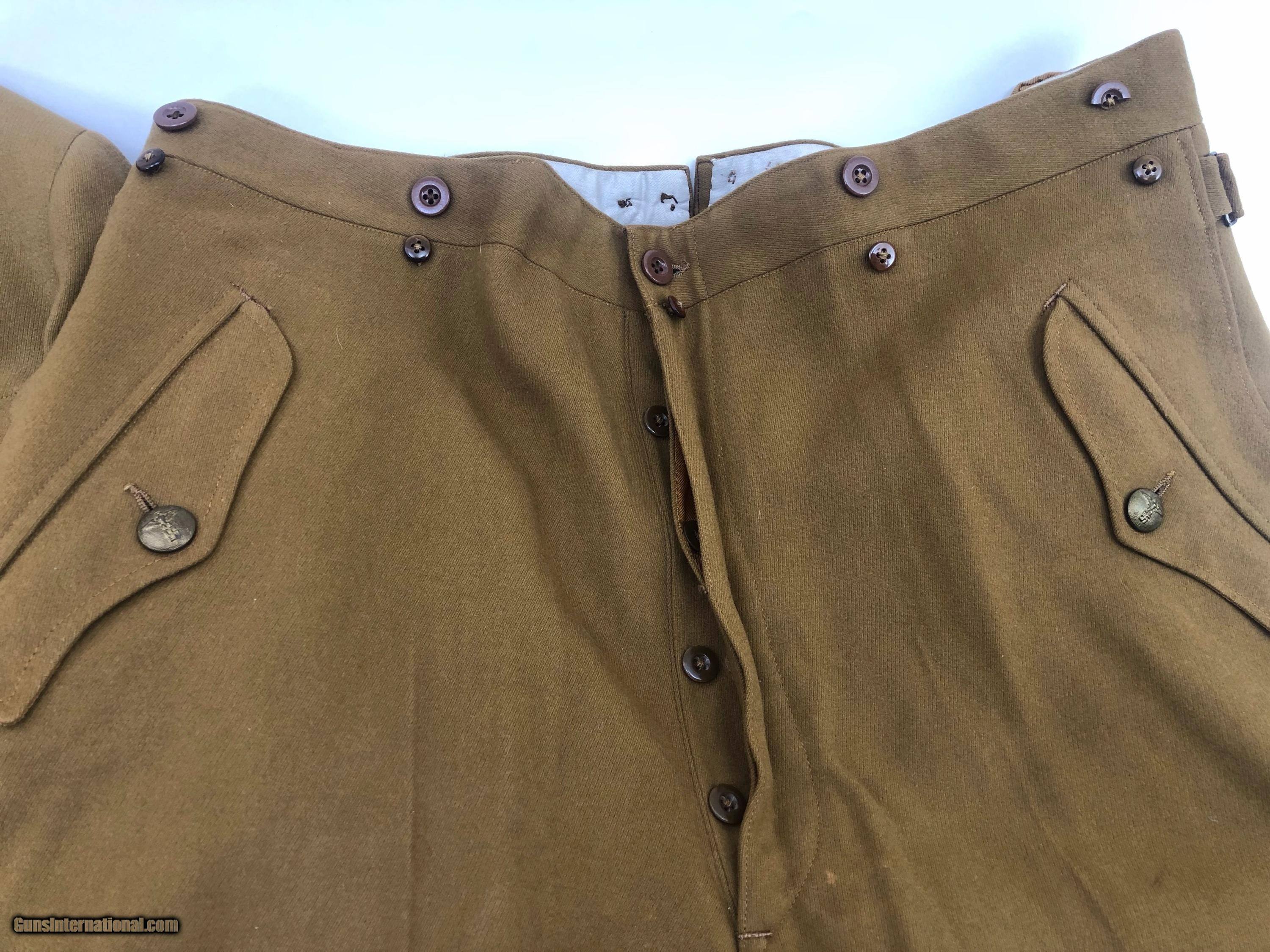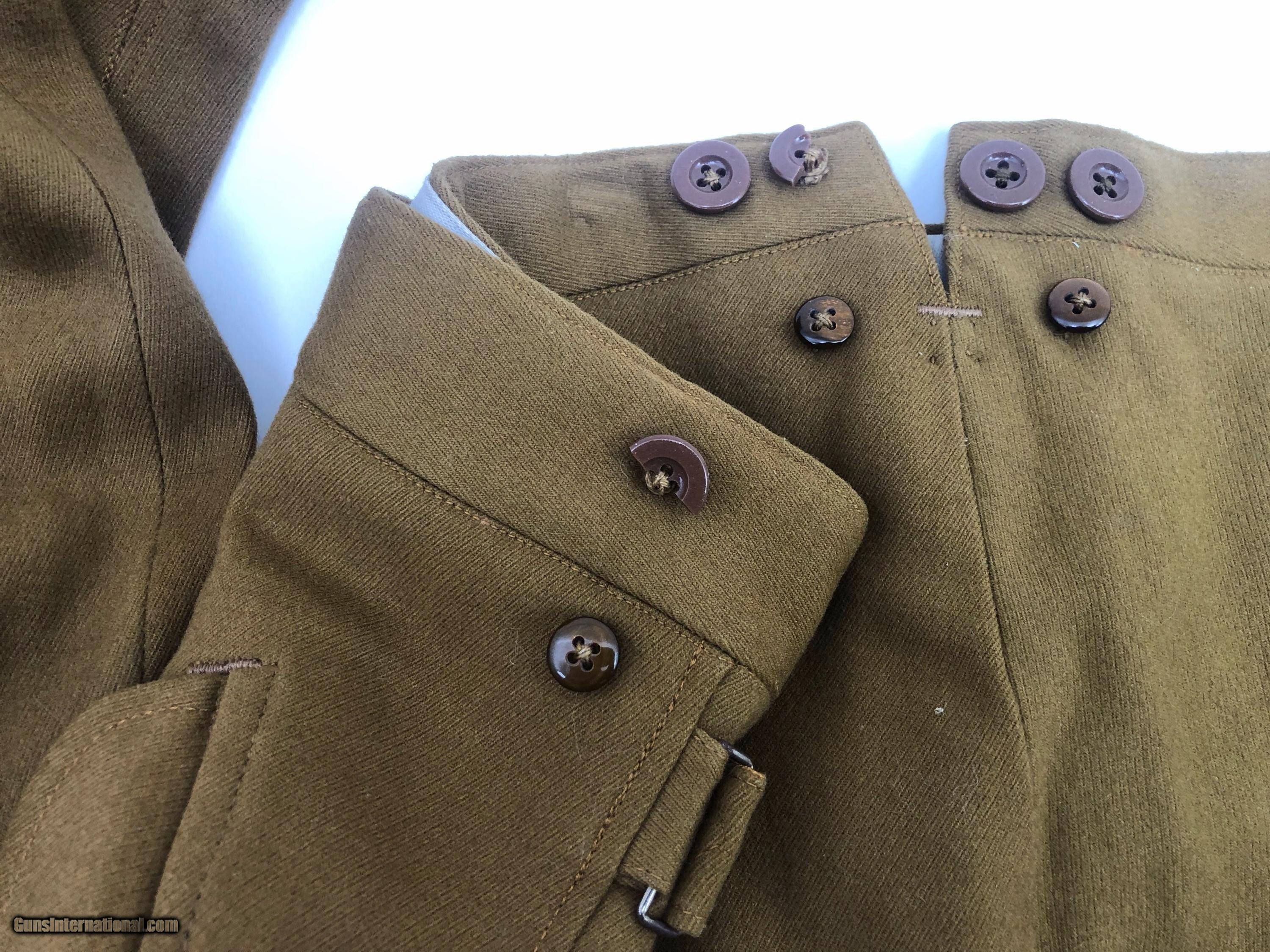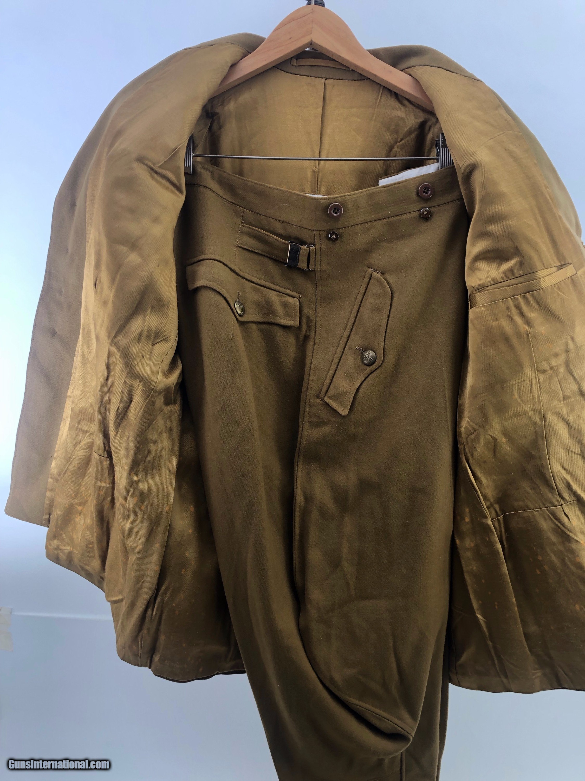 Description: Rare German N.S.D.A.P. Political Leaders Ortsgruppenleiter, brown gabardine wool, uniform. This matched set includes the jacket, jodhpurs, peaked cap, belt & buckle. The tarnished buttons date this to late war, approximately 1944. The jacket is Officers quality, and is fully lined and piped in blue. it is stamped size "53" inside with an RZM tag on the inside breast pocket. No mothing or holes found. The jodhpurs are stamped size "27" inside, with an RZM stamped inside at their rear seat seam. No mothing or holes found. All buttons are present, but 2 are broken. The matching hat has an enameled cocade with a swastika, and retains its gold gilt chin cords. The interior is tan silk lined with much of the celluloid diamond remaining. The simulated leather bill/visor is in excellent condition. It is loose from the hat but not detached. The deteriorating sweatband is loose from the hat at the bill. The interior label is missing. No mothing or holes found. The eagle and oak leaves are gold in color. The belt and buckle are in like new condition with an RZM stamped 12/1780/42 // Kerstuck on one end. SOLD |