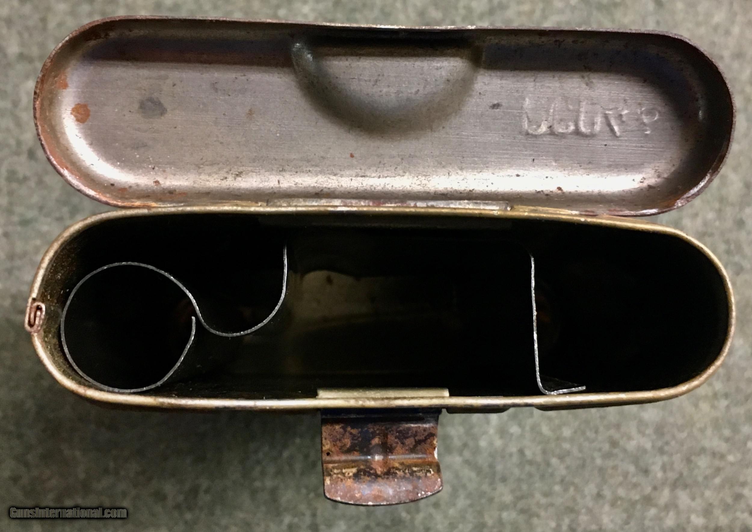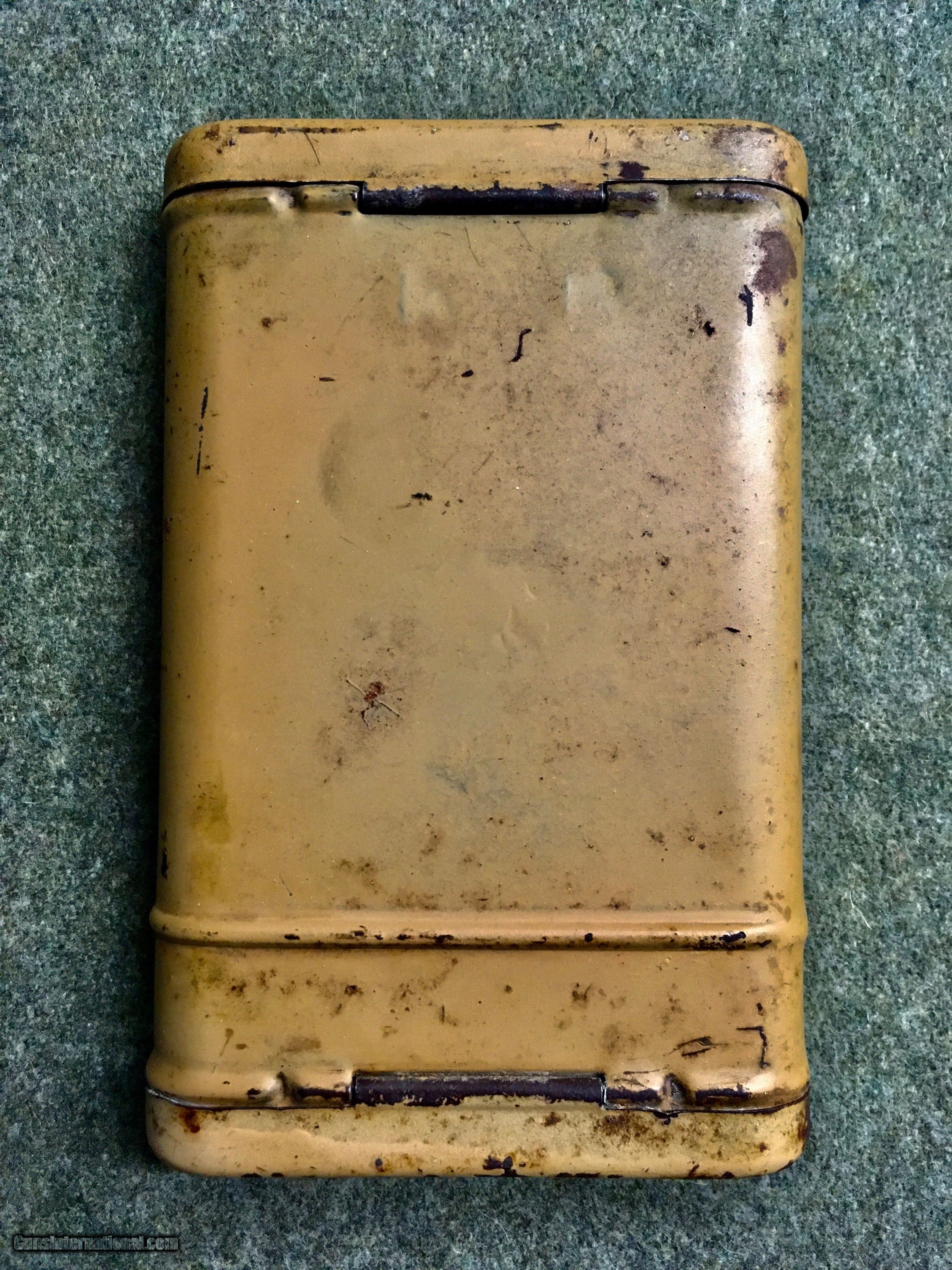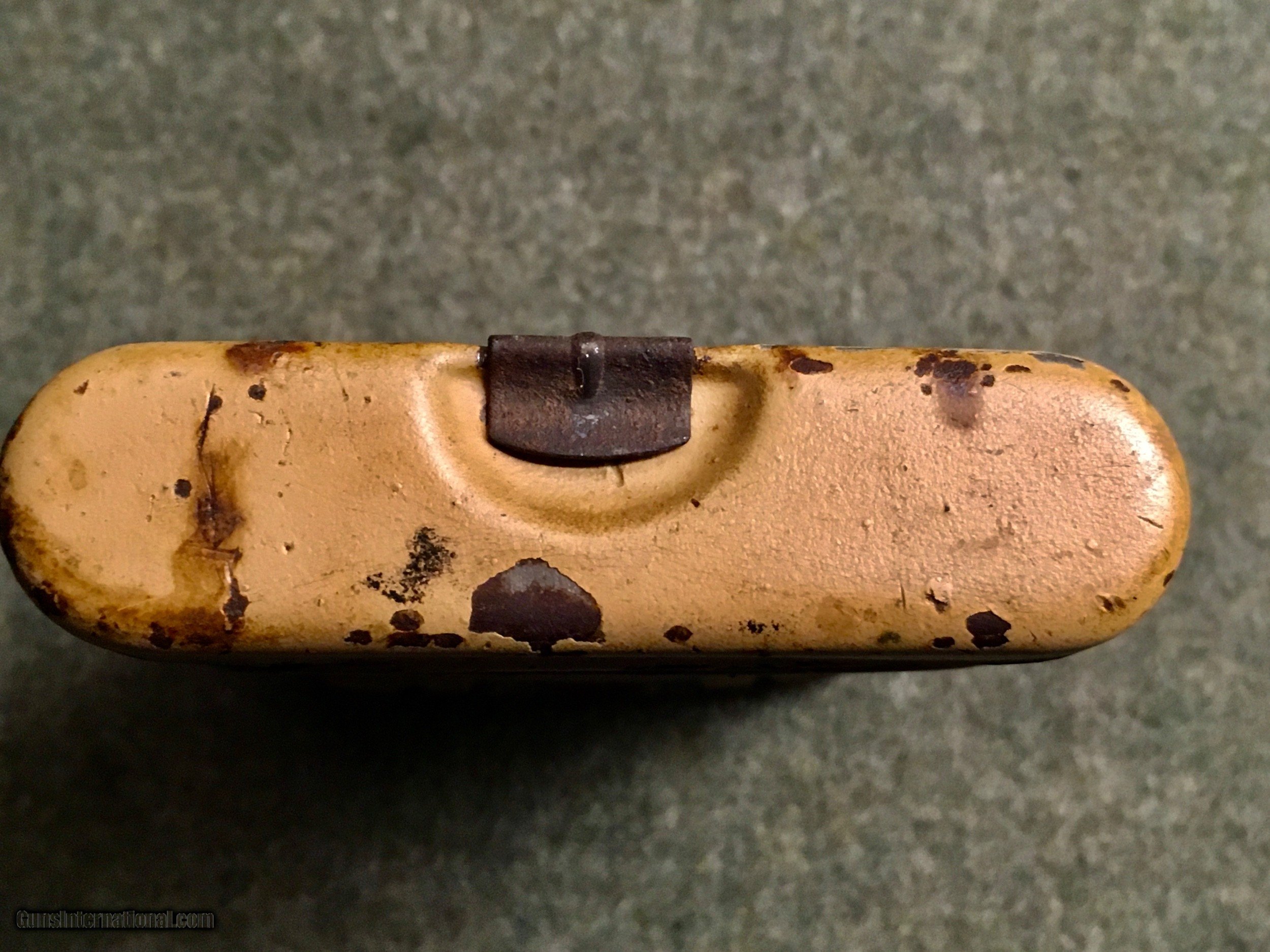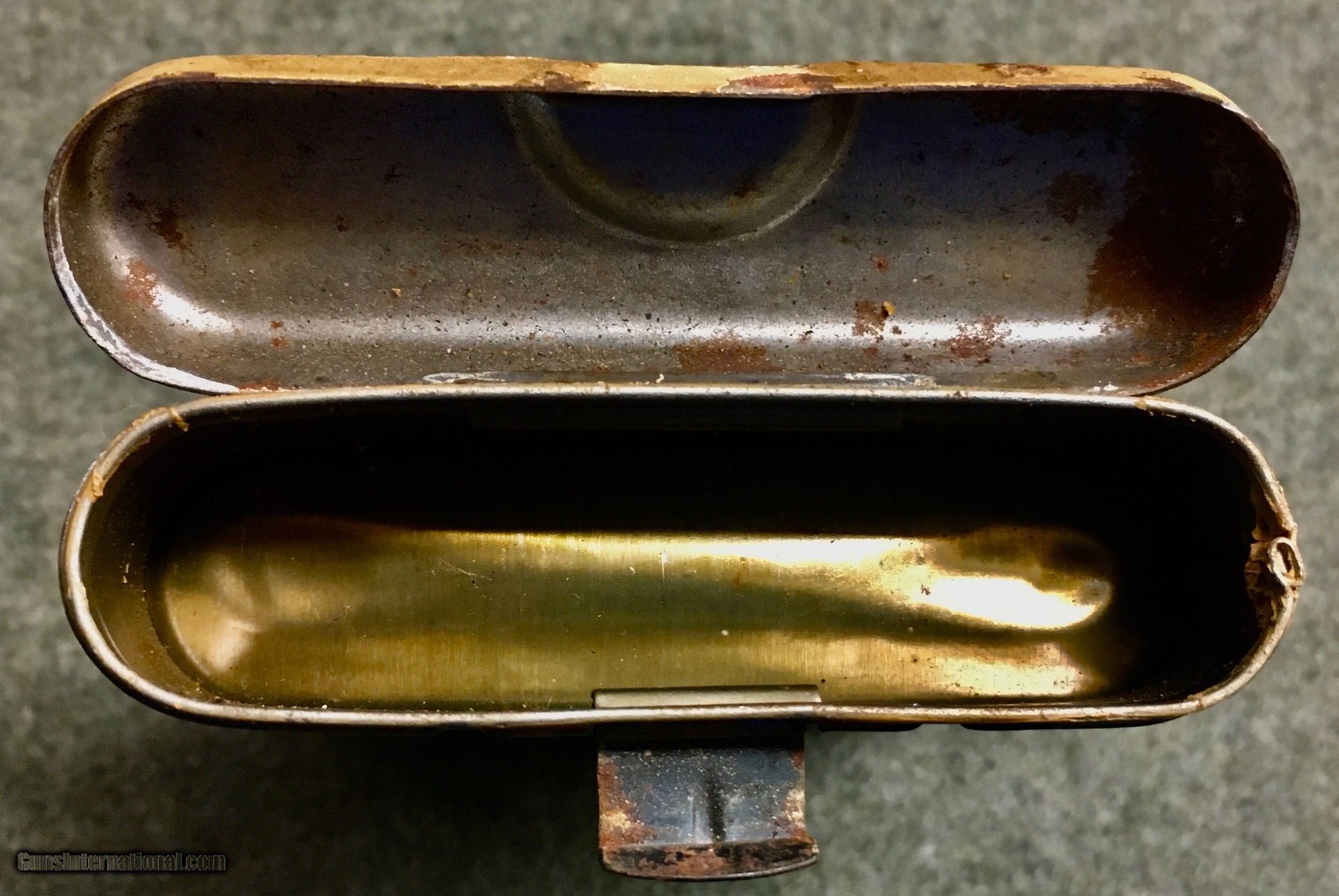 Description: For your consideration is an incredibly rare WWII German RG34 (Reinigungsgerät 34) cleaning kit in ordnance tan. Very few kits were made in this color & they are almost impossible to find in any condition. They rarely come up for sale so this is unique opportunity to own one. This particular kit is complete & retains roughly 90% of the ordnance tan paint with an area of paint loss on the front. The kit was definitely carried in combat; exhibiting numerous scrapes & scuffs. No major dents & there are some small spots of rust but over all the kit has a great combat-used appearance. The kit is marked with ordnance code “rco 44” indicating manufacture in 1944 by Braunsweigische Blechwarenfabrik GmbH in Braunschweig, Germany; well-known manufacturer of RG34 kits (also known for using ordnance codes arr, Ky & KH). The kit includes all components: the oiler in black phenolic resin, take-down tool (‘spoon’), oil brush, cleaning brush, pull chain & cleaning patch. All are in good serviceable condition. This kit would make a great addition to a K98k collection or a combat display. They are seldom listed for sale in the US & are most often found on one of the European sites like fjm 44 or Lux Military Antiques - the only two sites I have seen them for sale & they sell immediately. The cost there is generally 550-650 Euros & that does not include shipping to the US (usually another 20-30 Euros) so roughly $650-$750 to get one from Europe. I have adjusted the price on this kit to reflect the finish loss so an opportunity to acquire an ordnance tan kit at a more affordable price point. Asking $450 or best reasonable offer. Shipping is $10 via USPS Priority Mail small flat rate box. Preferred method of Payment is PayPal gift or a USPS money order. If paying by PayPal it must be a gift to avoid fees. Please feel free to contact me with any questions. SOLD |