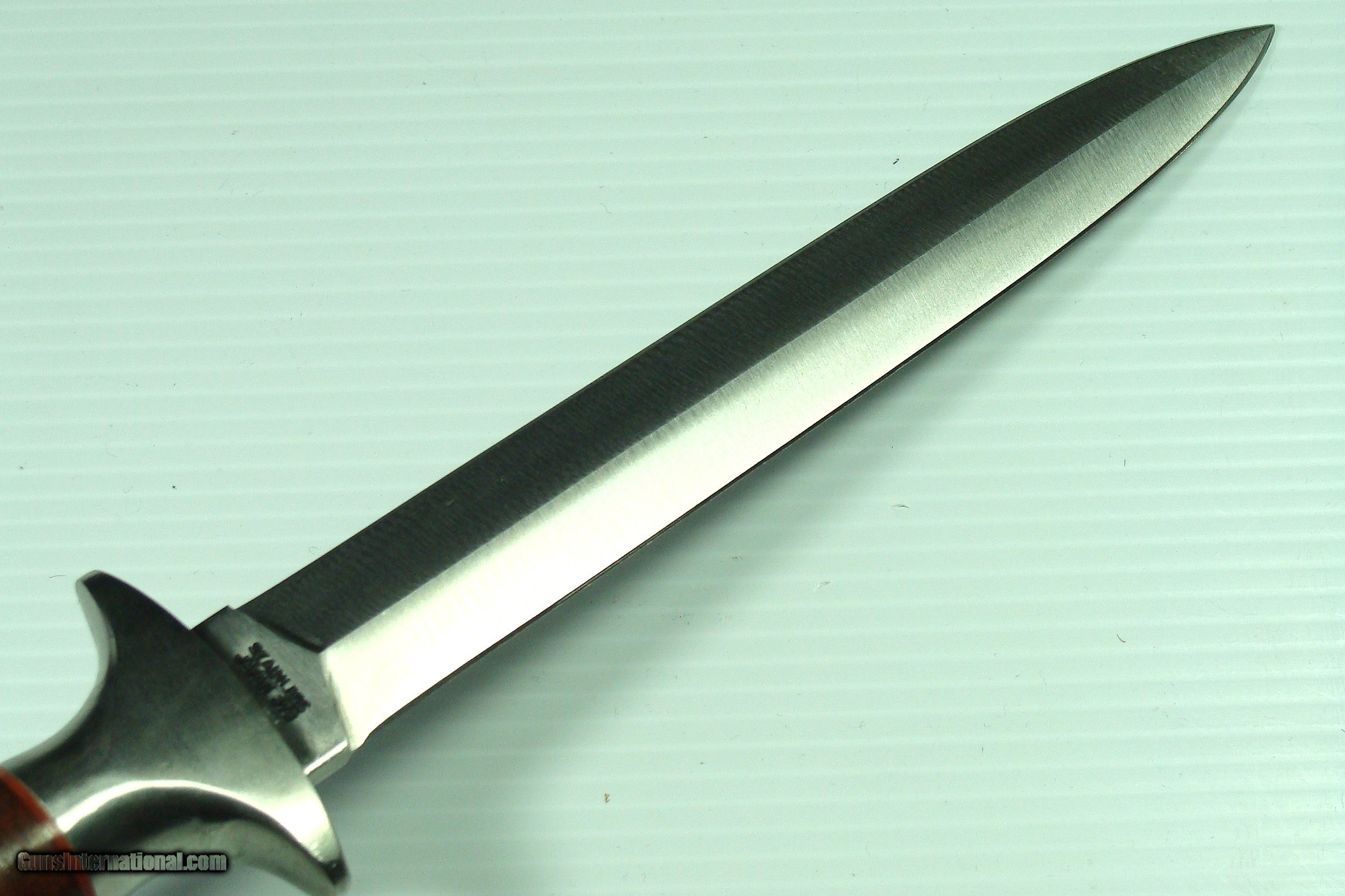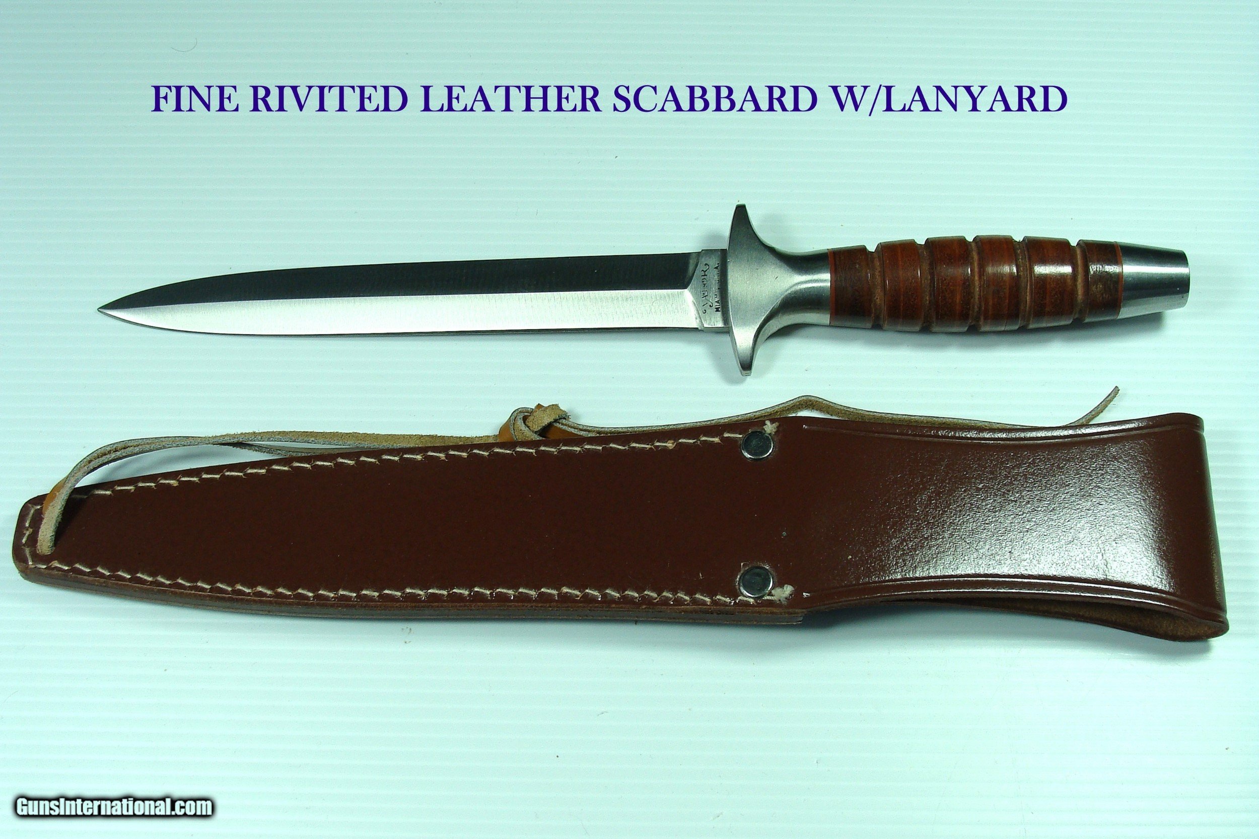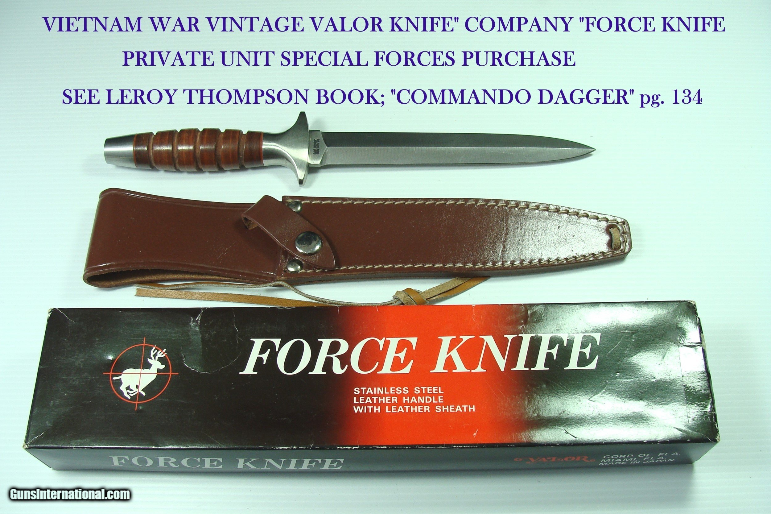 Description: VIETNAM WAR "VALOR" PRIVATE UNIT ACQUISITION WITH 7" SHARPENED DOUBLE EDGE STILETTO W/FINE THROAT RIVETED LEATHER SCABBARD MIB! PLEASE SEE LEROY THOMPSON'S FINE BOOK ENTITLED; "COMMANDO DAGGER", PAGE 134. THE PICTURED KNIFE IS IDENTICLE, ALTHOUGH THE PICTURED STILETTO HAS THE BERET FLASH OF THE 3rd SPECIAL FORCES GROUP, ABN. FT. BRAGG, N.C. SOME SF MEMBERS ATTACHED THE BERET FLASH TO THE CROSSGUARD. THIS SUPERBLY CRAFTED 7" FULL LENGTH STILLETO BLADE BY TAK FUKUTA IS RAZOR SHARP & DOUBLE EDGED, AND IS IN PRISTINE MINT CONDITION, AS IS THE SCABBARD. THE BLADE RICASSO IS STAMPED "STAINLESS JAPAN 373", THE OTHER SIDE RICASSO IS STAMPED "VALOR MIAMI". THE SUPERB FINE LEATHER WASHER HANDLE IS TIGHT, W/O ANY MOVEMENT. IT COMES WITH THE ORIGINAL FACTORY BOX. THERE IS A SMALL REPAIR TO ONE BOX END. IT IS NOT DISTRACTING. THIS IS A RARE VALOR FIGHTING KNIFE MADE DURING THE VIETNAM WAR! TAK FUKUTA ORIGINALLY IN SEKI, JAPAN FOR VALOR KNIVES WAS THE FIRST JAPANESE MEMBER OF THE AMERICAN KNIFE MAKERS GUILD, TAK was an apprentice to MASTER KNIFE MAKER BOB LOVELESS. Over the Years, his factory in Seki, Japan produced knives for Parker, Valor, Gutmann Explorer, Frost, among others. After his Passing, several vintage old Stock models were found at his warehouse. This is one of THOSE rare finds. OFFERS ACCEPTED! SHIPPING IS $18 ~~~~~~~~~~~~~~~~~~~~~~~~~~~~~~~~~~~~~~~~~~~~~~~~~~~~~~~~~~~~~~~~~~~~~~~~~~~~~~~~~~~~~~~~~~~~~~~~~~~~~~~~~~~~~~~~~~~~~~~~~~~~~~~~~~~~~~~~~~~~~~~~~~~~~~~~~~~~~~~~~~ NO guarantee or warranty is expressed or implied as to the usability of the items for its original purpose. The buyer certifies that he or she is of lawful age and is not prevented by any law from the purchase or possession of these items. No guarantee or warranty is expressed or implied as to the usability of the items for its original purpose. The buyer certifies that he or she is of lawful age and is not prevented by any law from the purchase or possession of these items. The buyer is responsible for knowing, understanding and obeying all International, Federal, State and Local laws concerning the use and possession of these items. Offers Accepted ~~~~~~~~~~~~~~~~~~~~~~~~~~~~~~~~~~~~~~~~~~~~~~~~~~~~~~~~~~~~~~~~~~~~~~~~~~~~~~~~~~~~~~~~~~~~~~~~~~~~~~~~~~~~~~~~~~~~~~~~~~~~~~~~~~~~~~~~~~~~~~~~~~~~~~~~~~~~~~~~~~ I HAVE BEEN AN ADVANCED COLLECTOR, DEALER, MILITARY HISTORIAN OF HIGH CONDITION ALLIED MILITARY FIGHTING KNIVES, AND THE MEN THAT CARRIED THEM, 1918-1975, INCLUDING RANDALL MADE KNIVES, AND GERBER MK.2'S 1950-1975. I PAY TOP DOLLAR FOR TOP CONDITION! THANK YOU FOR YOUR INTEREST! SOLD |