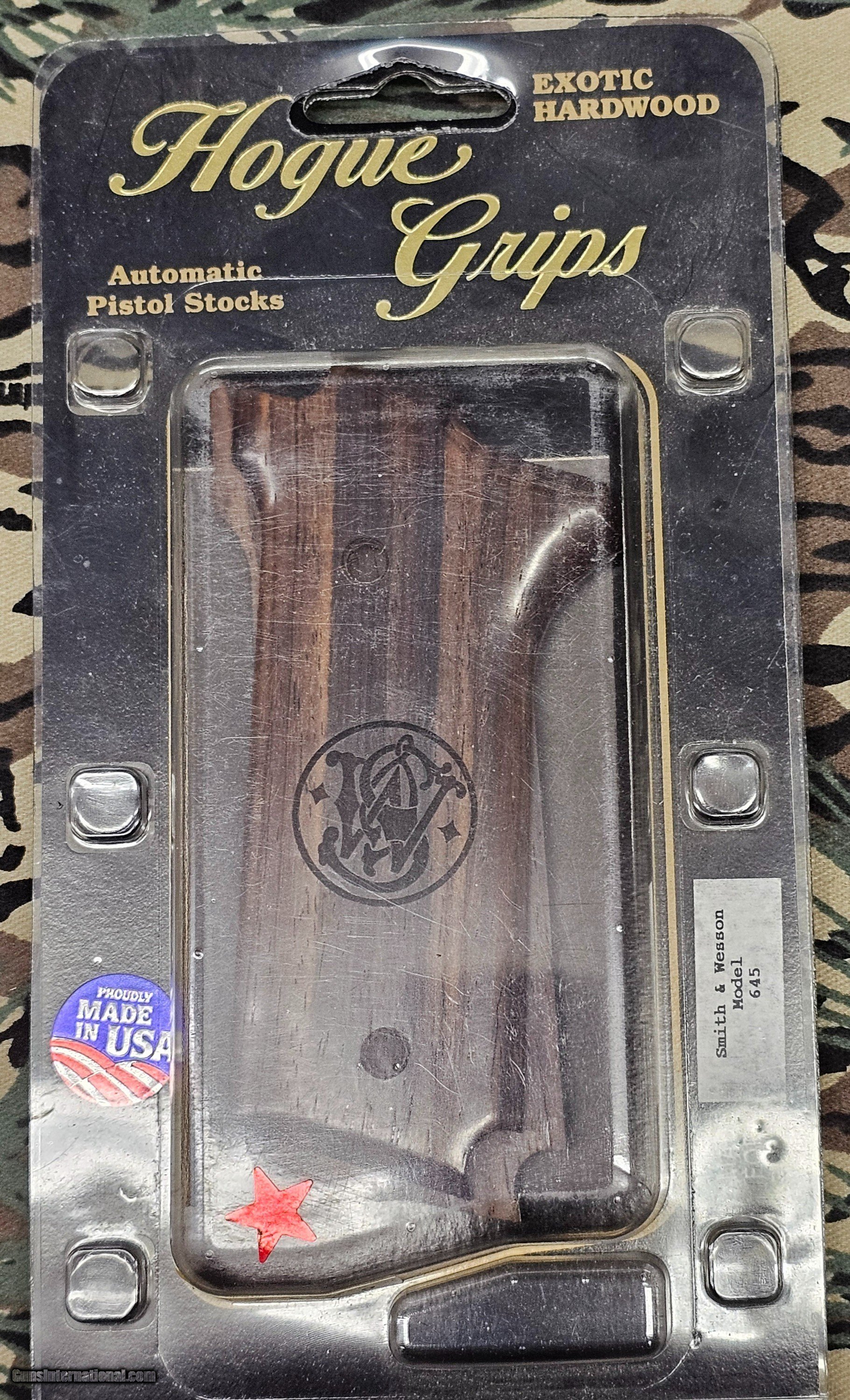 Description: Available - New Hogue Smith & Wesson 645 Exotic wood grips . Have 3 sets of beautiful grips to choose from. Price is for ONE set of grips. Your choice, first come first serve! Blue Star - Tulipwood Red Star - Coco Bolo Silver Star - Kingwood Remember its your choice of 1 set of grips. SOLD |