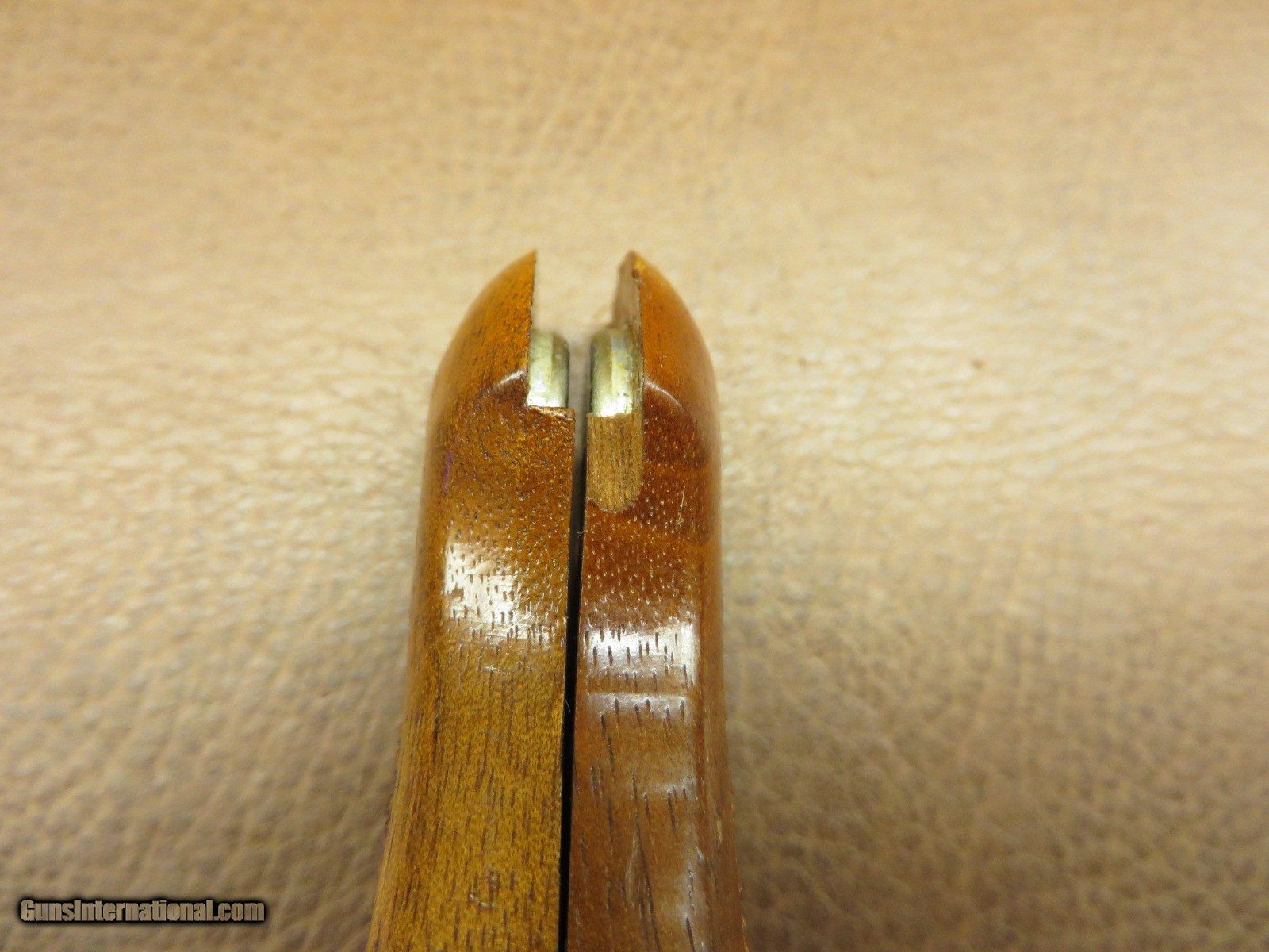 Description: Factory checkered walnut J frame grips for round butt only. Comes with screw. Small chip behind triggerguard on left panel shown in photo. Otherwise 95% condition. SOLD |