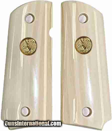Description: COLT 1911 OFFICERS MODEL. ALSO FITS COLT DEFENDER & CLONES. REAL IVORY (PRE-BAN), SMOOTH, SLOPE BOTTOM. WITH SILVER COLT MEDALLIONS. NO FITTING REQUIRED. Photo Shows Gold, But Silver Available. Genuine Elephant Ivory Grips With Beautiful Grains & Color Variations. Important Announcement For Our Real Elephant Ivory Customers: Effective 7/6/2016, New U.S. Fish & Wildlife Law Takes Effect: No Interstate or International Sales of Real Elephant Ivory Grips. Elephant Ivory Grips Will No Longer Be Available, Except For N.C. Customers/Residents After 7/5/16. PLEASE DO NOT ATTEMPT TO ORDER ELEPHANT IVORY GRIPS, IF YOU ARE OUTSIDE OF N.C, AS IT IS PROHIBITED BY LAW. Please consider looking at our Siberian Mammoth Ivory & Fossilized Walrus Ivory Grips. We Will Be Adding More Grips in the Future. They Are All One of a Kind, Rare Grips. We Are Only Selling Our Current Inventory to N.C. Customers. We Will No Longer Be Able To Make Custom Grips in Elephant Ivory, Even For N.C. Residents. We Can No Longer Order From Our Pre-Ban Supplier. However, We Will Be Making Siberian Mammoth Ivory & Fossilized Walrus Ivory Grips. Shipping: $20.00. Please email for questions or payment options. SOLD |