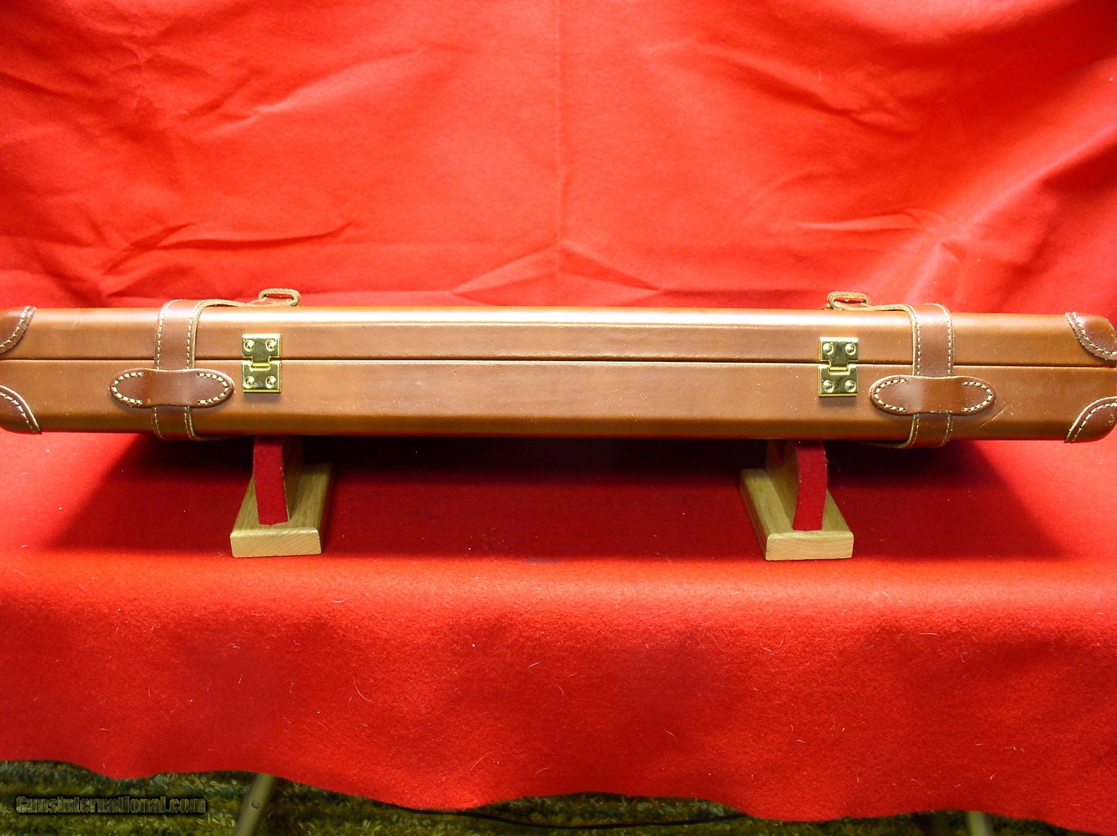 Description: FACTORY ORIGINAL ALL LEATHER MERKEL TAKE DOWN CASE FOR DOUBLE RIFLE. Lightly used with very little wear that I would class AS NEW. Barrel compartment is 24 1/4". Overall dimensions 28 1/2" x 11 1/4" x 3". $650 Plus $45 Shipping SOLD |