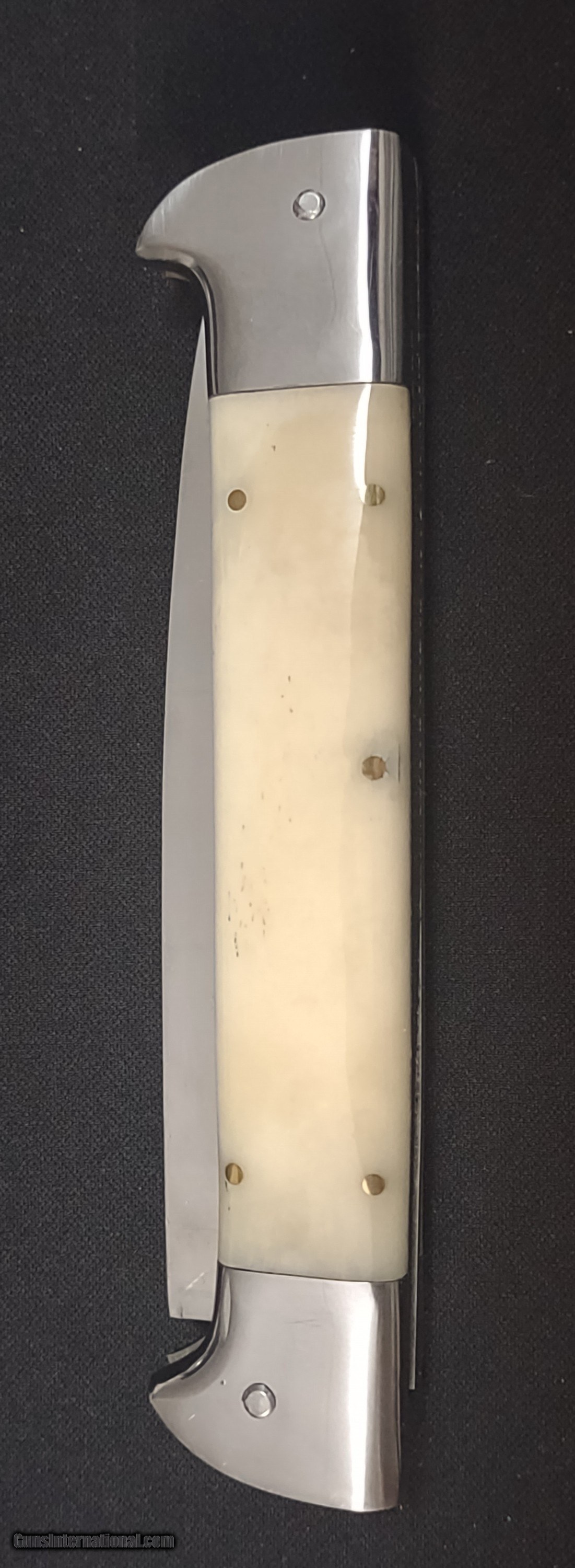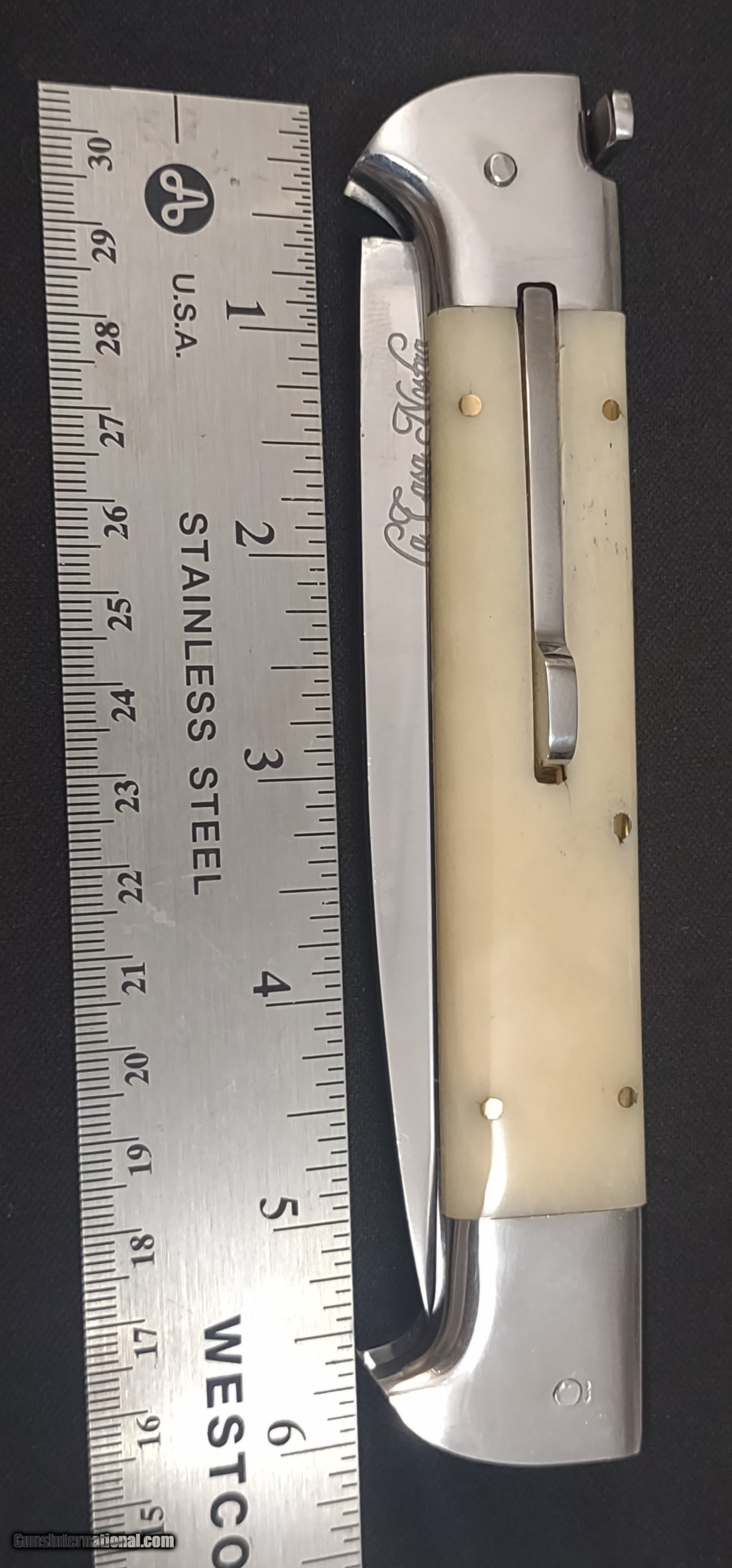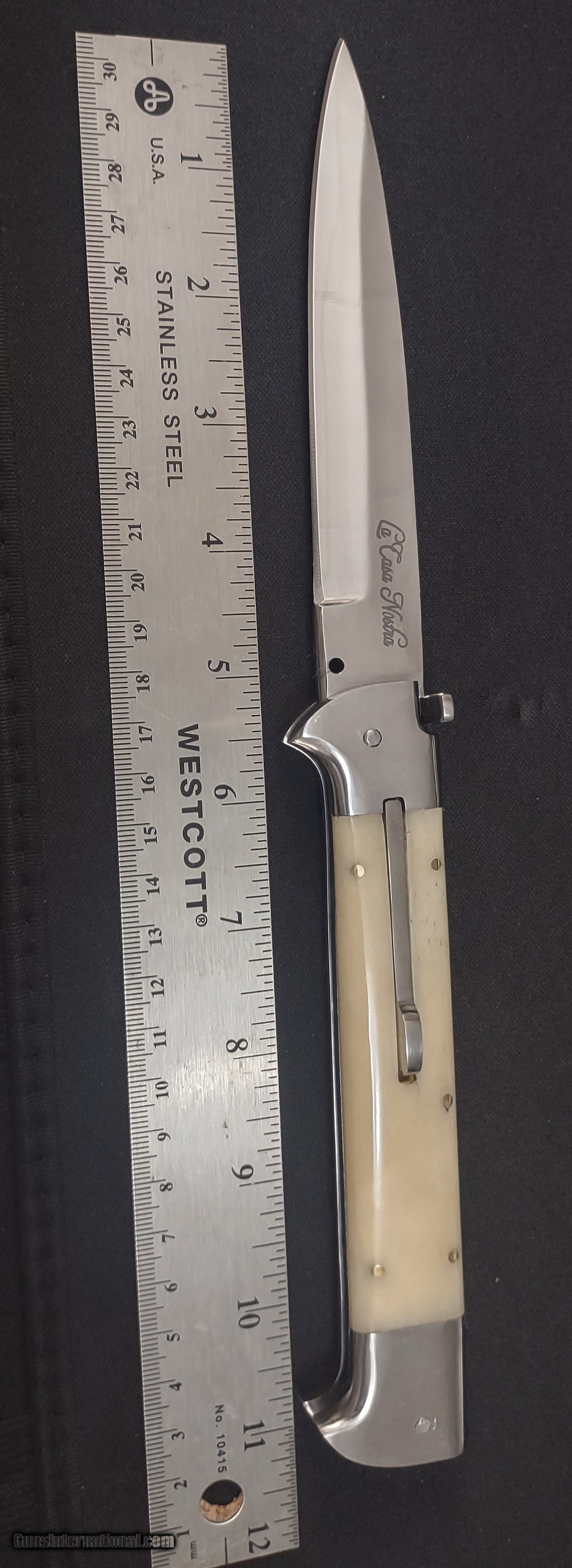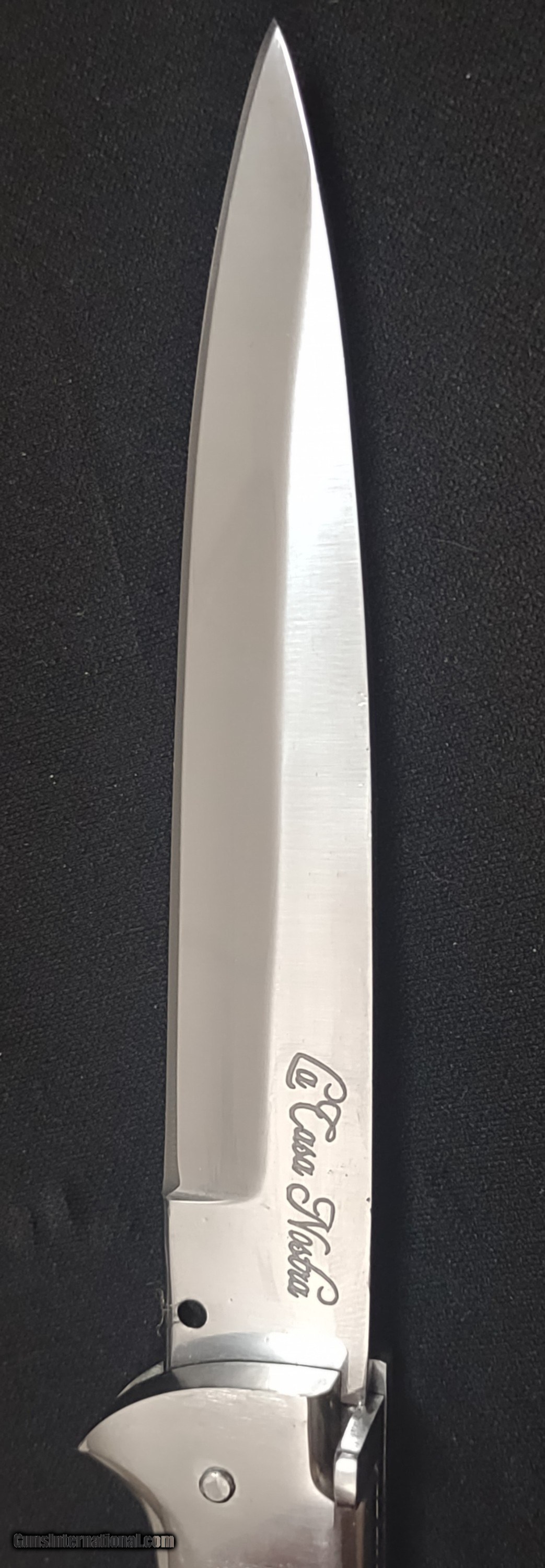 Description: This is a large heavy duty handmade automatic knife, it is marked La Casa Nostra, stainless steel blade fires hard and fast with a positive tight lockup and no wobble, genuine bone handles,this knife was part of a collection I acquired and has never been used and only has a few scuffs and scratches from handling. overall it's in high excellent condition, the blade is sharp and it will cut, it has file work down the back spring, look at all the pictures they show the condition and dimensions and the exact item you will receive, the sale price includes USPS Priority Mail shipping, I accept USPS money orders and personal or bank checks. item will ship immediately when funds clear SOLD |