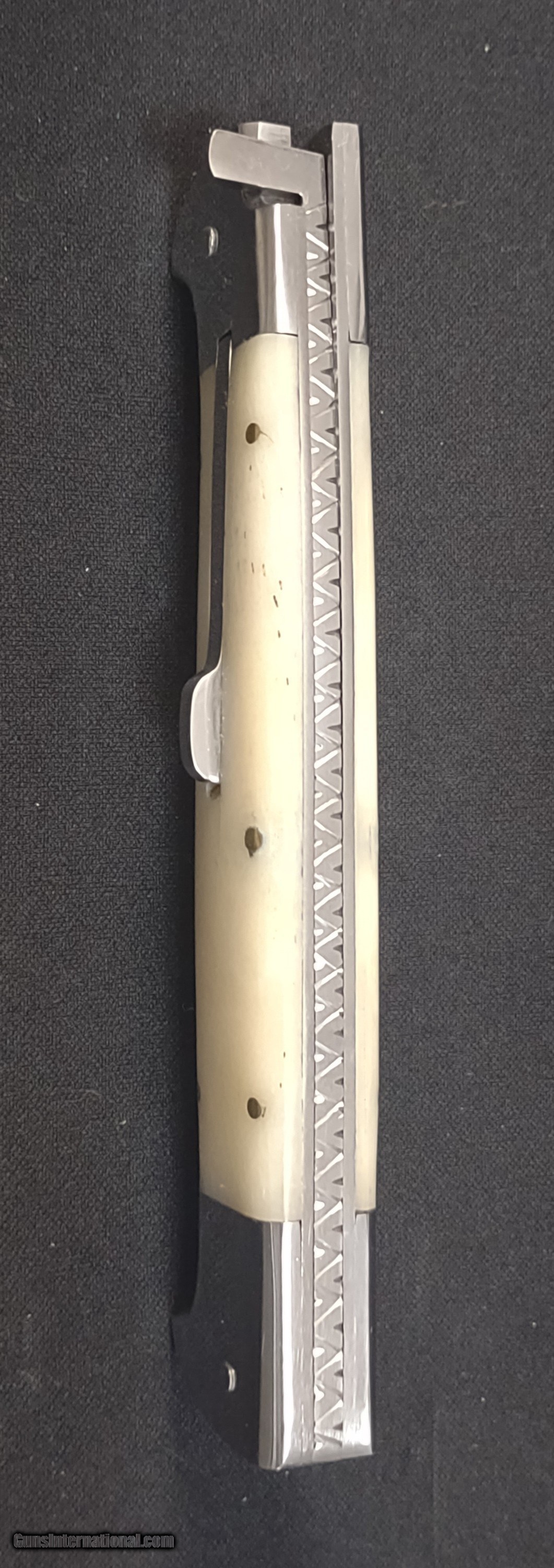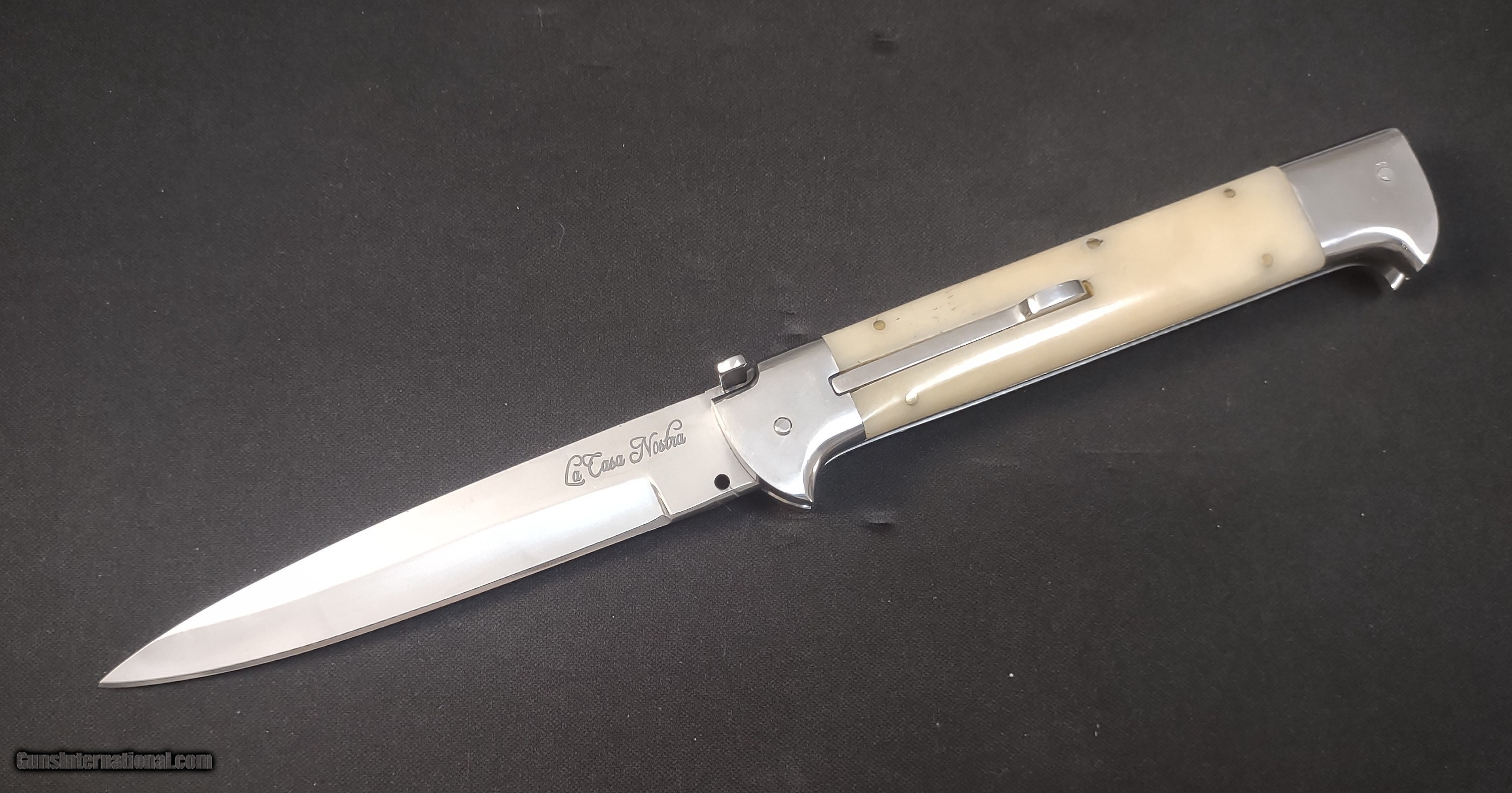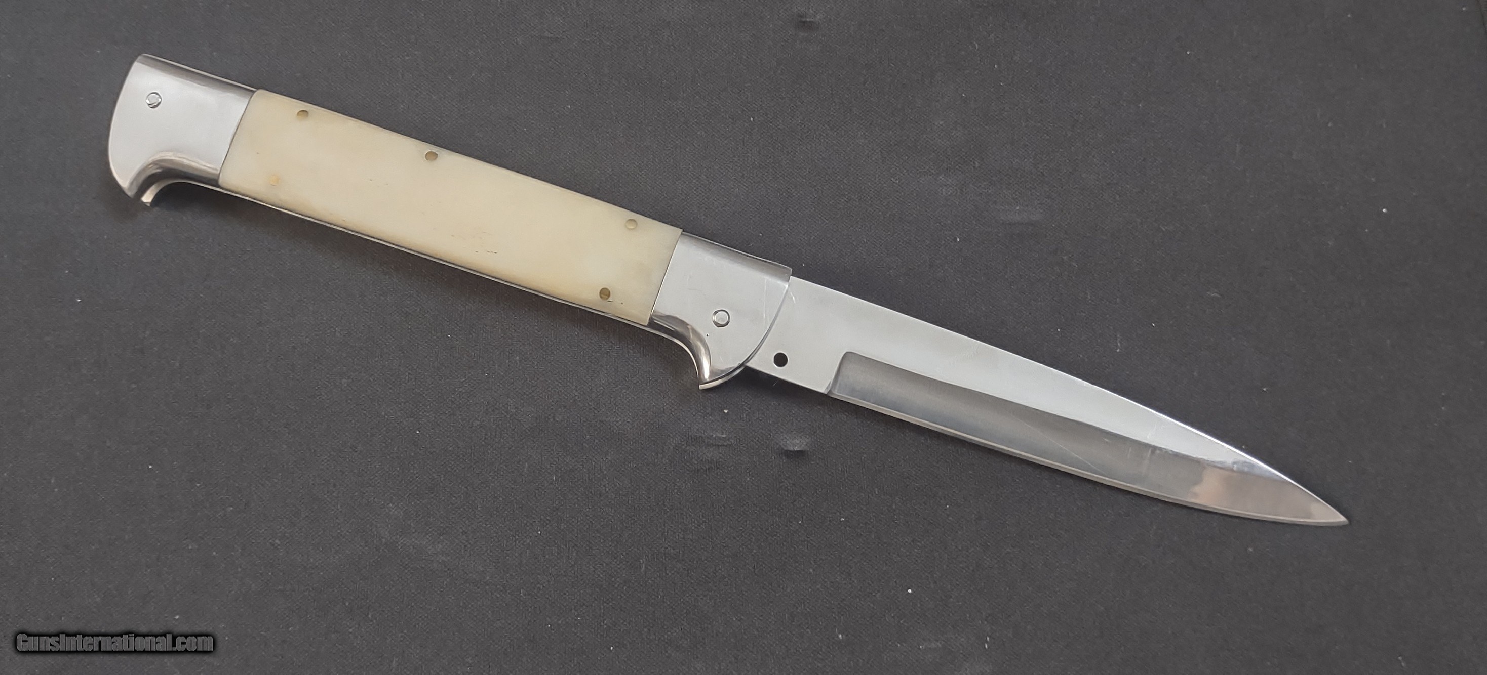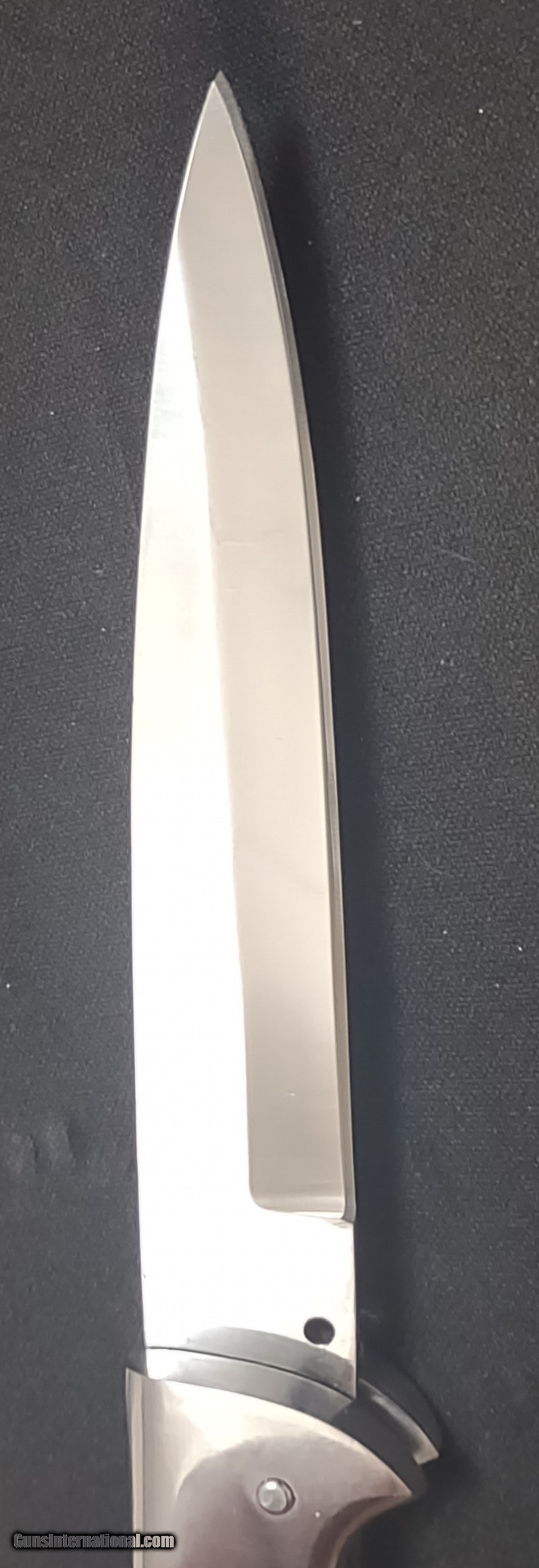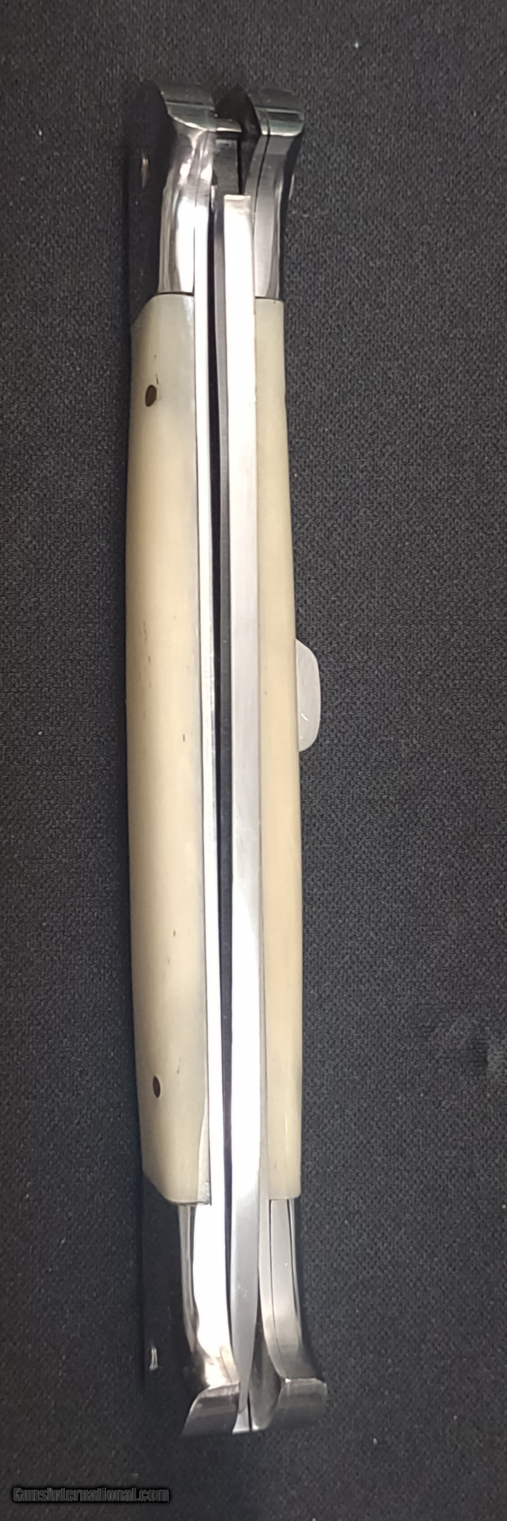 Description: This is a large heavy duty handmade automatic knife, it is marked La Casa Nostra, stainless steel blade fires hard and fast with a positive tight lockup and no wobble, genuine bone handles,this knife was part of a collection I acquired and has never been used and only has a few scuffs and scratches from handling. overall it's in high excellent condition, the blade is sharp and it will cut, it has file work down the back spring, look at all the pictures they show the condition and dimensions and the exact item you will receive, the sale price includes USPS Priority Mail shipping, I accept USPS money orders and personal or bank checks. item will ship immediately when funds clear SOLD |