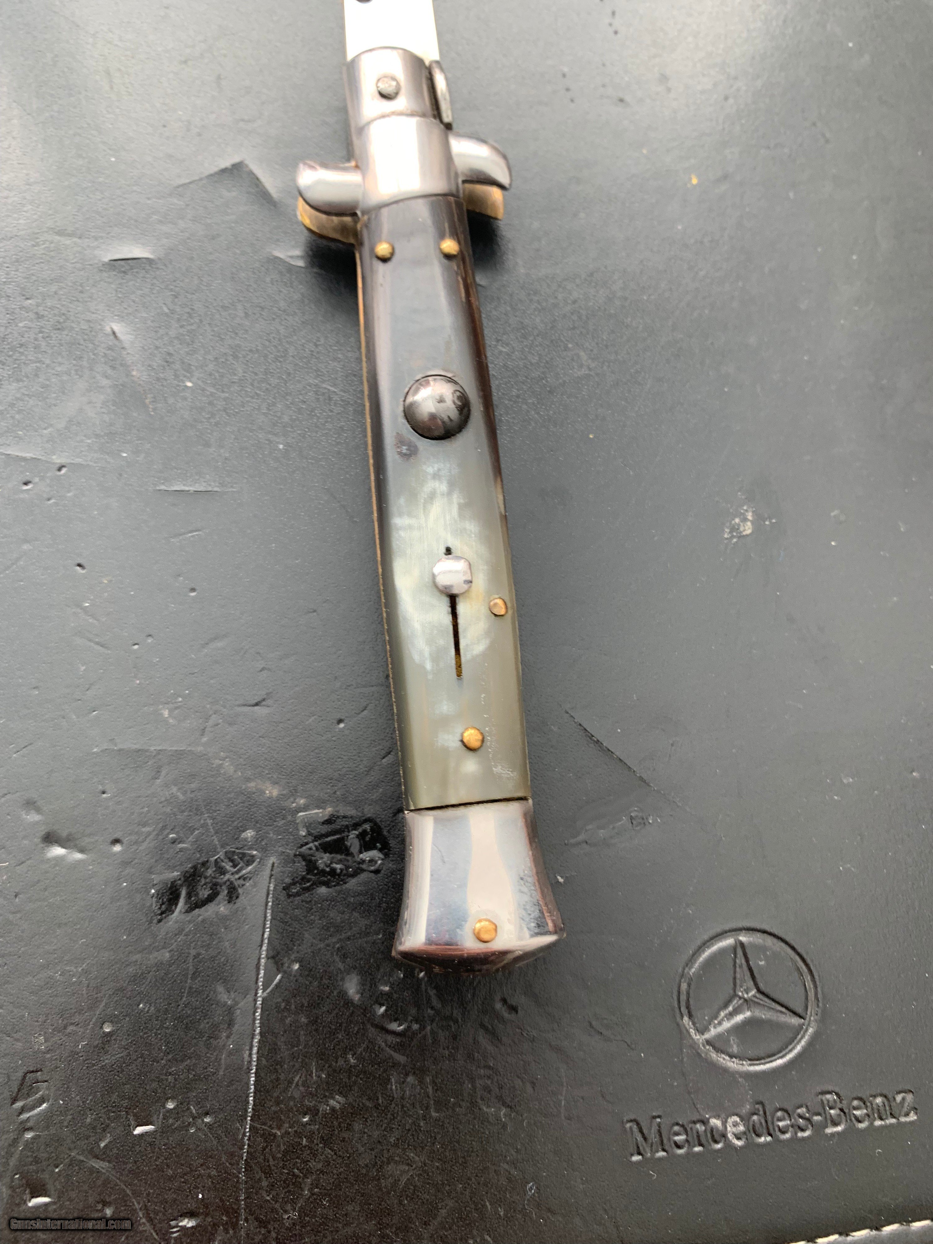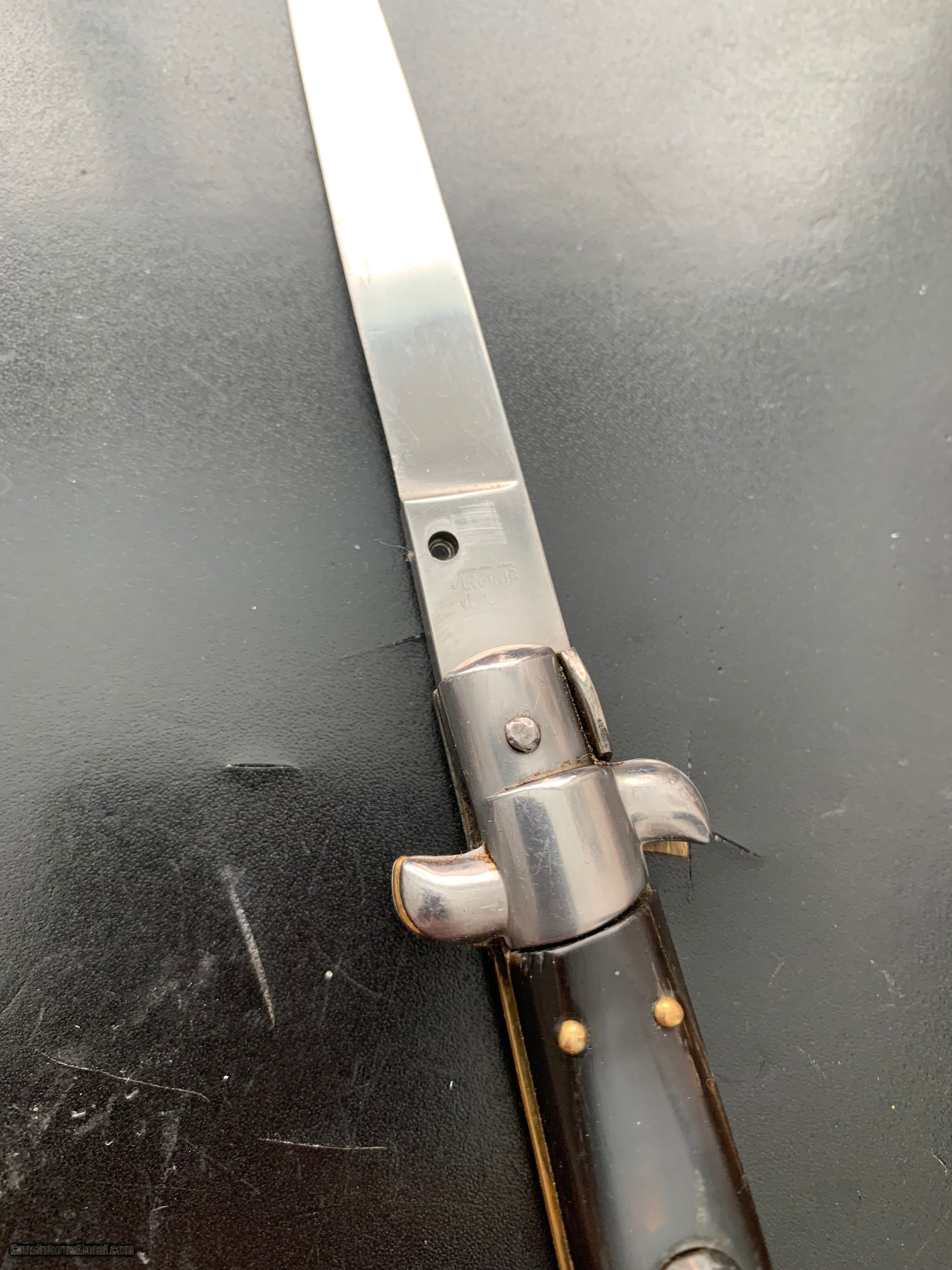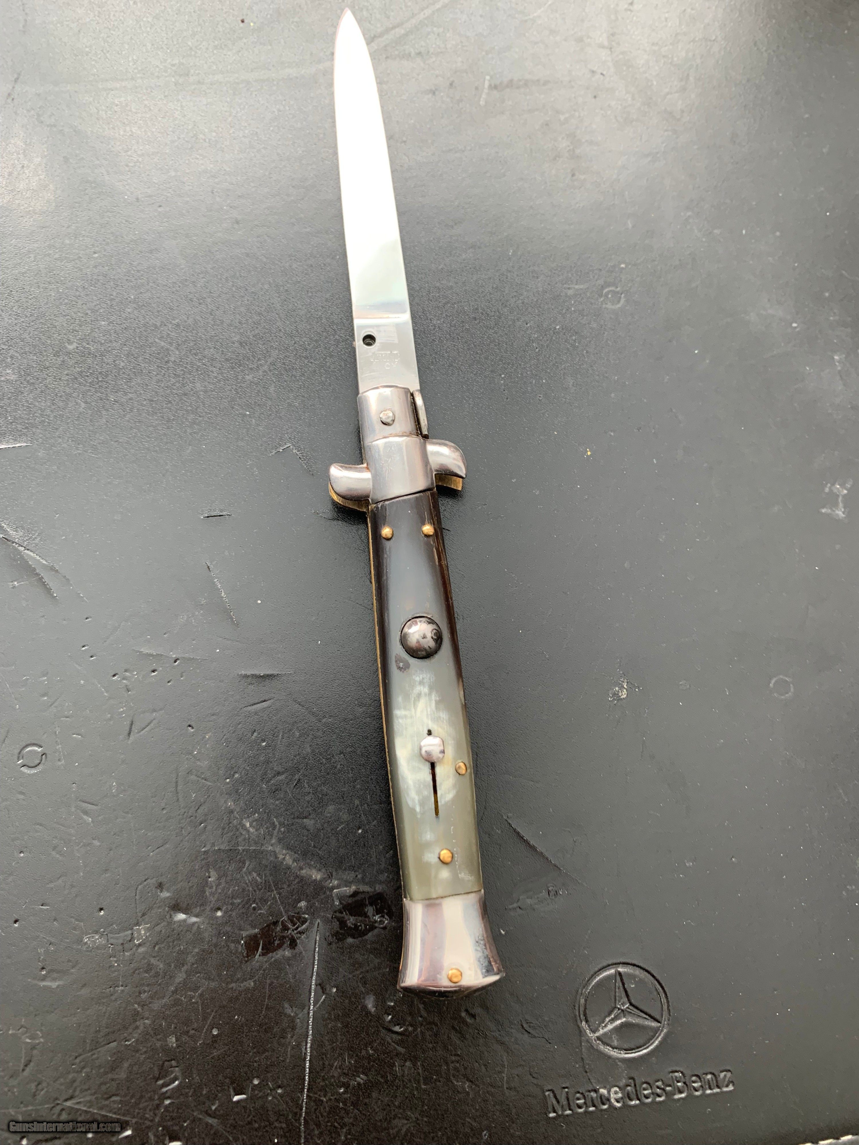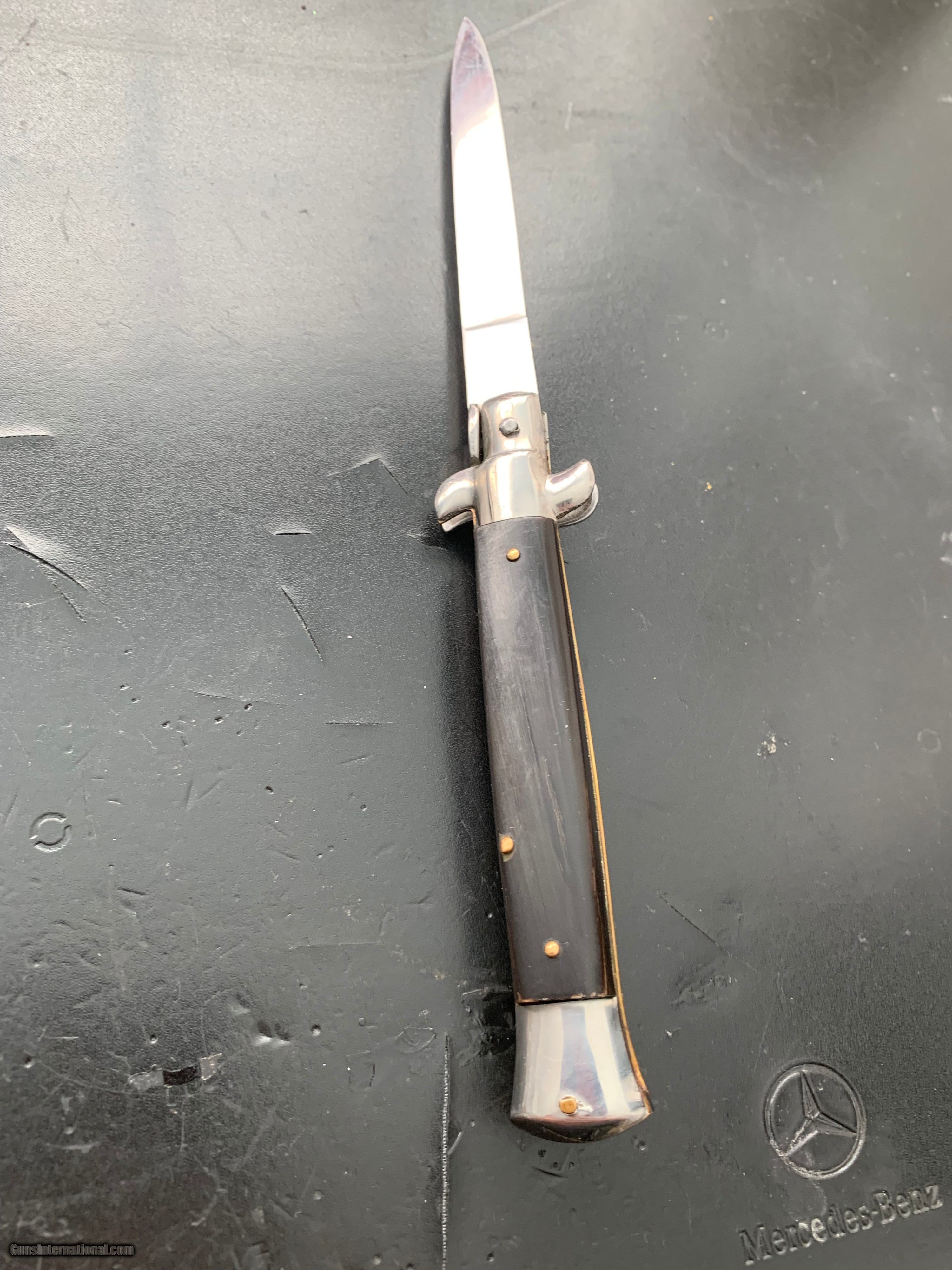 Description: VERY NICE ITALIAN VIRGINIA SWITCHBLADE 4 INCH BLADE 8.5 INCHES OPEN LOOKS TO ME LIKE BUFFALO SCALES PROBABLY FORM THE 70'S OR 80'S DOESN'T LOOK LIKE IT'S EVER BEEN SHARPENED BLADE IS VERY TIGHT SAFTEY DOESN'T WORK, ALMOST NONE OF THEM DO $7 SHIPPING MUST BE 18 AND LEGAL TO OWN IN YOUR STATE PAYPAL IS MY PREFERRED PAYMENT SOLD |