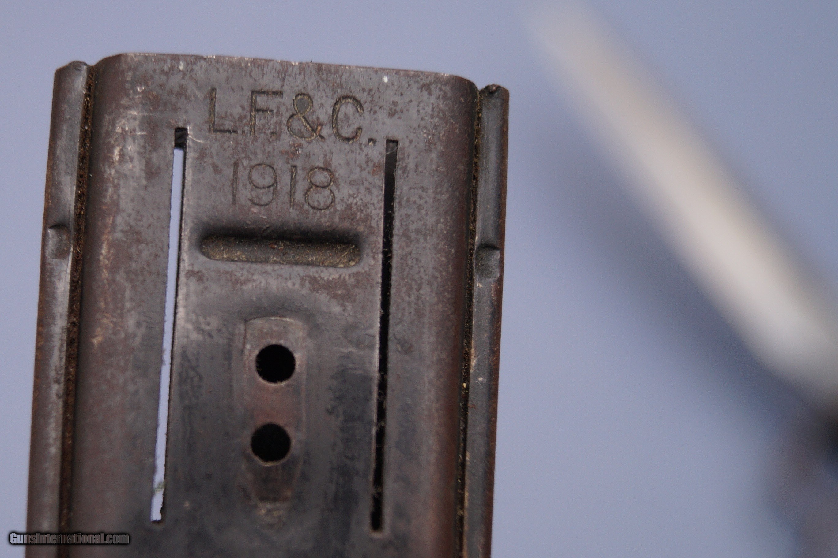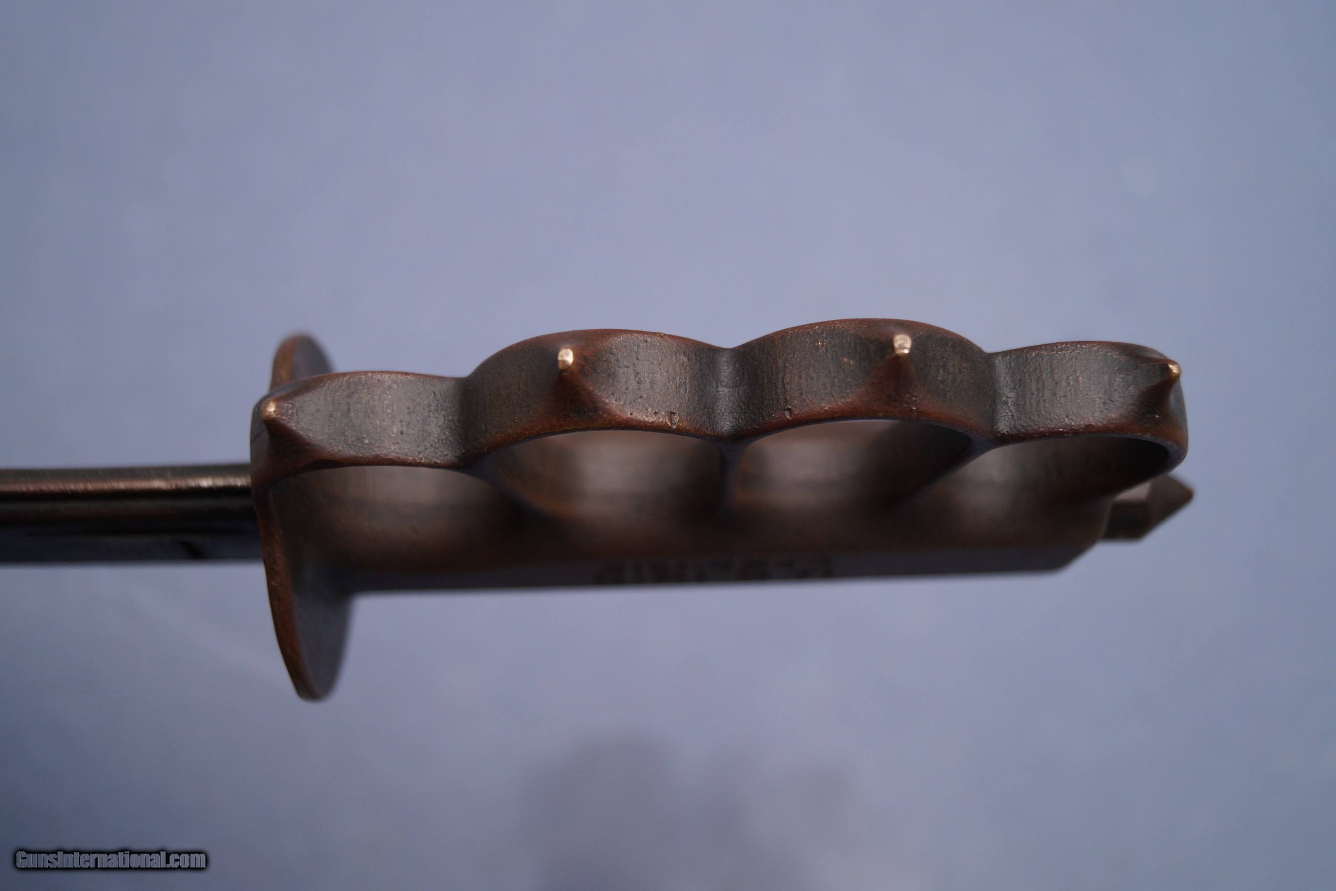 Description: US Model 1918 Trench Knife mfd by LF&C which stand for Landers Frary and Clark in 1918. Complete with original 1918 dated scabbard. Very Good Condition overall. No blade chips, good point, the handles still have some original finish. Scabbard hooks were removed...probably fitted inside a leather scabbard during WW2 as many were. Very Good Condition. Traces of original black on handle, ricasso, and scabbard. Blade is bright and has been lightly cleaned. No pits or chips in the blade and quite sharp. There are 1918's on the market with no scabbard selling for more than this and blades with the scabbards in no better condition selling for over 2000. We priced this for a quick sale but that time is about to run out. PLEASE READ: KNOW YOUR STATE AND LOCAL LAWS BEFORE CONTACTING US. THIS IS FOR SALE ONLY WHERE LEGAL. FOR SALE ONLY WHERE LEGAL. IF YOU LIVE IN A STATE WHERE IT'S ILLEGAL TO OWN BRASS KNUCKLES OR A DAGGER, WE CANNOT SELL OR SHIP THIS TO YOU. 25.00 shipping. SOLD |