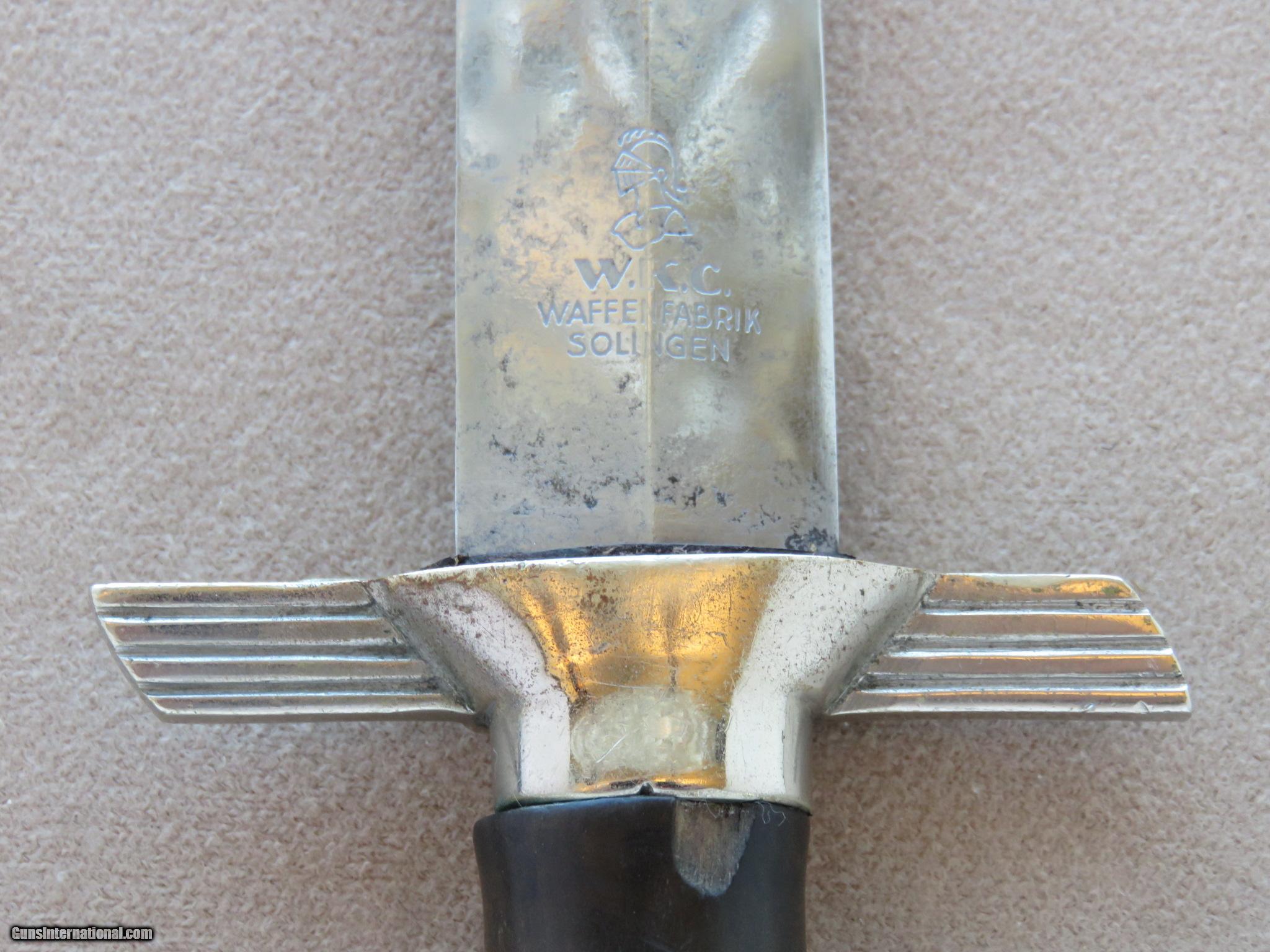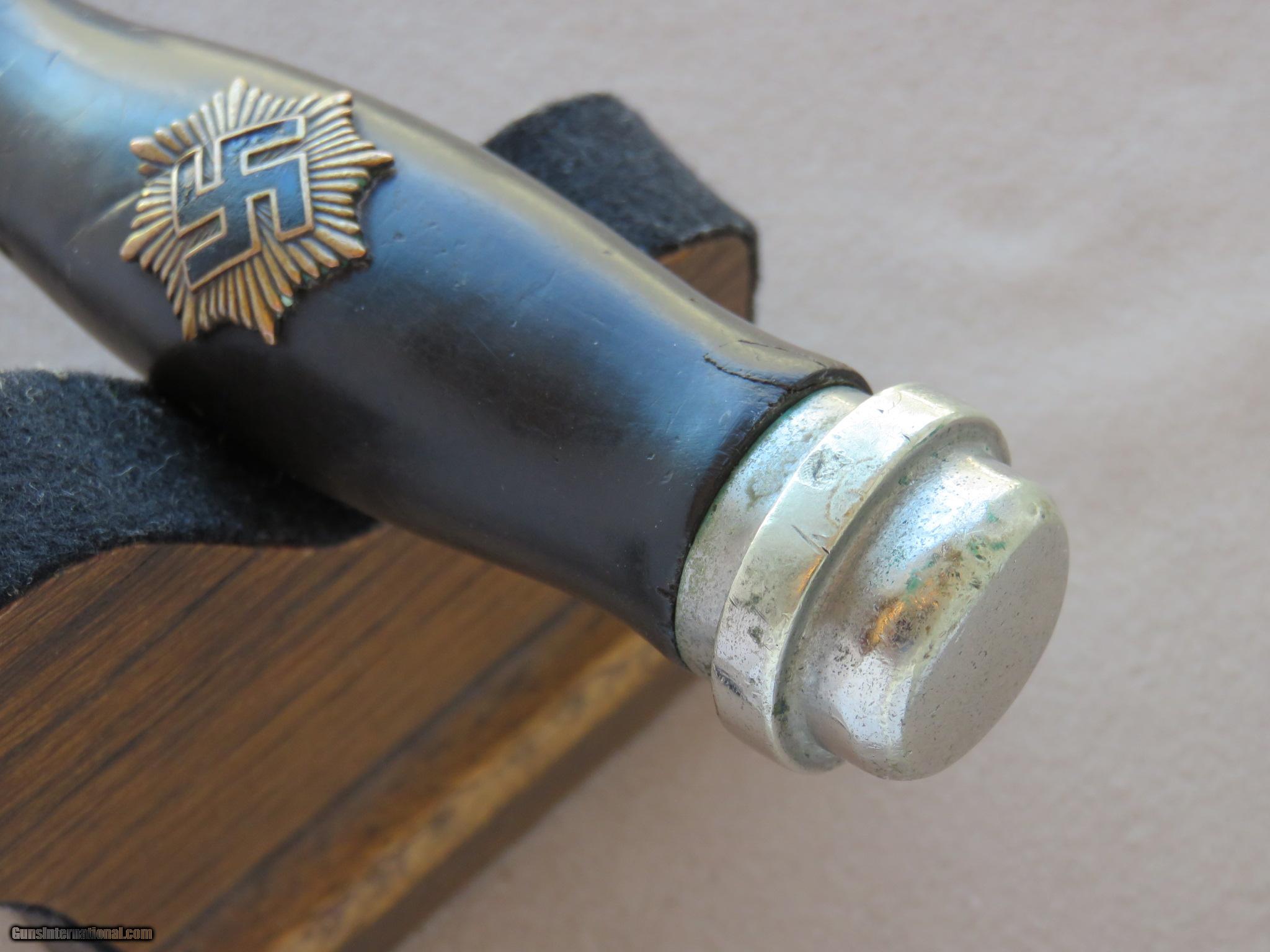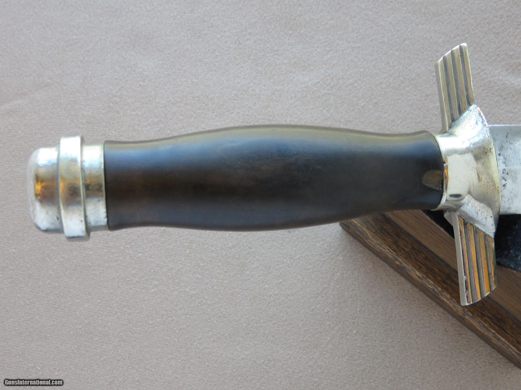 Description: A nice original RLB Dagger and scabbard made by the famous WKC Company in Solingen, Germany. This is a 2nd Model Dagger with the swastika over the sunburst on the ebony wood grip. It is complete with the original scabbard. The RLB or Reichsluftschutzbund, was the official air raid protection group for the state, established by Air Minister Hermann Goring in 1935. They were responsible for training the German population for civil defense. In 1936, enlisted members were issued this dagger. PRICE: $2,250 We are Antique & Modern Firearms in Lexington, KY, dealer of fine firearms since 1974. PH. 859-276-1419 We Buy, Sell and Trade Firearms & Knives. Have a Individual Firearm, Firearms Collection, or Firearms Estate to sell, let us know, we can buy or consignment sell it for you. (sales at am-firearms) SOLD |
