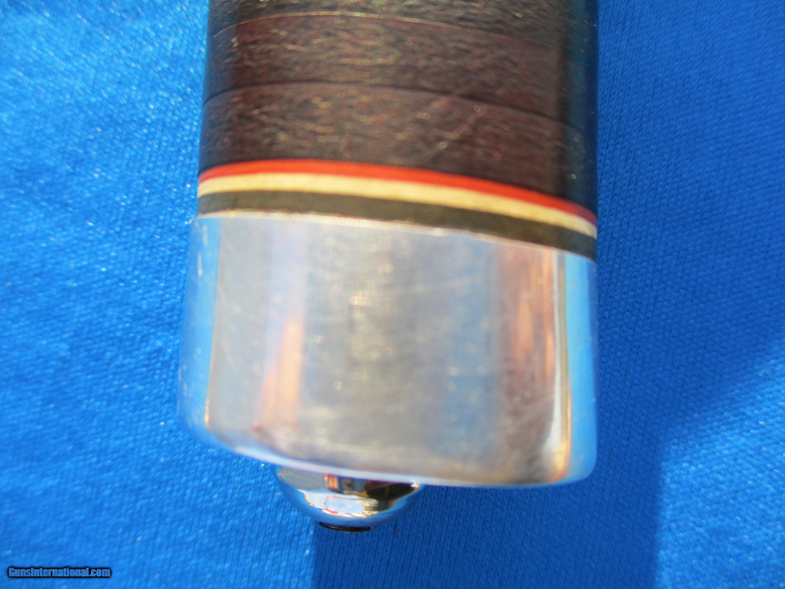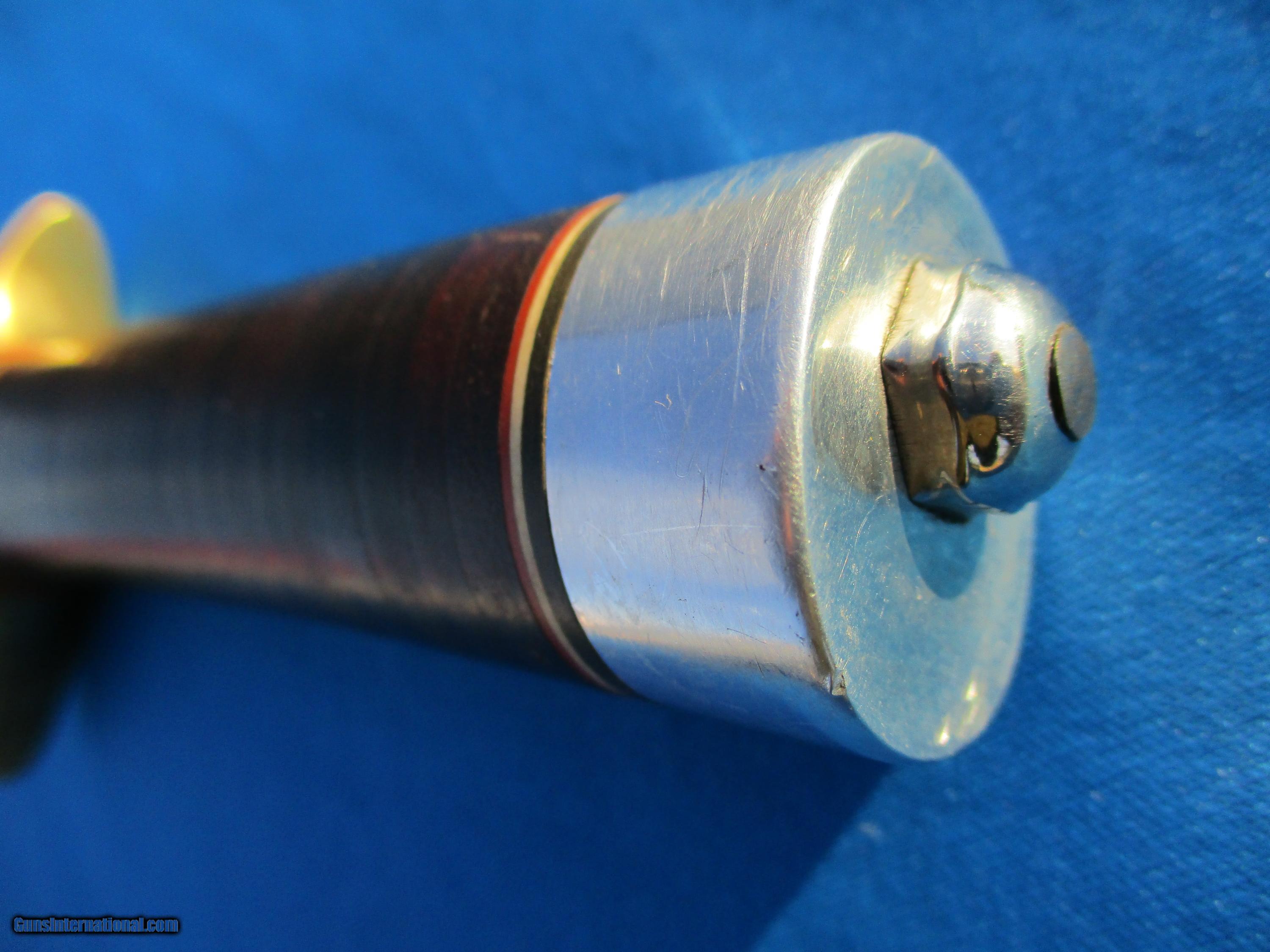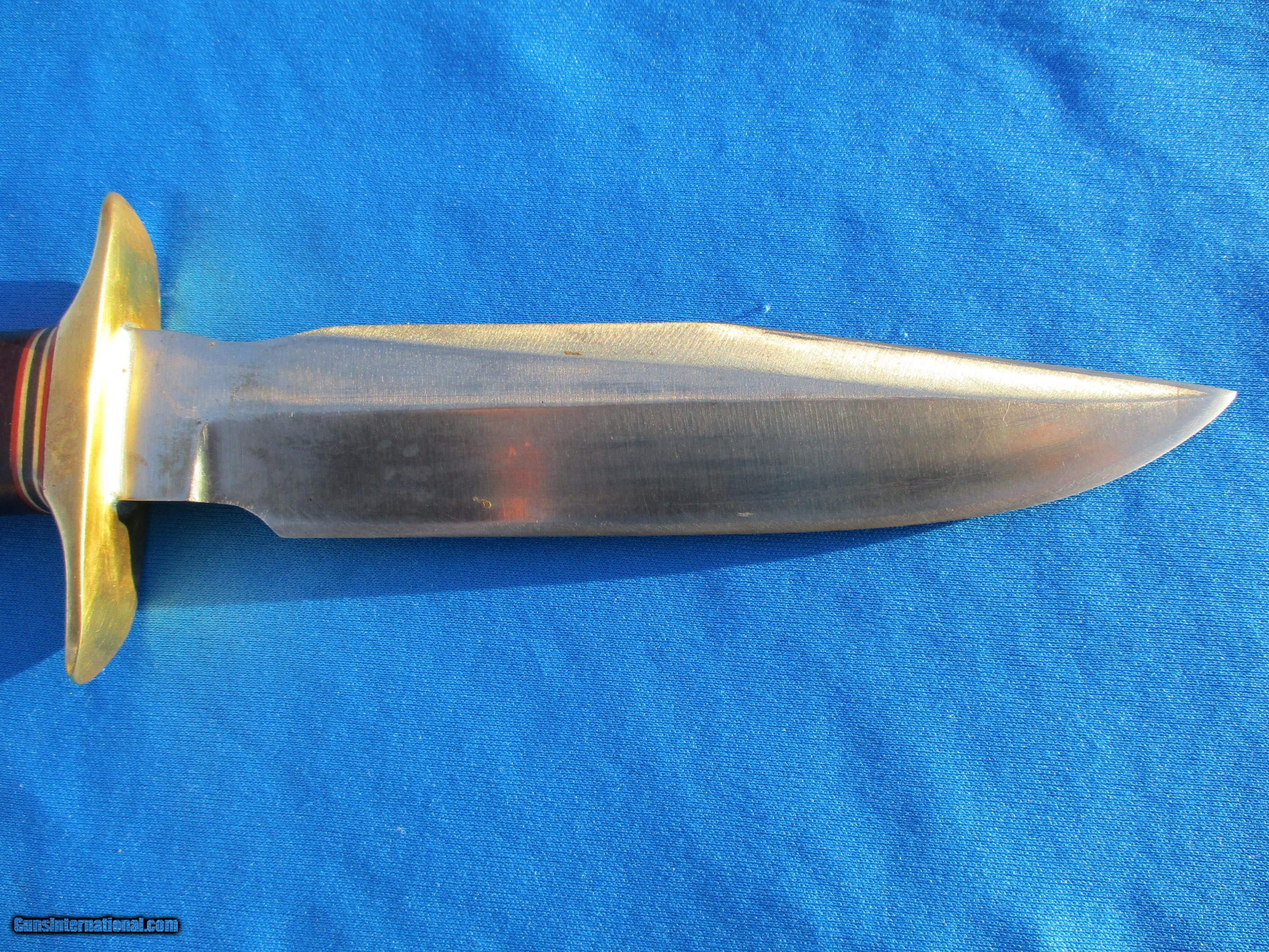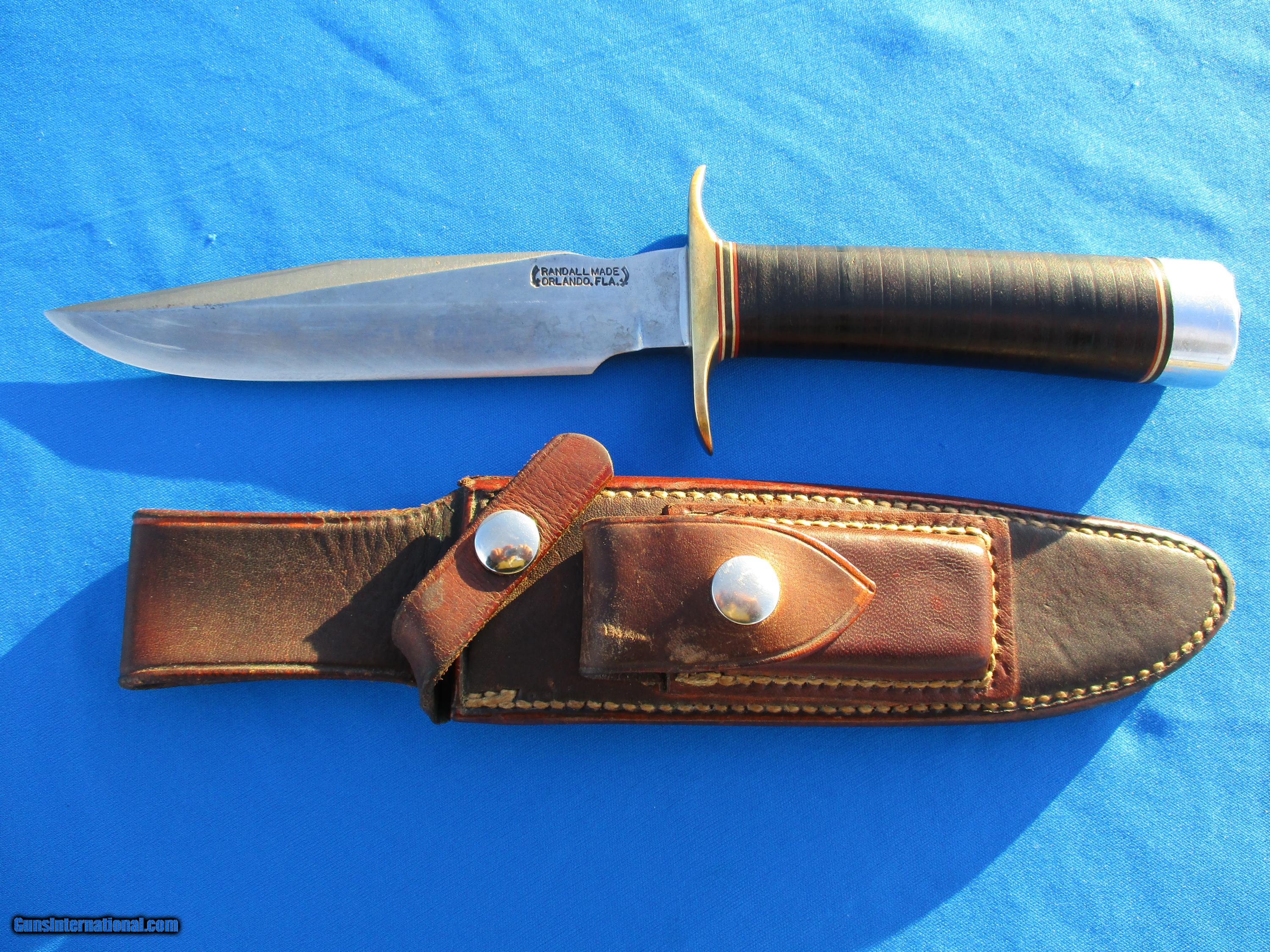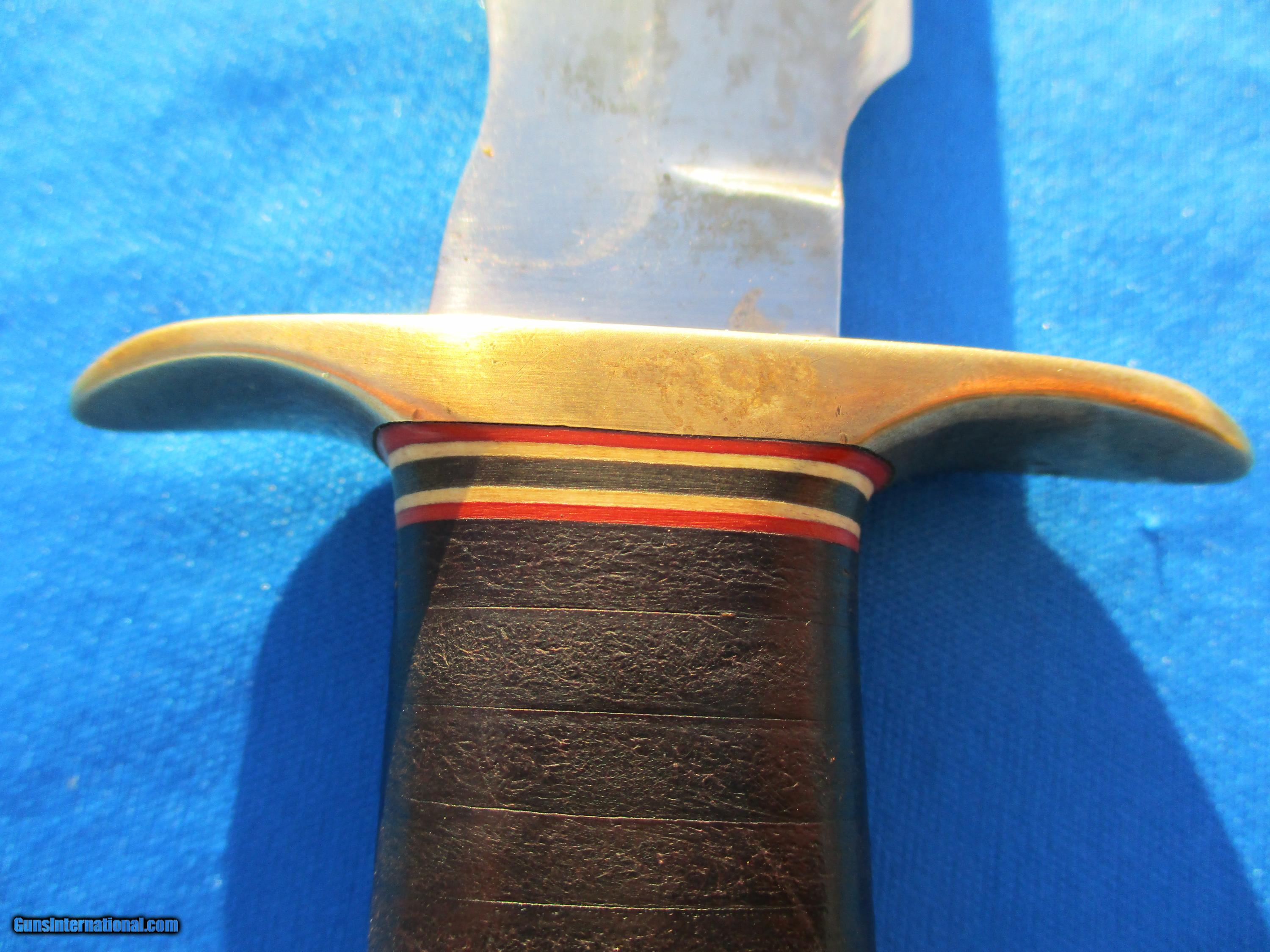 Description: Randall Model 1-6 Fighting Knife with its original Johnson Roughback sheath. The Model 1 remains in great shape, blade is razor sharp with no nicks or damage. Stacked leather handle with red, white and blue spacers remains in tight excellent condition. Sheath is in good condition, soft and pliable. Snaps and buttons are in great shape. Salmon stone in great shape, probably a later replacement. USPS Priority mail is 12.00 SOLD |