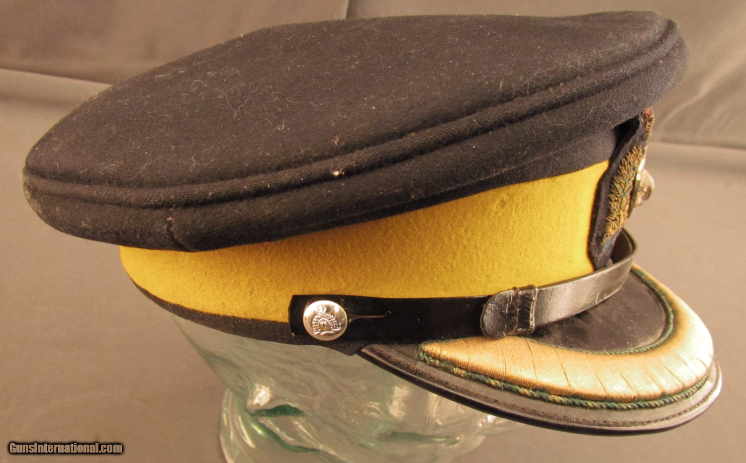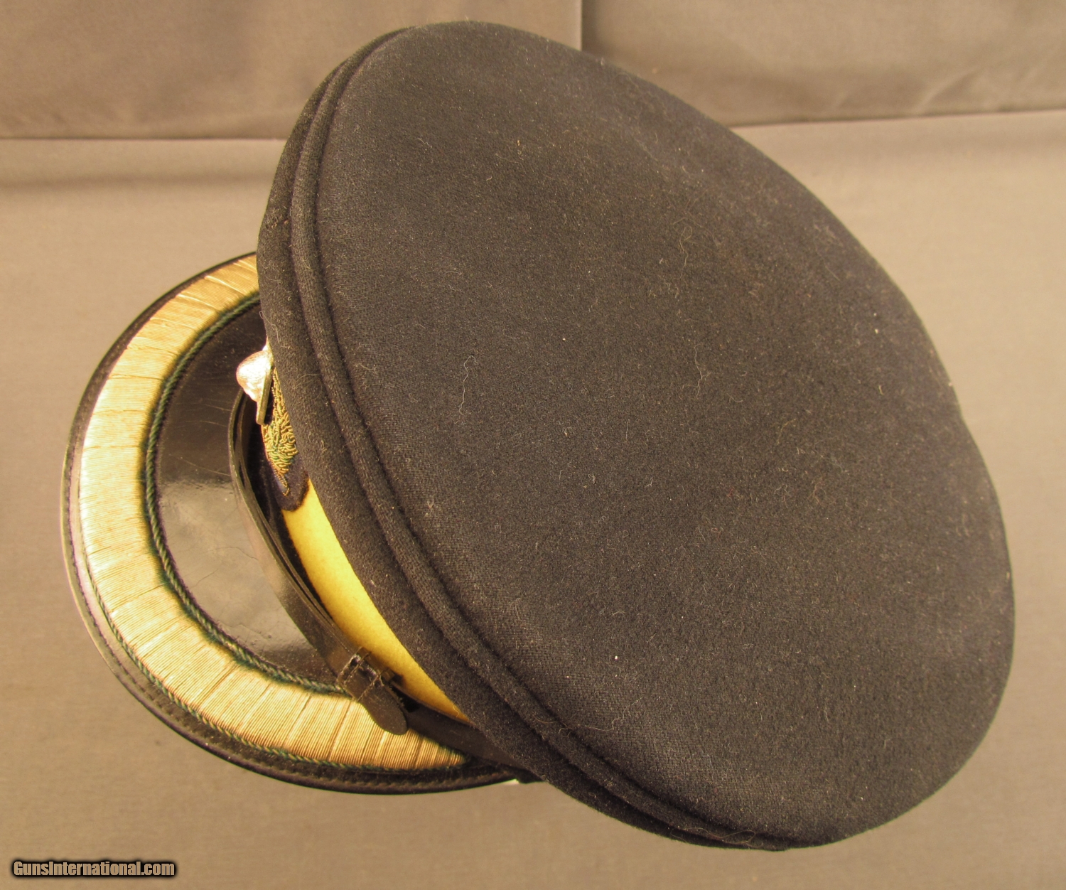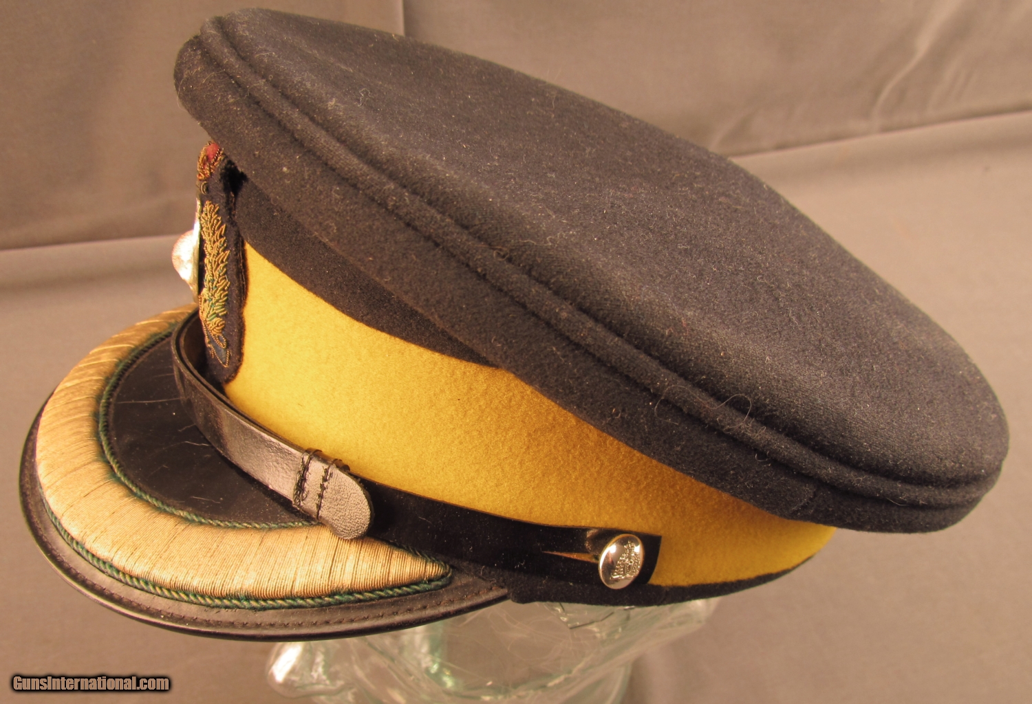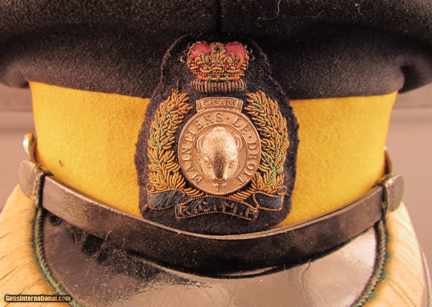 Description: This is a London-made peaked cap with yellow heavy felt band, navy blue felt crown and emroidered bullion R.C.M.P. badge at the front. The black patent leather peak, with embroidered wire edge trim, and chinstrap are only slightly crazed and are otherwise in excellent shape, as are the brass side buttons. The interior of the cap has a thin brown leather comfort band (with embossed maker's label on the left side: “BATE'S/Hatter/21 Jermyn Street/St. James's/LONDON”), discolored transparent sweat shield, sewn-in paper BATE'S label, and a previous owner's handwritten name tape: “E. HERZOG”. This is a high quality, and authentic R.C.M.P. uniform item, in fine condition, that would make a wonderful addition to any collection. SOLD Manufacturer: RCMP Model: Hat |