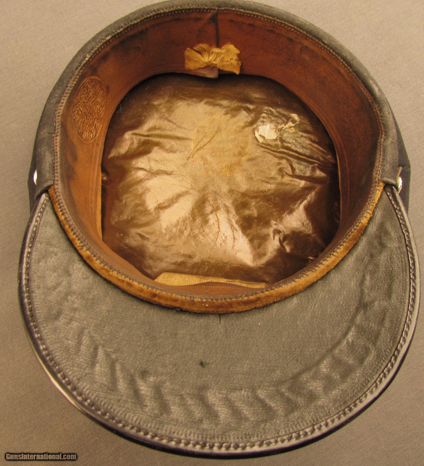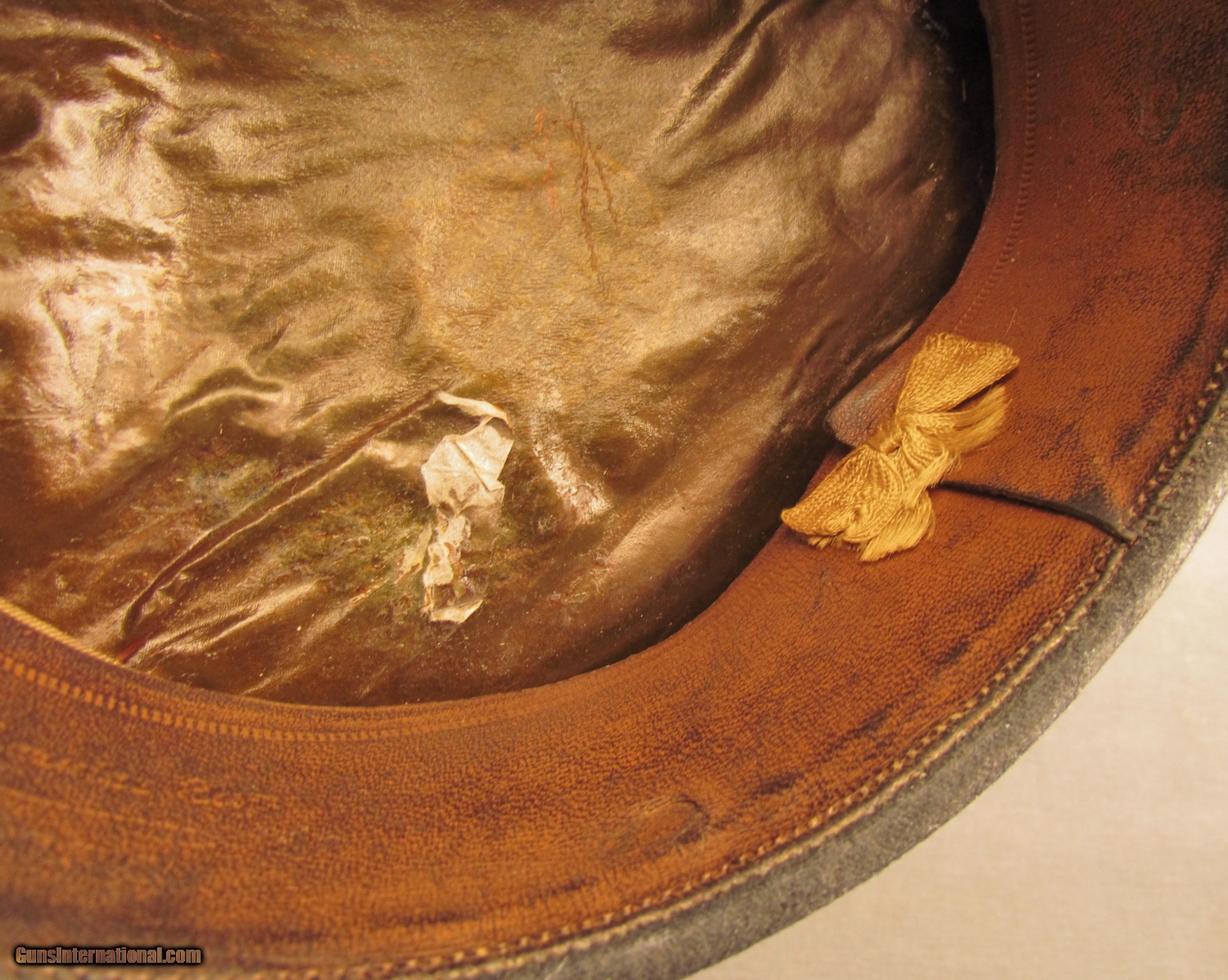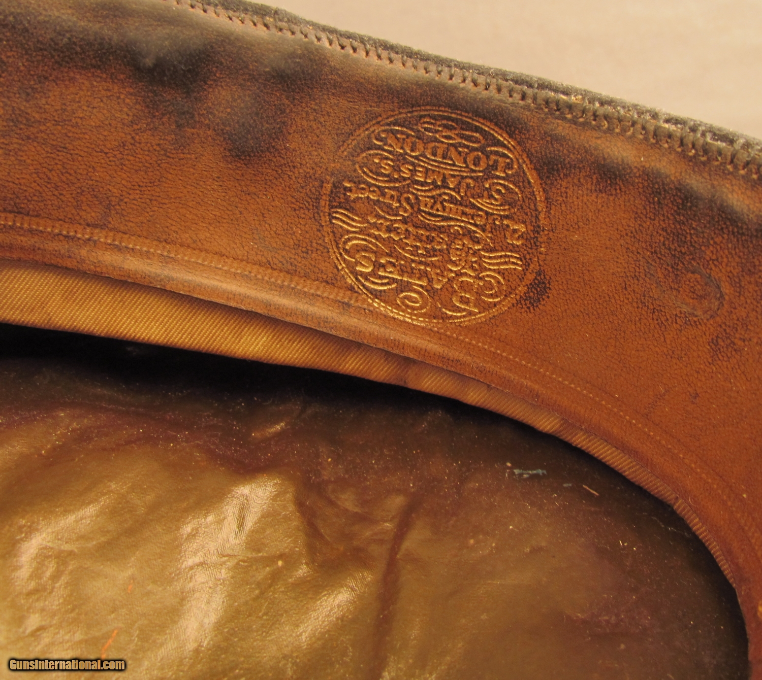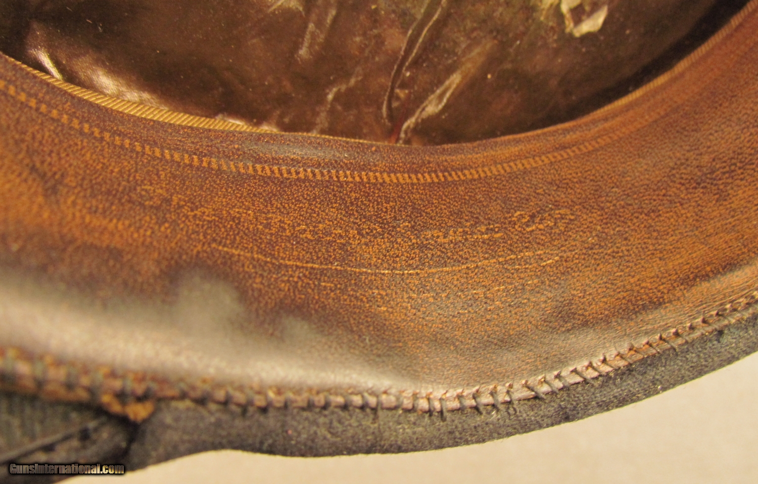 Description: This is a London-made peaked cap with yellow heavy felt band, navy blue felt crown and emroidered bullion R.C.M.P. badge at the front. The black patent leather peak, with embroidered wire edge trim, and chinstrap are only slightly crazed and are otherwise in excellent shape, as are the brass side buttons. The interior of the cap has a thin brown leather comfort band (with embossed maker's label on the left side: “BATE'S/Hatter/21 Jermyn Street/St. James's/LONDON”), discolored transparent sweat shield, sewn-in paper BATE'S label, and a previous owner's handwritten name tape: “E. HERZOG”. This is a high quality, and authentic R.C.M.P. uniform item, in fine condition, that would make a wonderful addition to any collection. SOLD Manufacturer: RCMP Model: Hat |