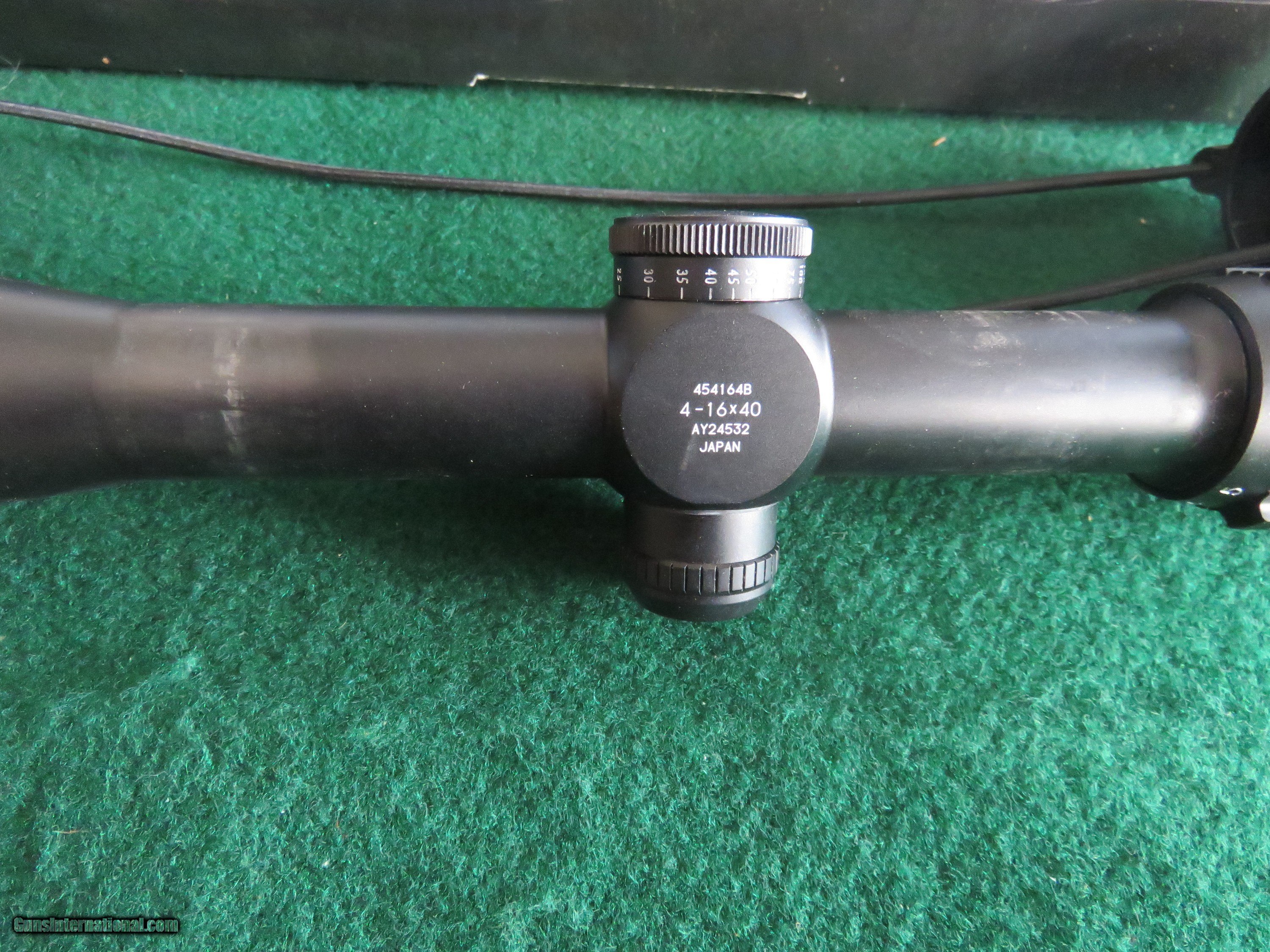 Description: Bushnell Elite 4500 4-16x40, AO with DOA 600 Reticle. In excellent condition. The glass is perfect. $325.00, Shipping $20.00. SOLD |