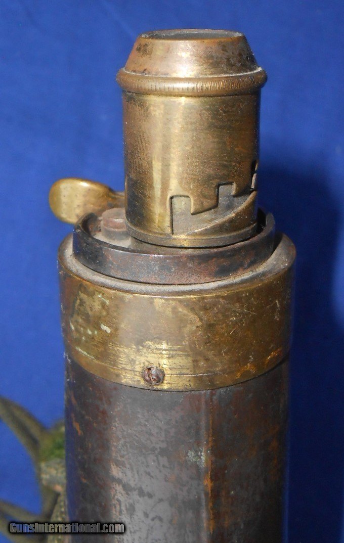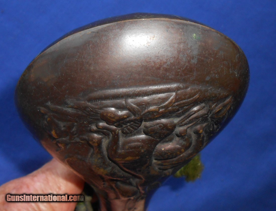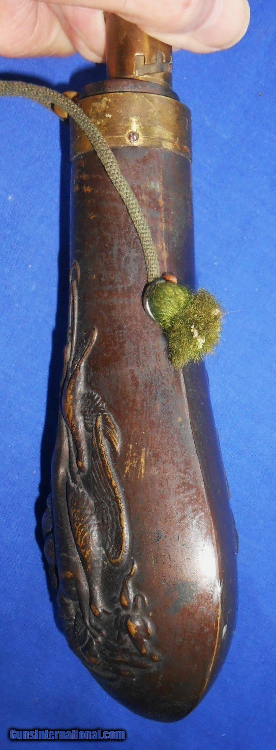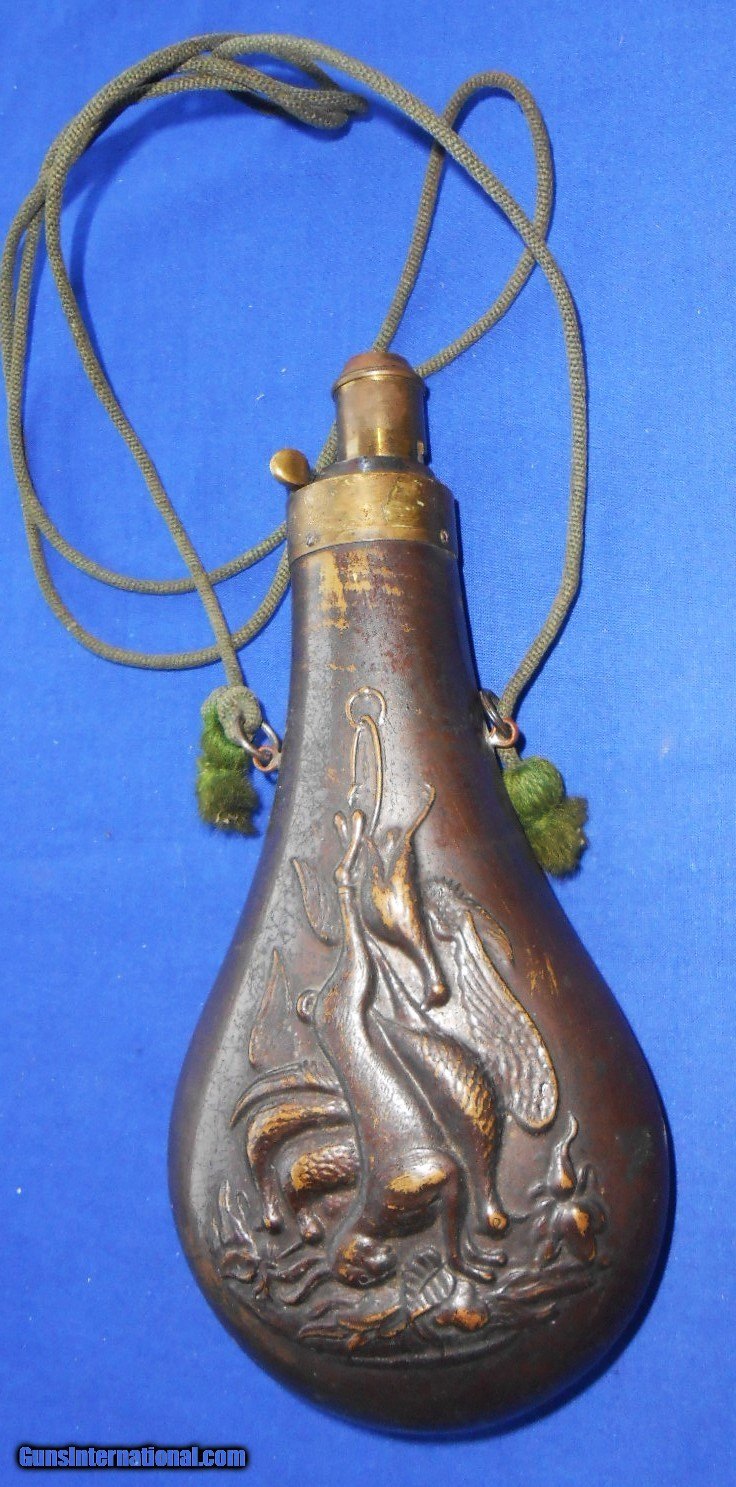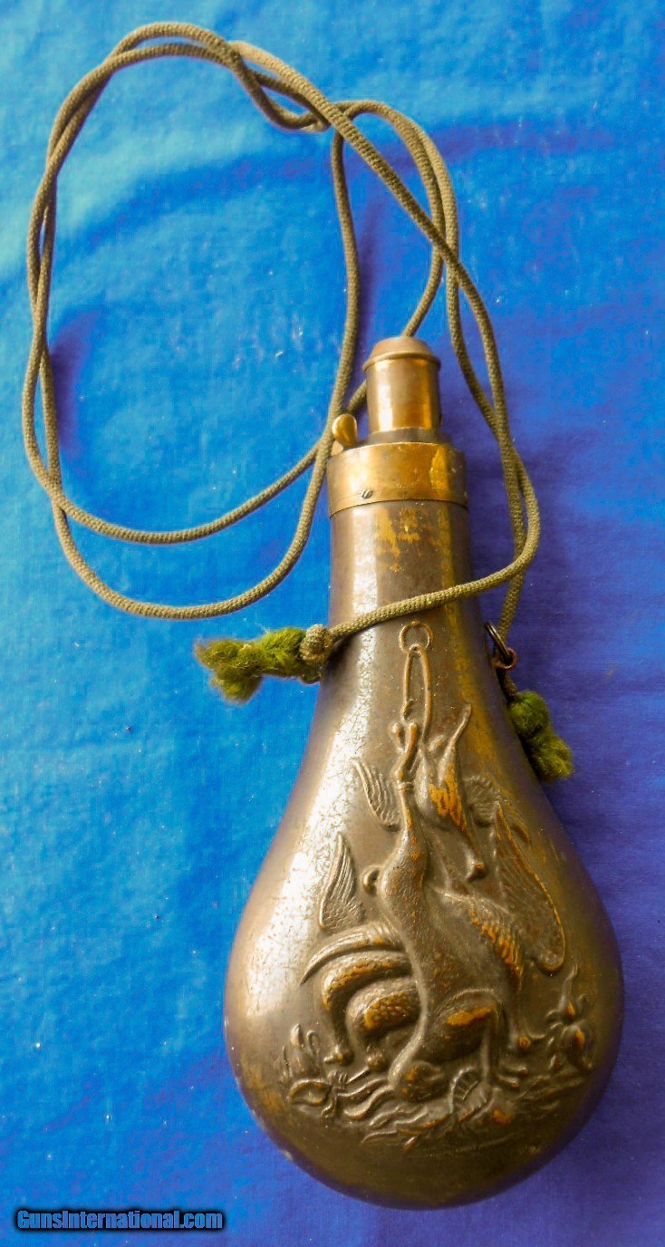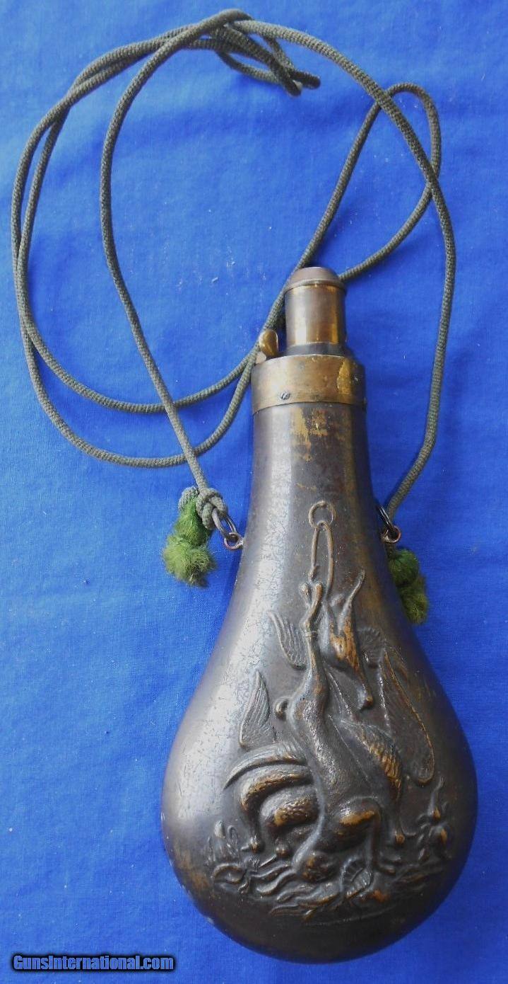 Description: ANTIQUE CIVIL WAR ERA UNMARKED POWDER FLASK BY "AMERICAN FLASK & CAP COMPANY" IT IS IN RAY RILING BOOK # 619 "DEAD GAME" IT STILL HAS MOST OF THE ORIGINAL LAQUER FINISH THAT HAS TAKEN ON AN AGED PATINA. THE SEAMS ARE TIGHT AND THERE ARE ONLY A COUBLE VERY TINY BUMPS THAT ARE HARDLY WORTH MENTIONING. THE CORD APPEARS TO BE A PERIOD ORIGINAL. SPRING IS CRISP AND LOADING MEASURING SPOUT WORKS FINE. A NICE OLD FLASK THAT IS COMPLETLY USEABLE. MEASURES ABOUT 7 3/4" x 3 3/4" x 2" IF PICTURED IT IS STILL AVAILABLE. $12.00 S&H DIRECT TO YOU INCLUDES $100.00 INSURANCE. SOLD |